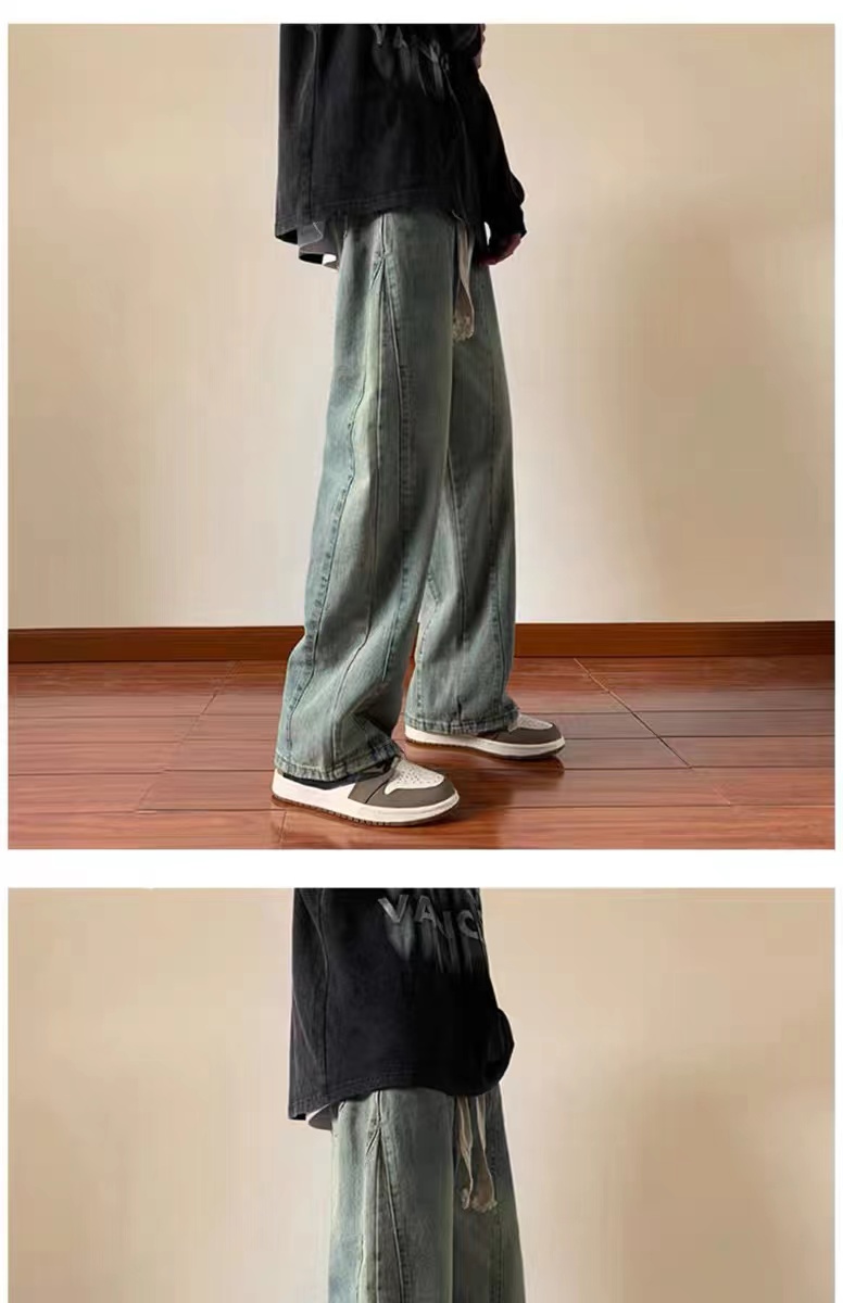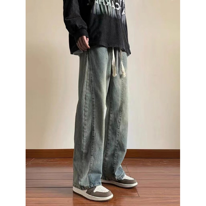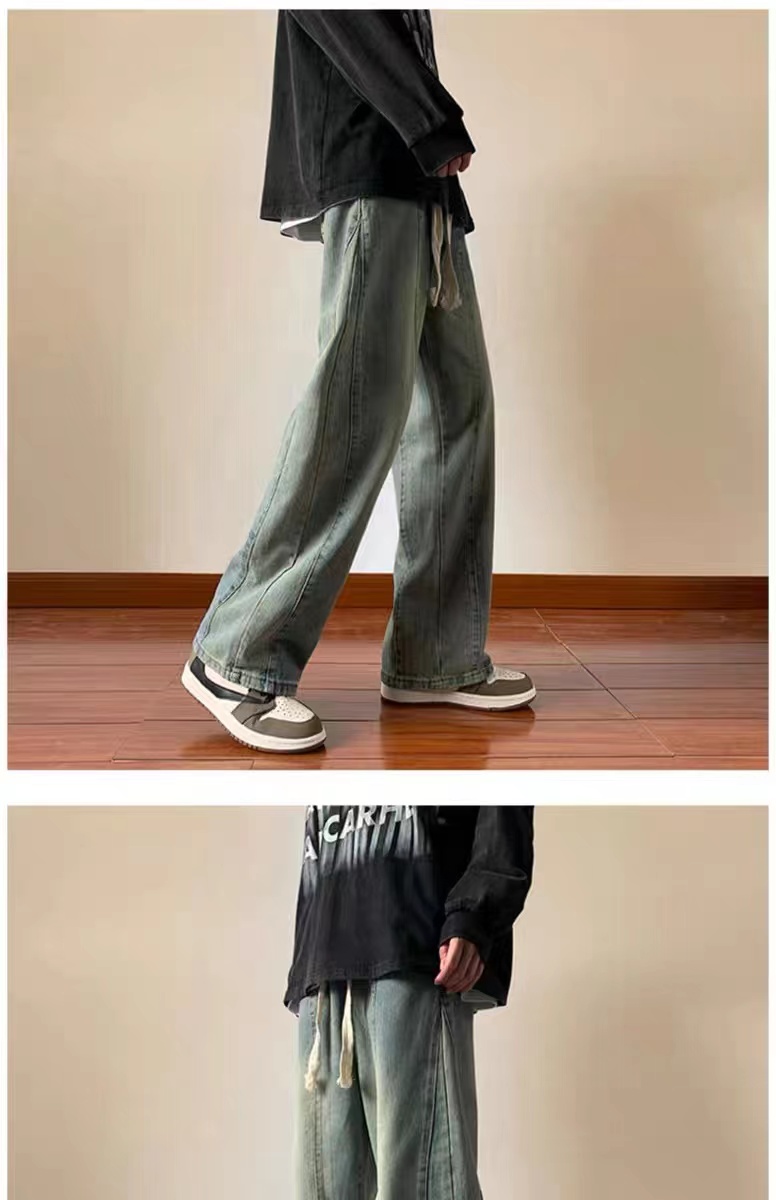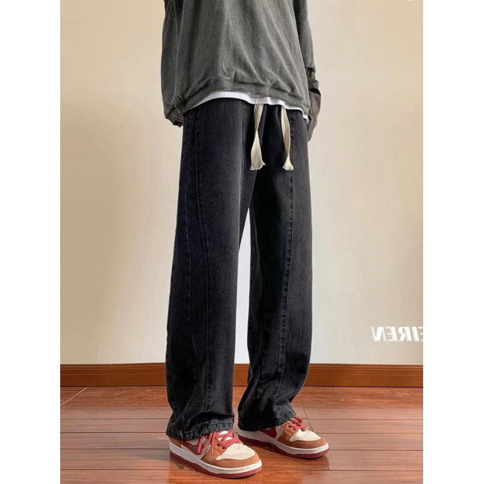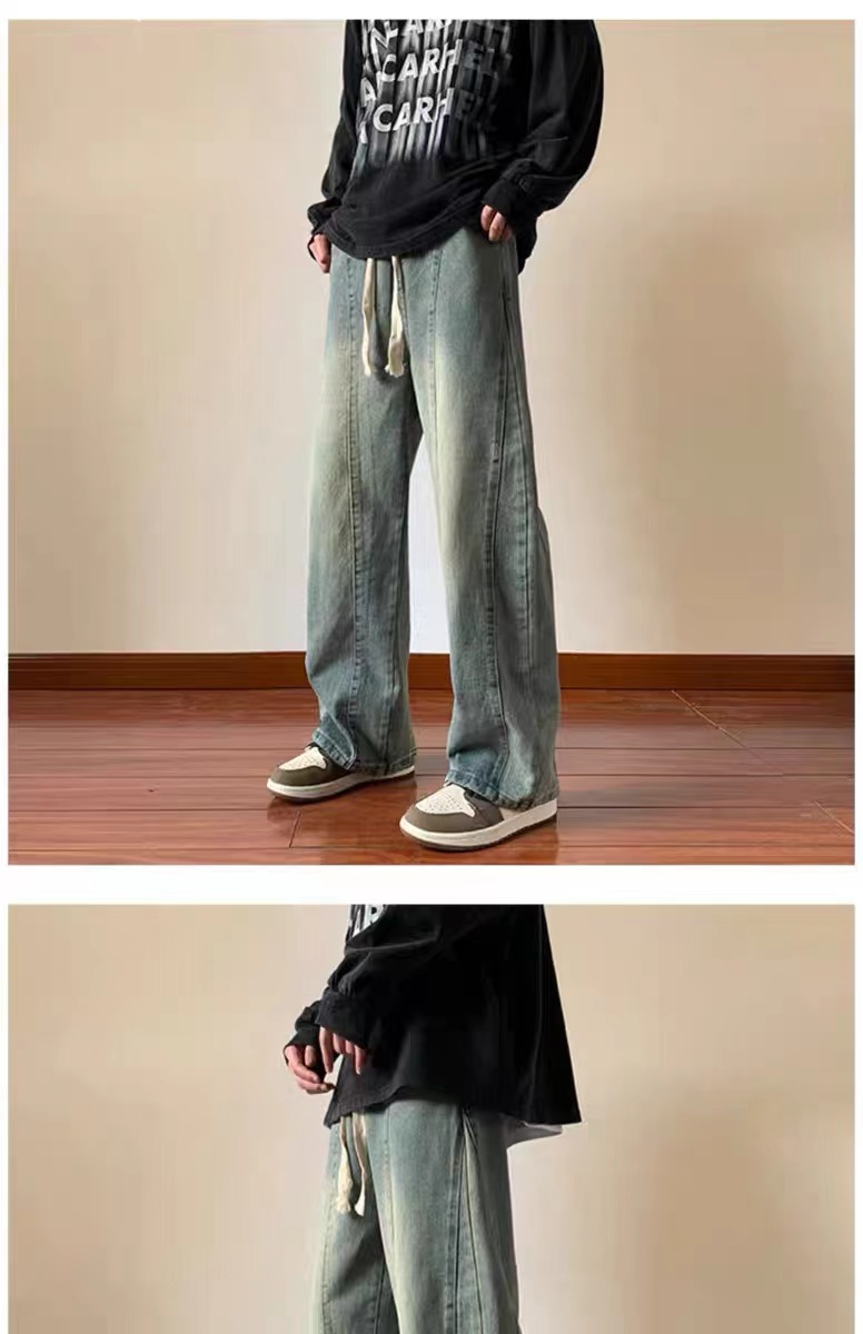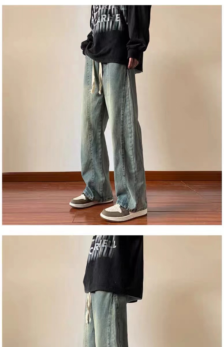 美式高街休閒褲子男松緊腰寬松抽繩百搭直筒濶腿褲秋季新款牛仔褲