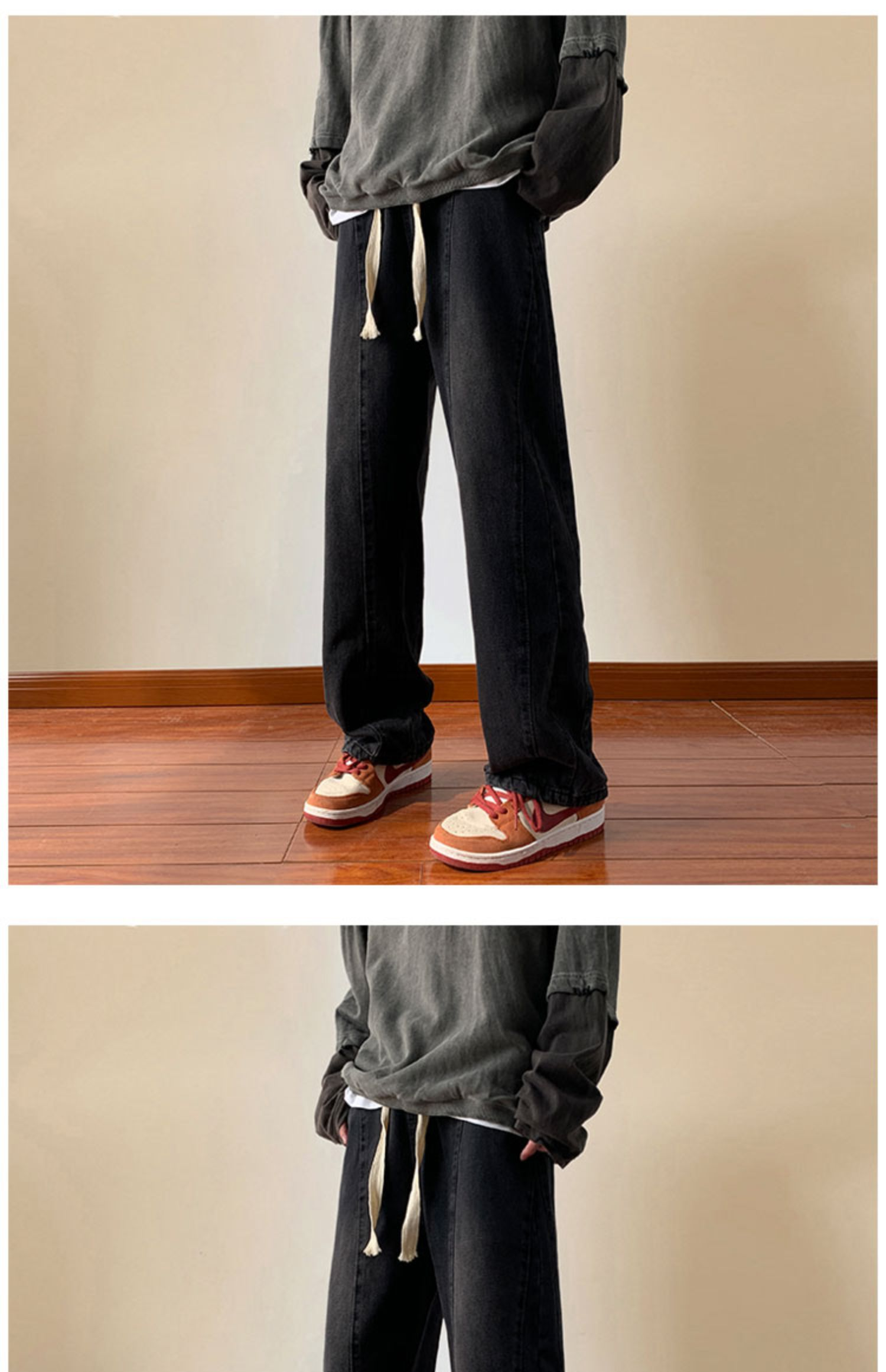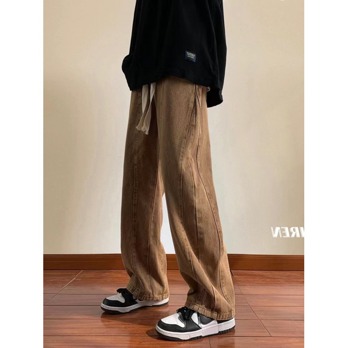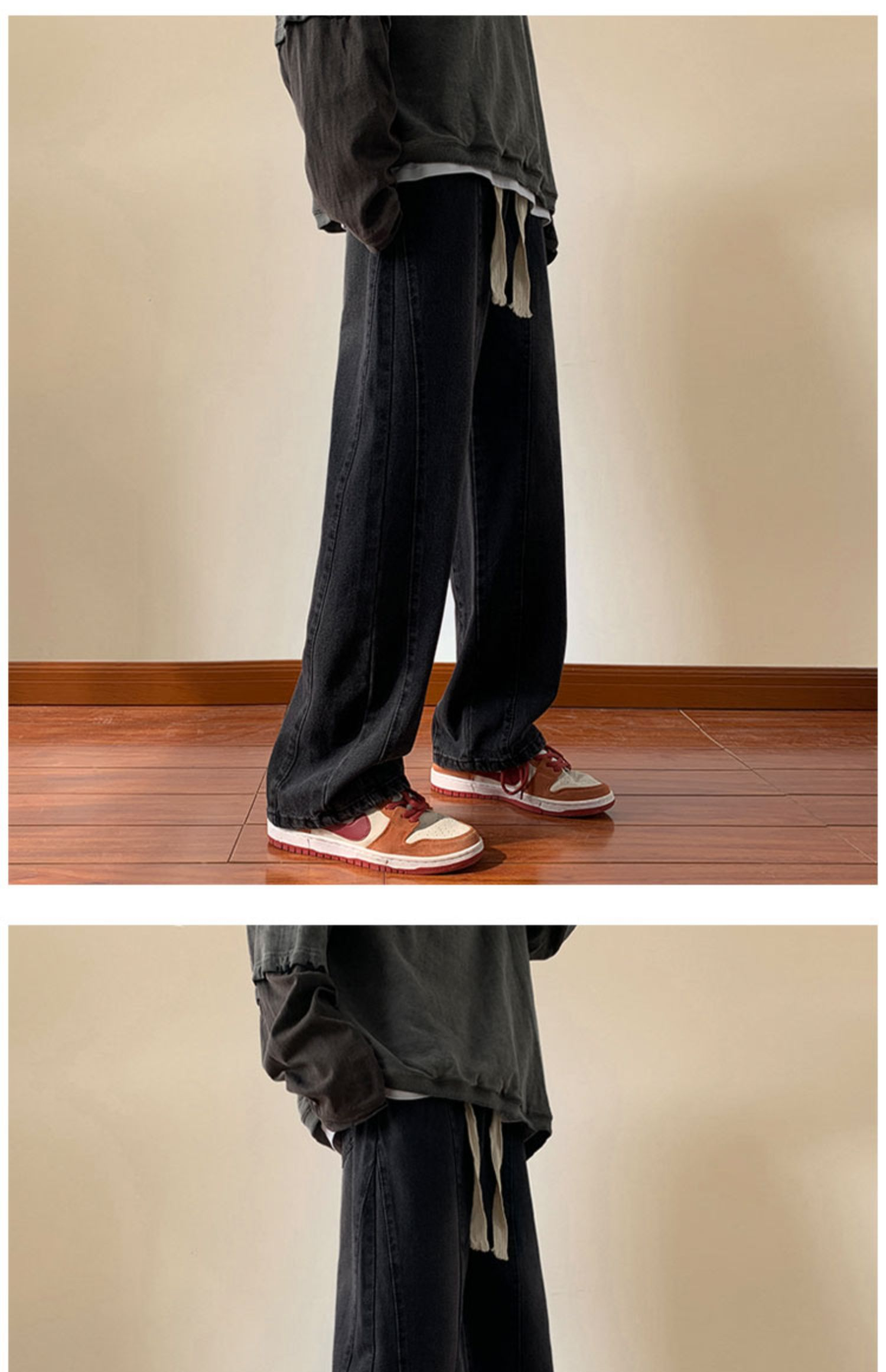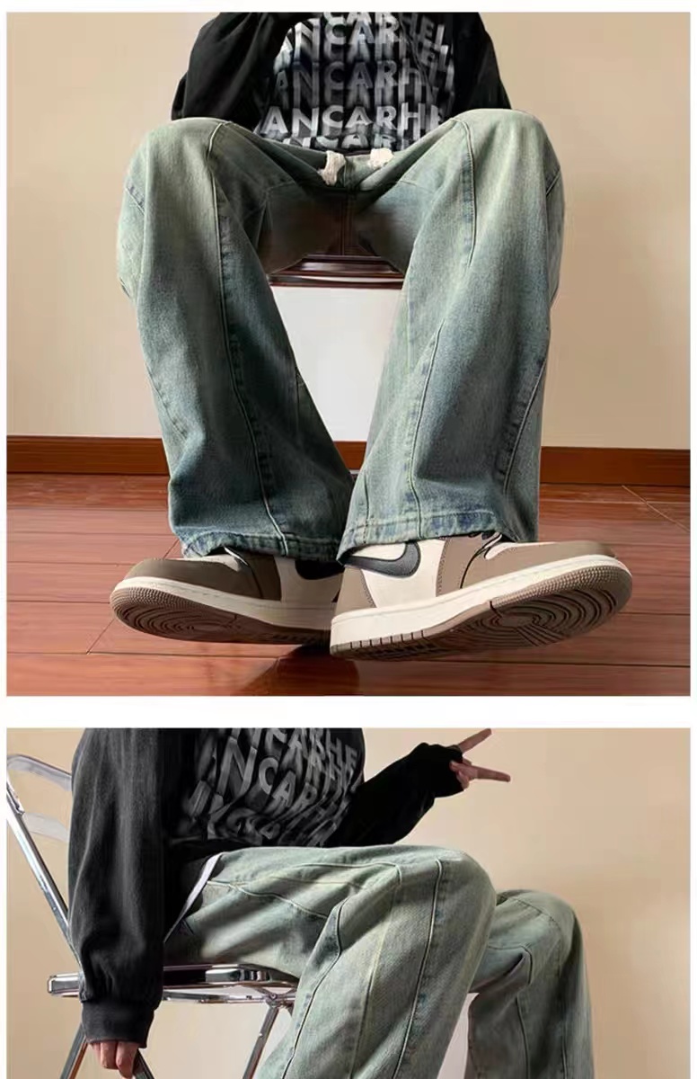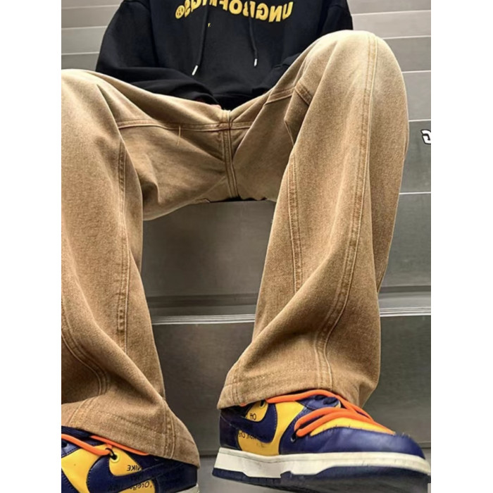 美式高街休閒褲子男松緊腰寬松抽繩百搭直筒濶腿褲秋季新款牛仔褲