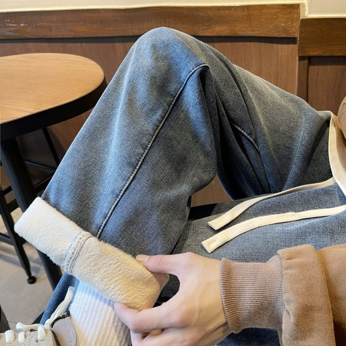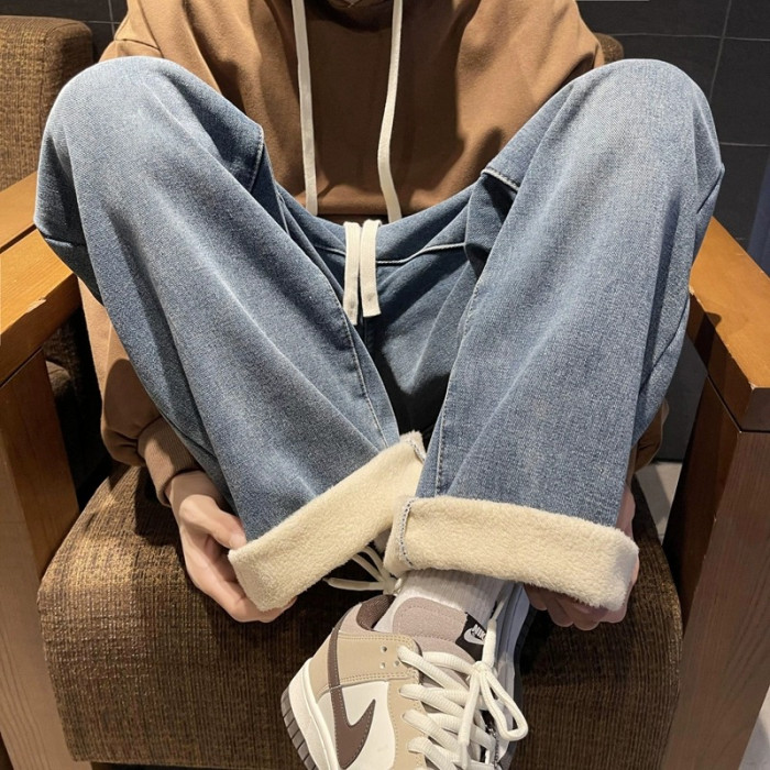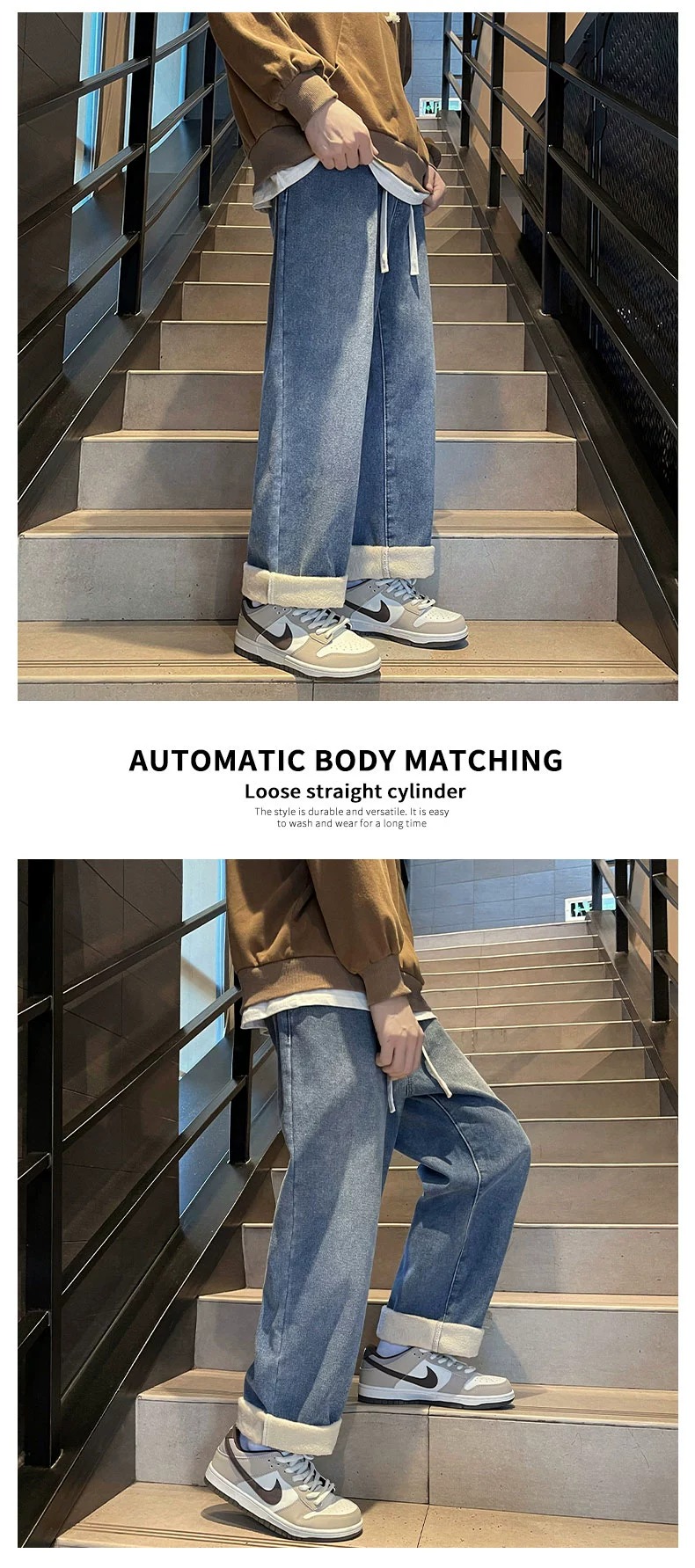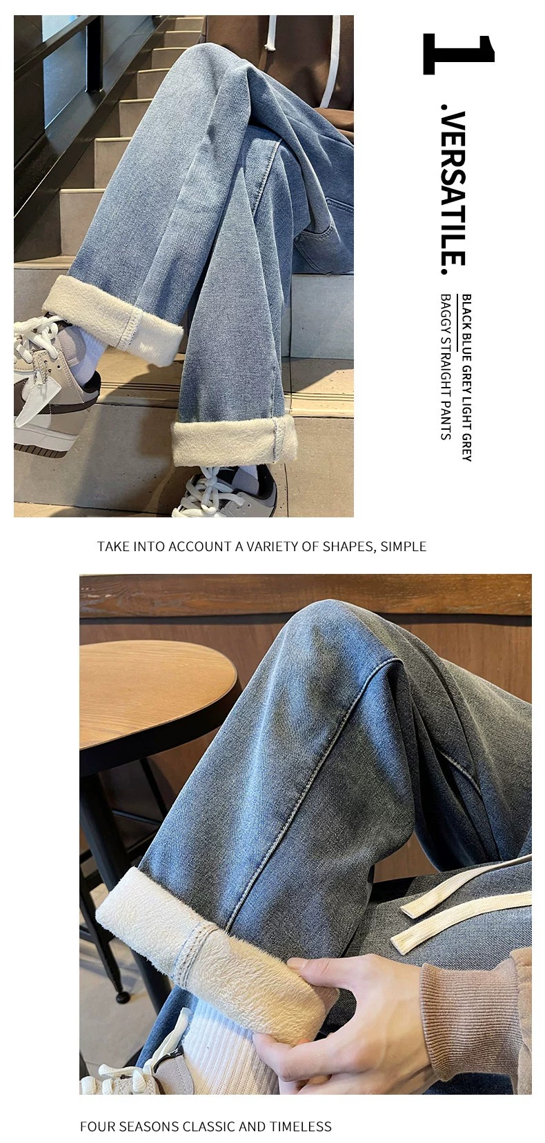 高街復古加絨加厚牛仔褲男冬季2023新款松緊腰直筒寬松保暖濶腿褲