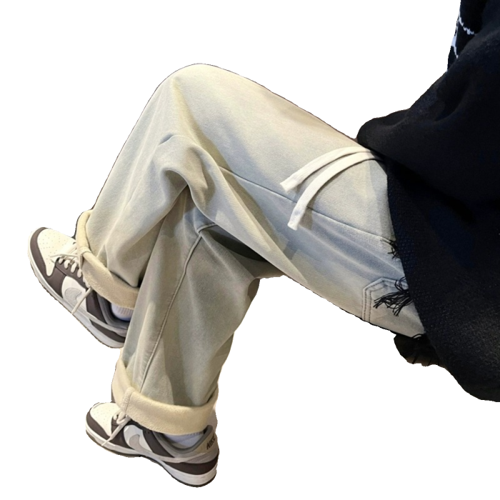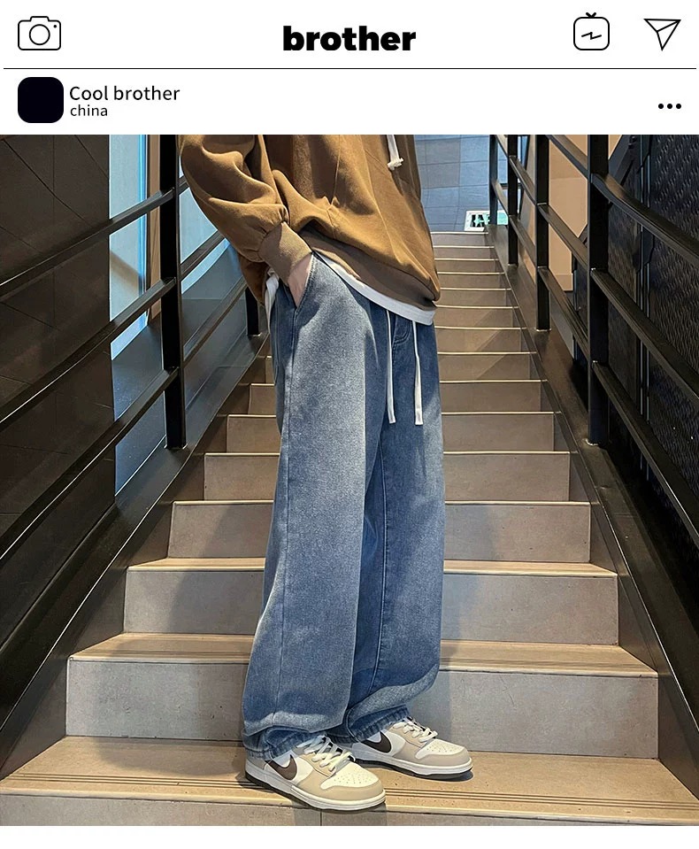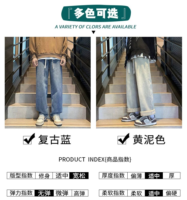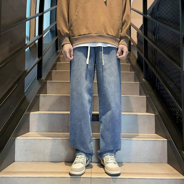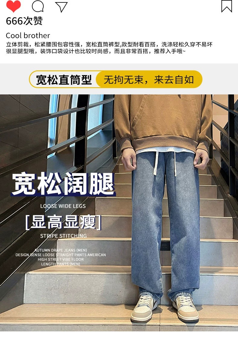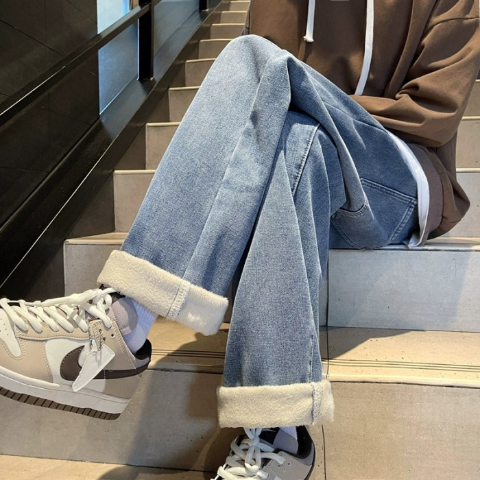 高街復古加絨加厚牛仔褲男冬季2023新款松緊腰直筒寬松保暖濶腿褲