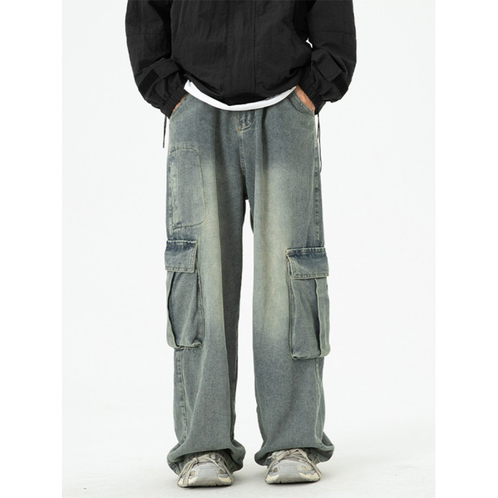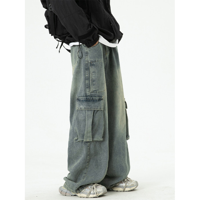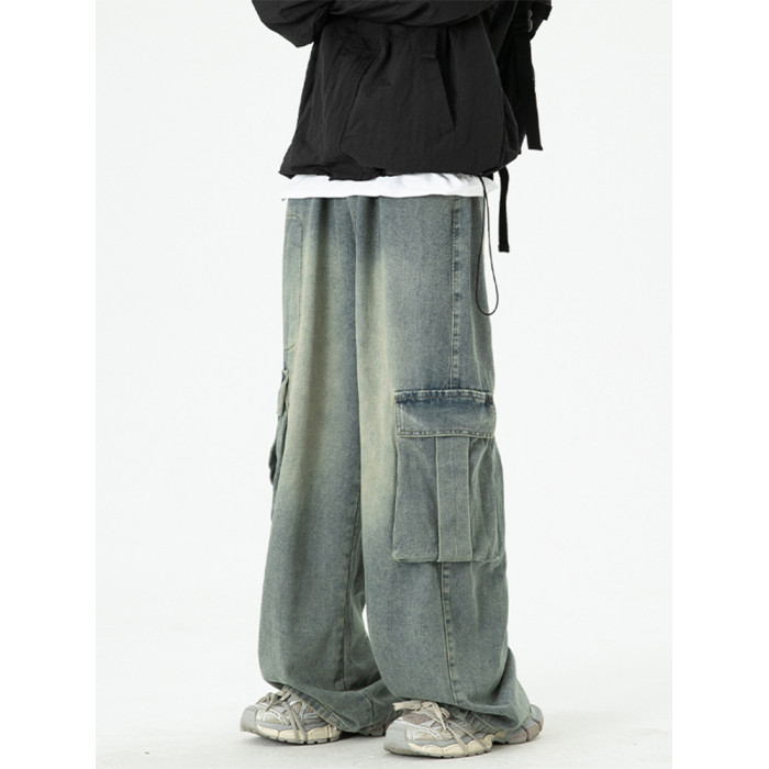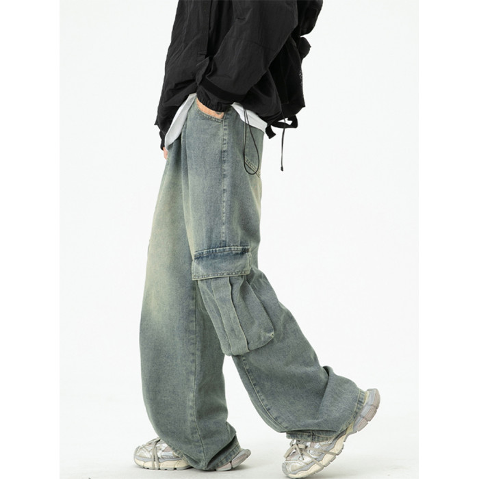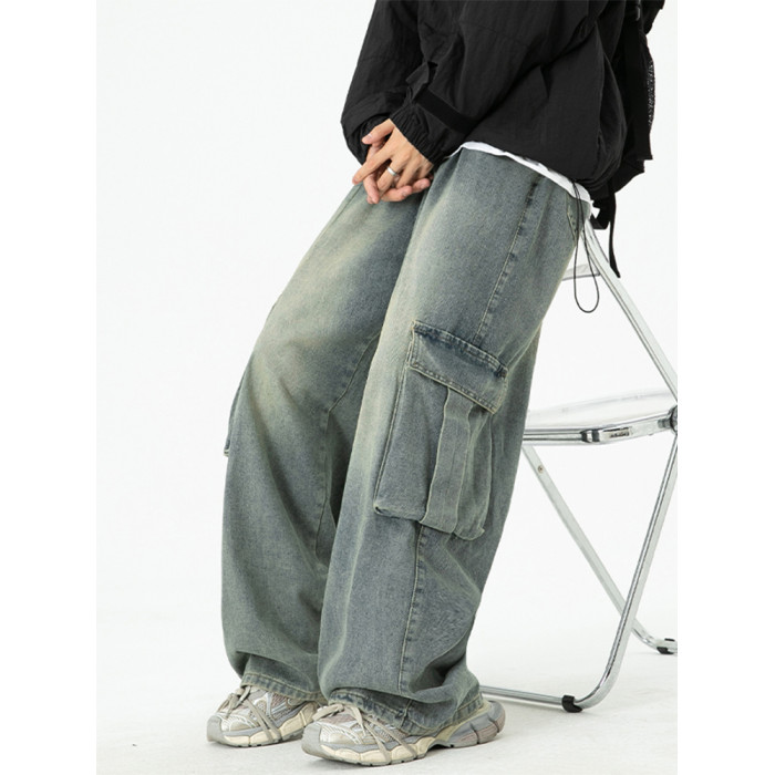 濶腿工裝牛仔褲男款美式潮牌大口袋寬松褲子水洗復古高街拖地長褲