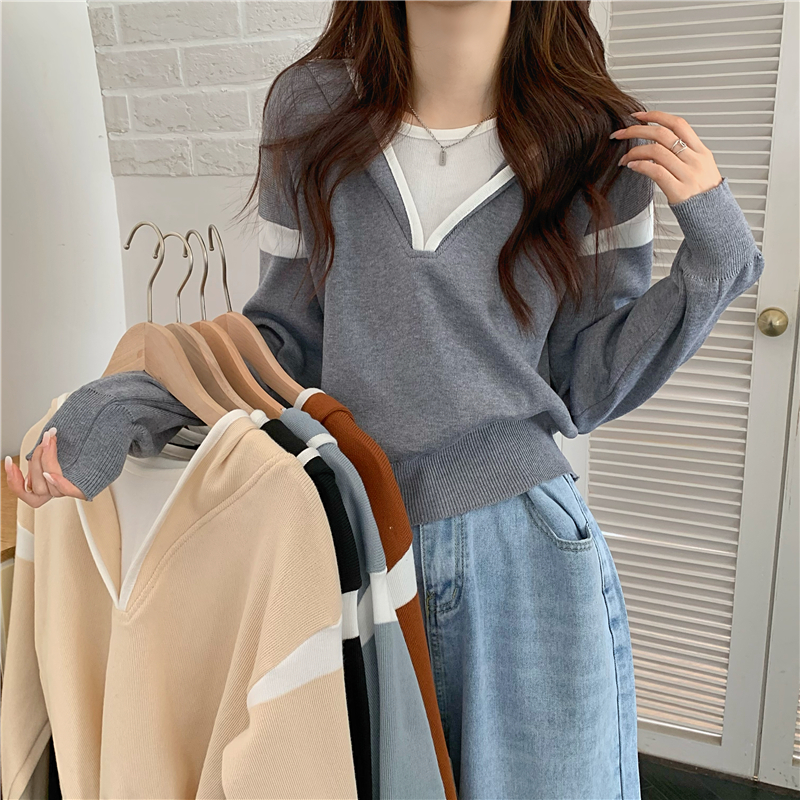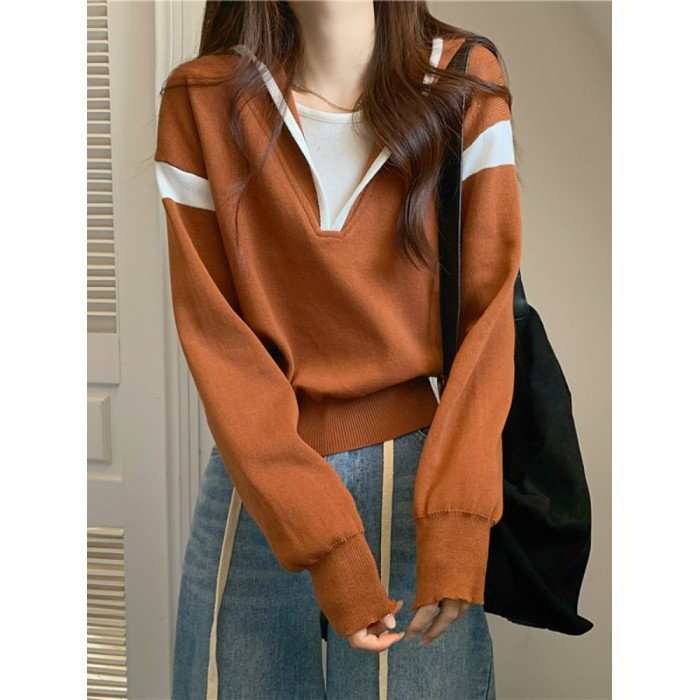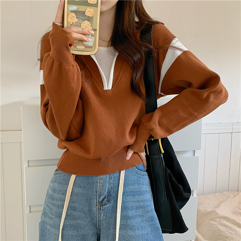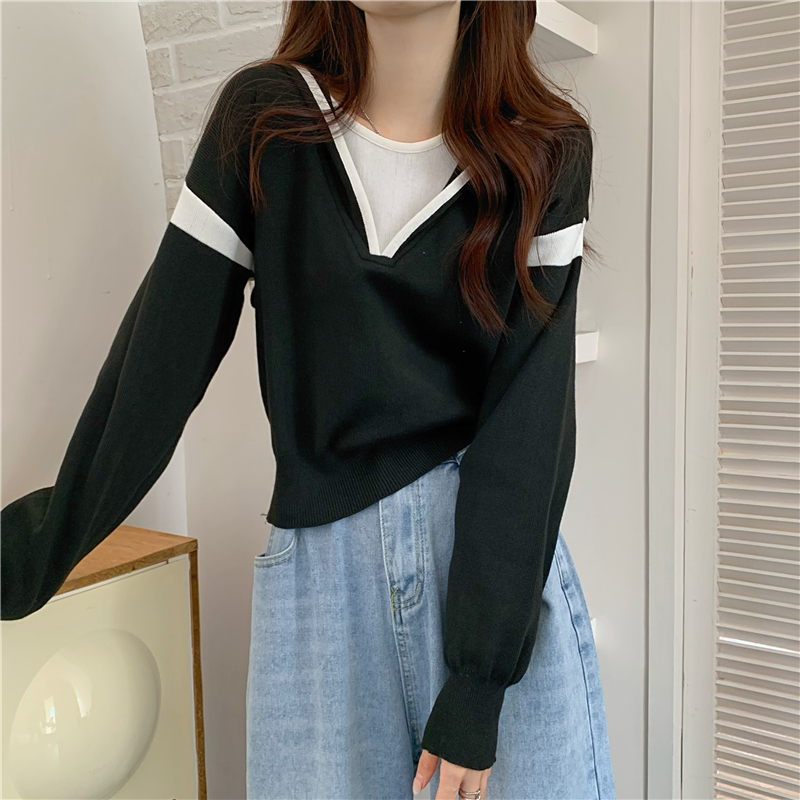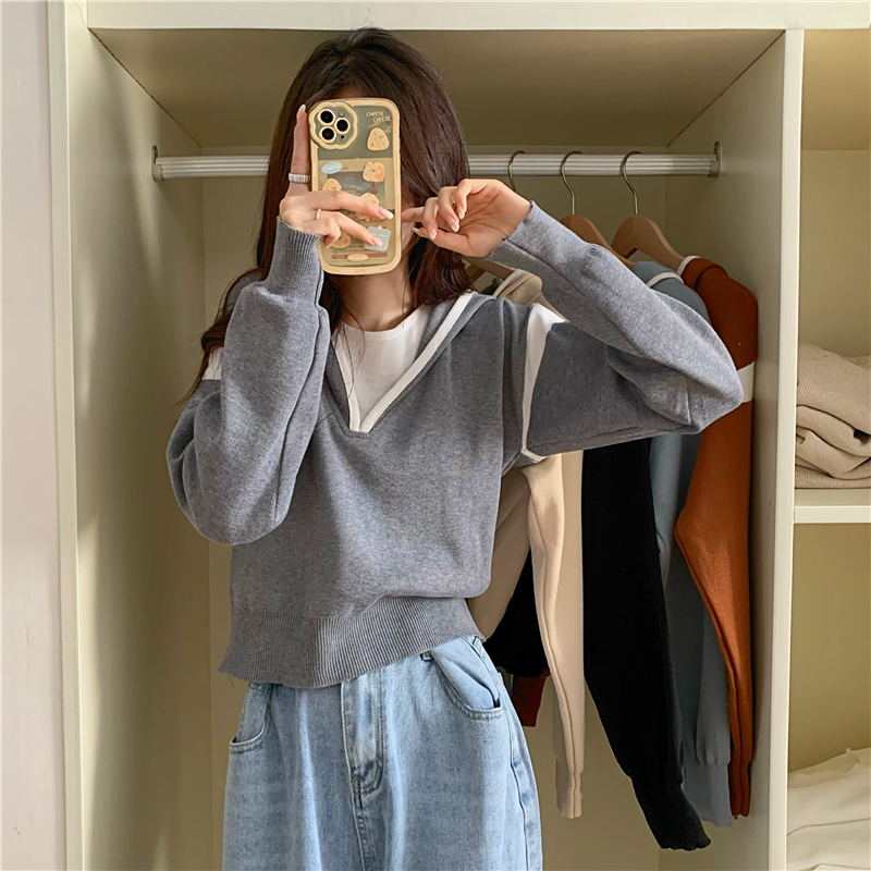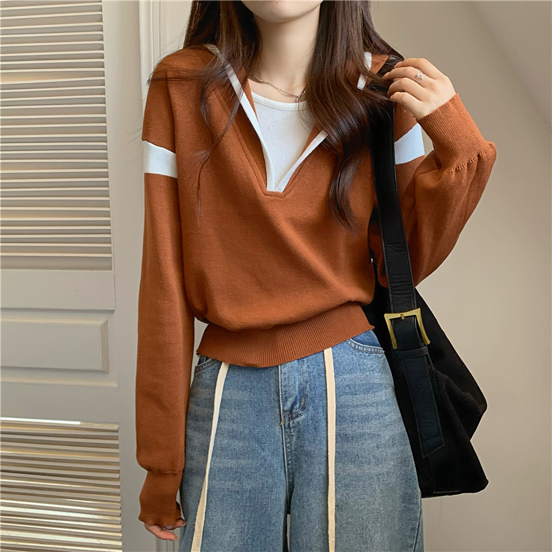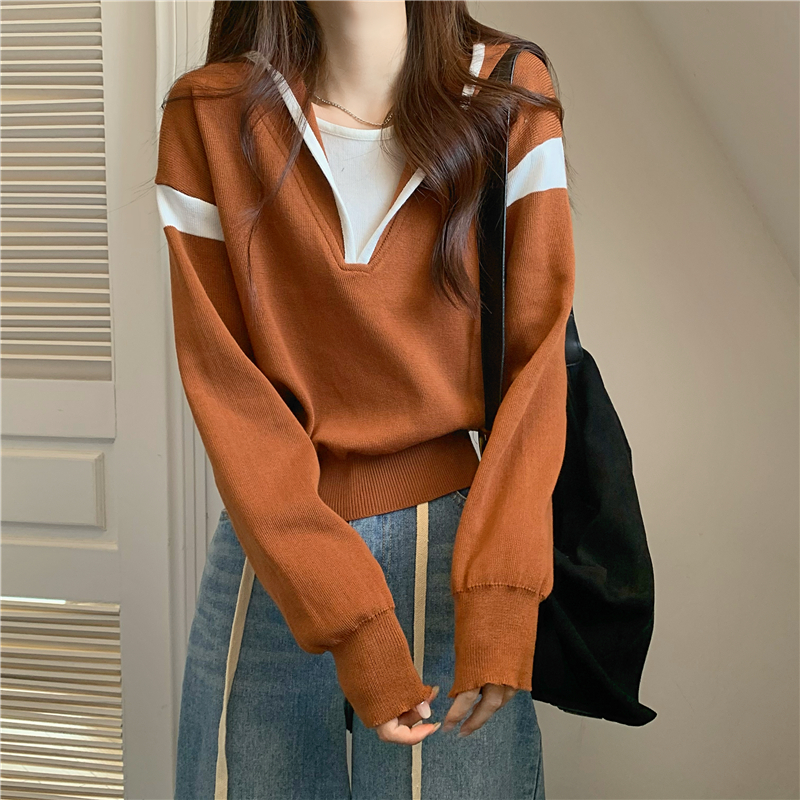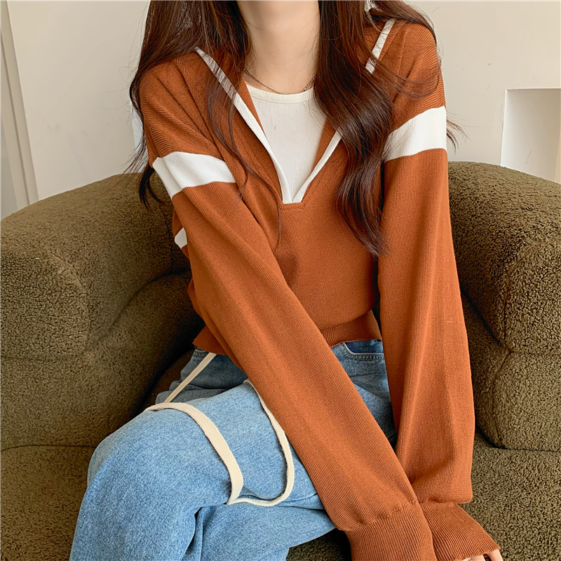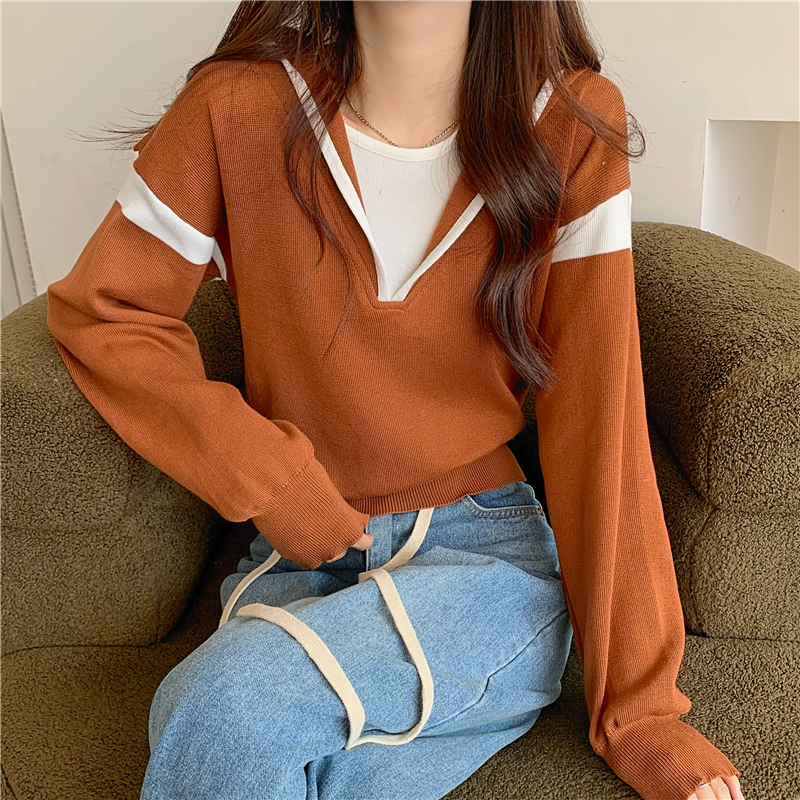 假兩件南瓜橘色長袖上衣女春秋義烏打底內搭歐貨衛衣T恤配工裝褲