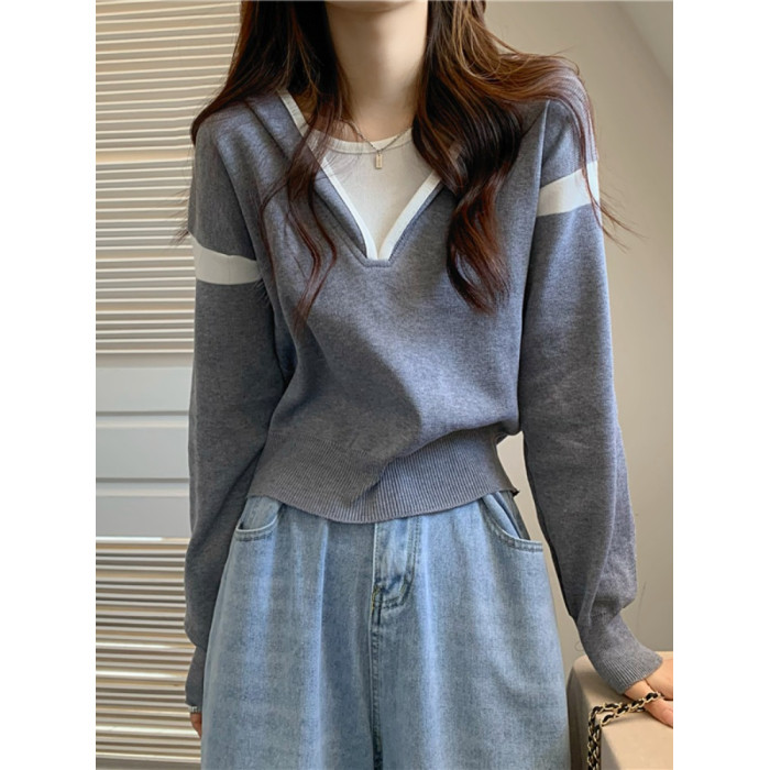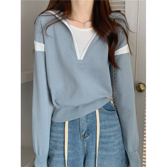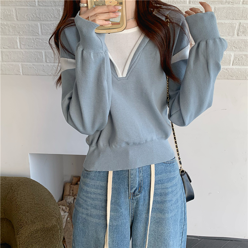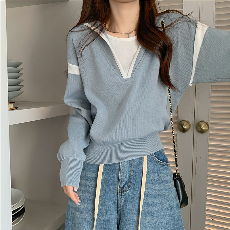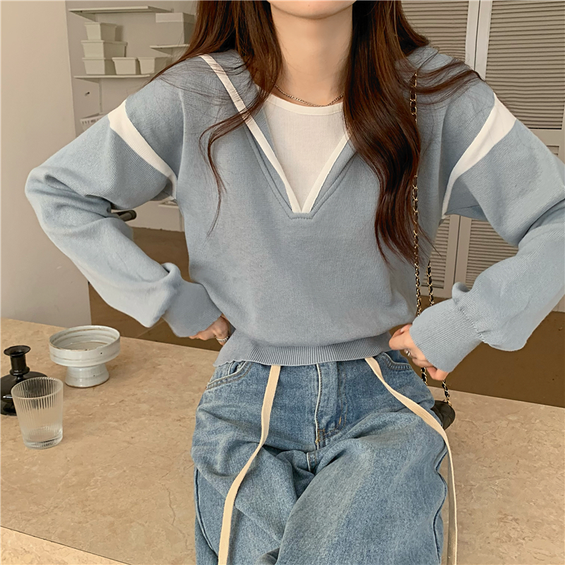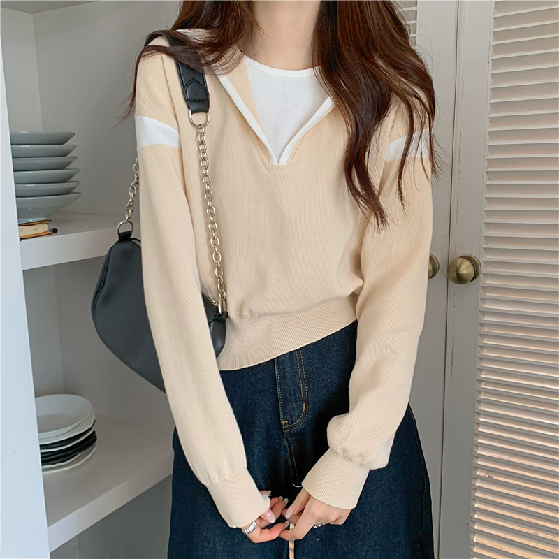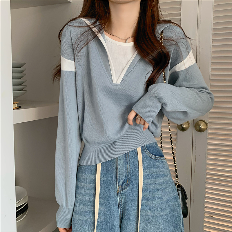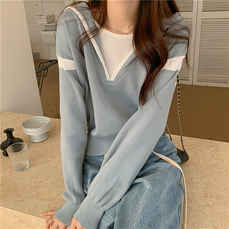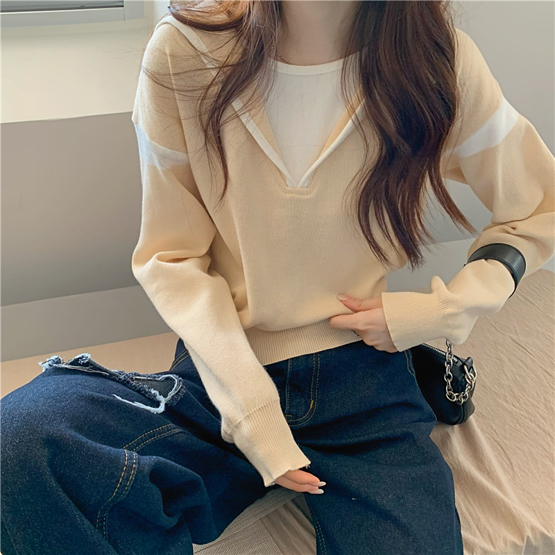 假兩件南瓜橘色長袖上衣女春秋義烏打底內搭歐貨衛衣T恤配工裝褲