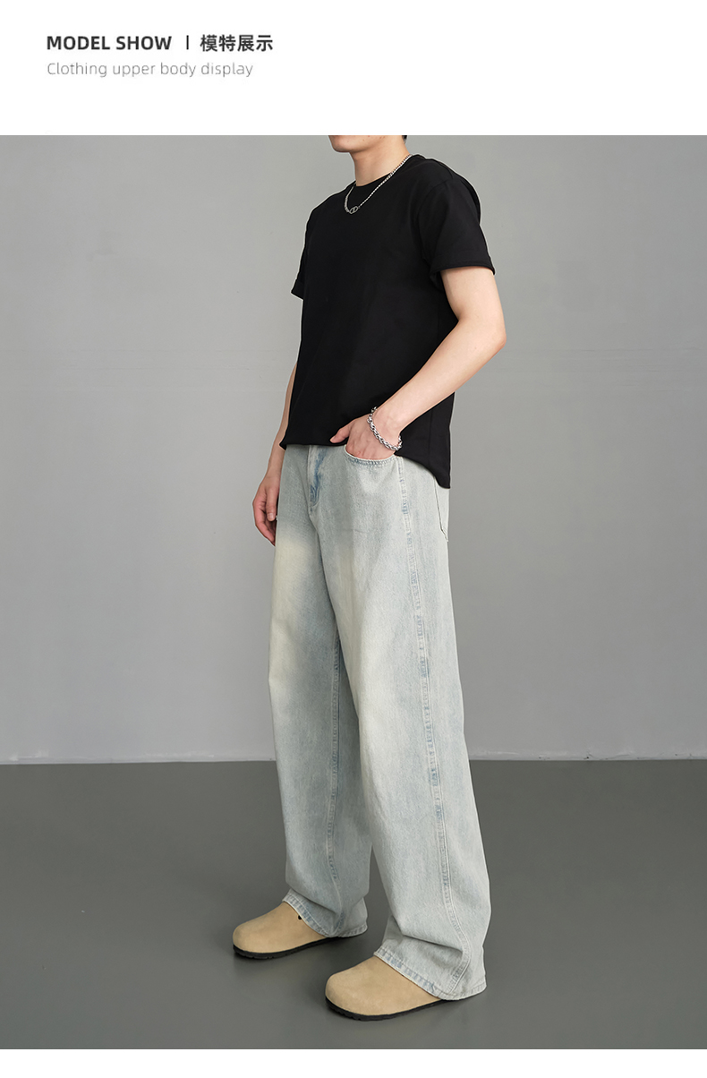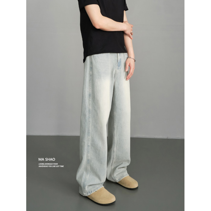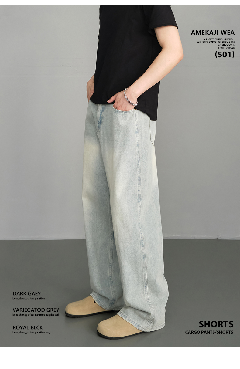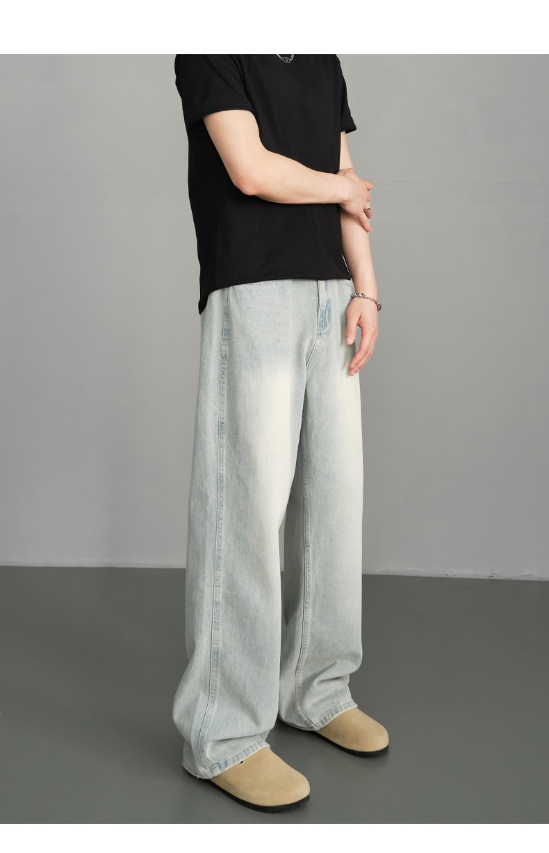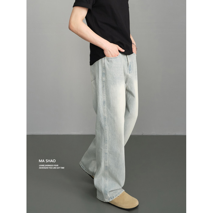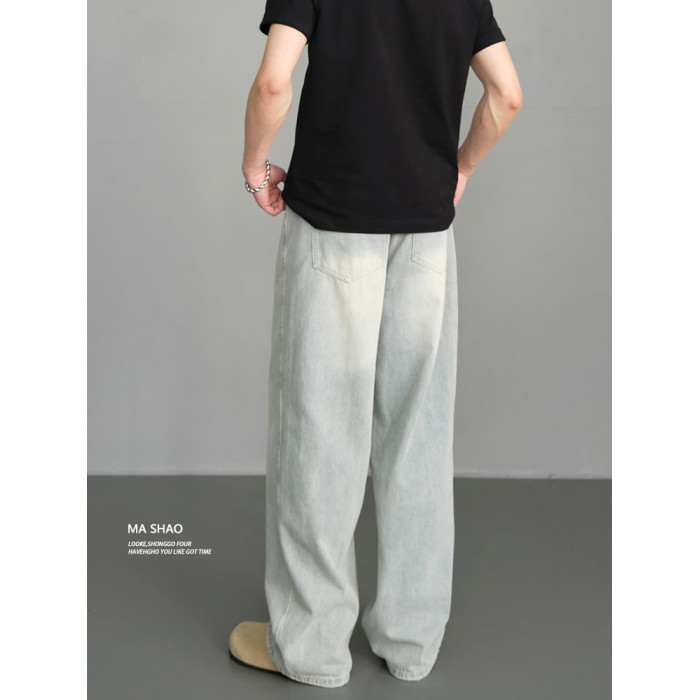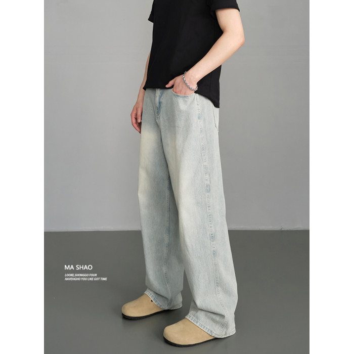 2025新季美式復古cleanfit淺色牛仔褲男直筒寬松做舊水洗垂感長褲