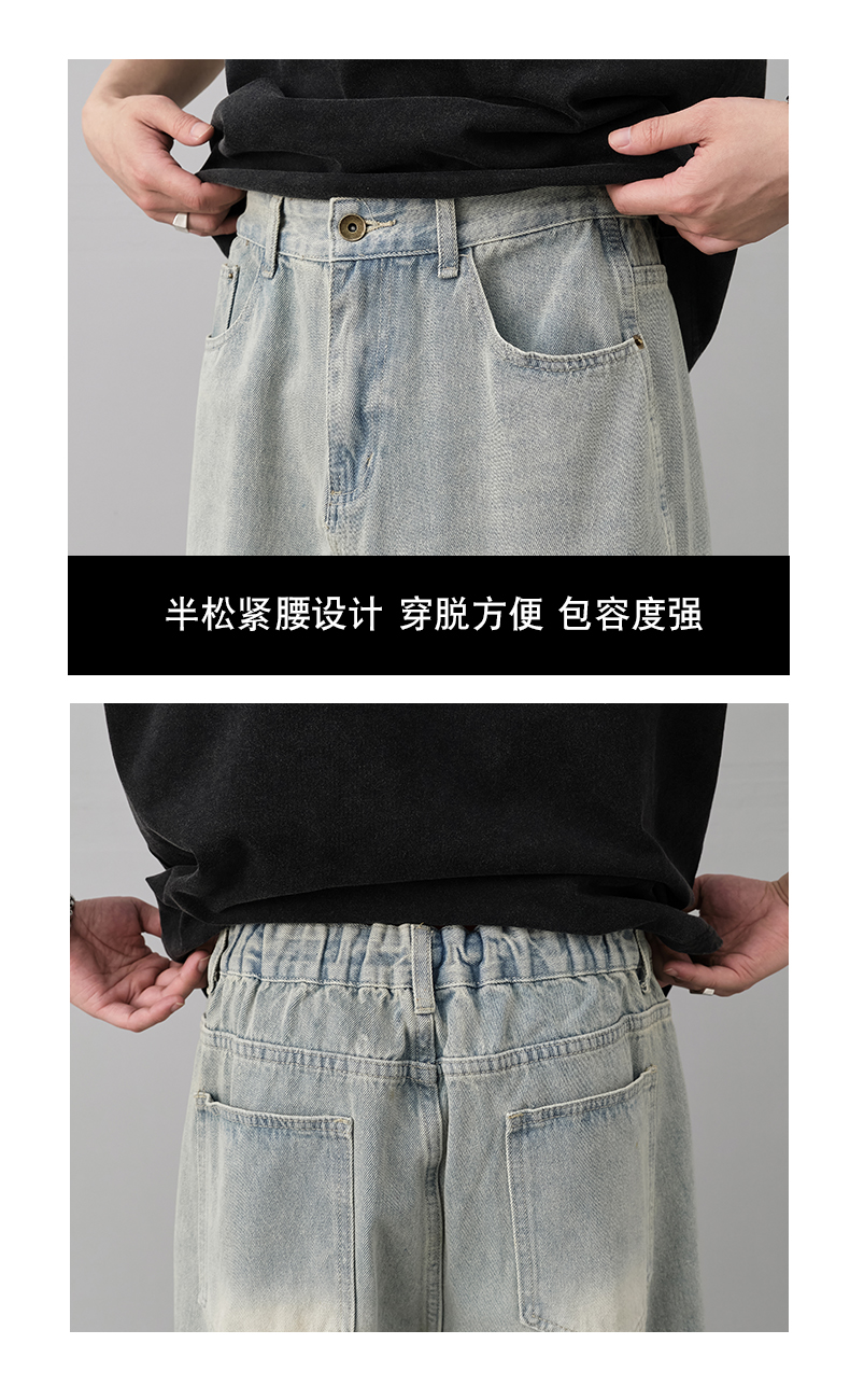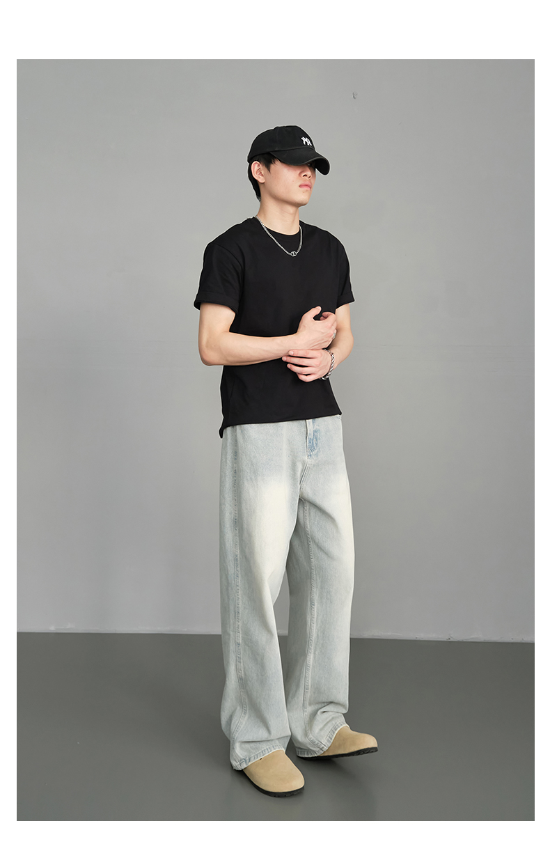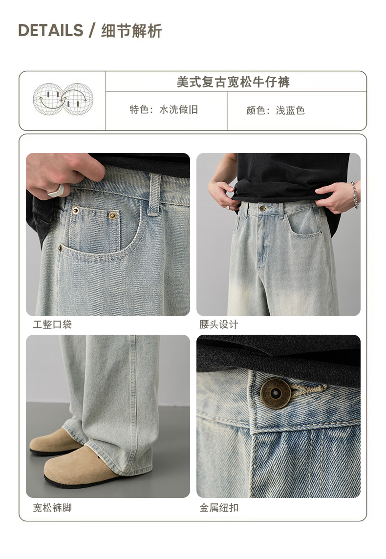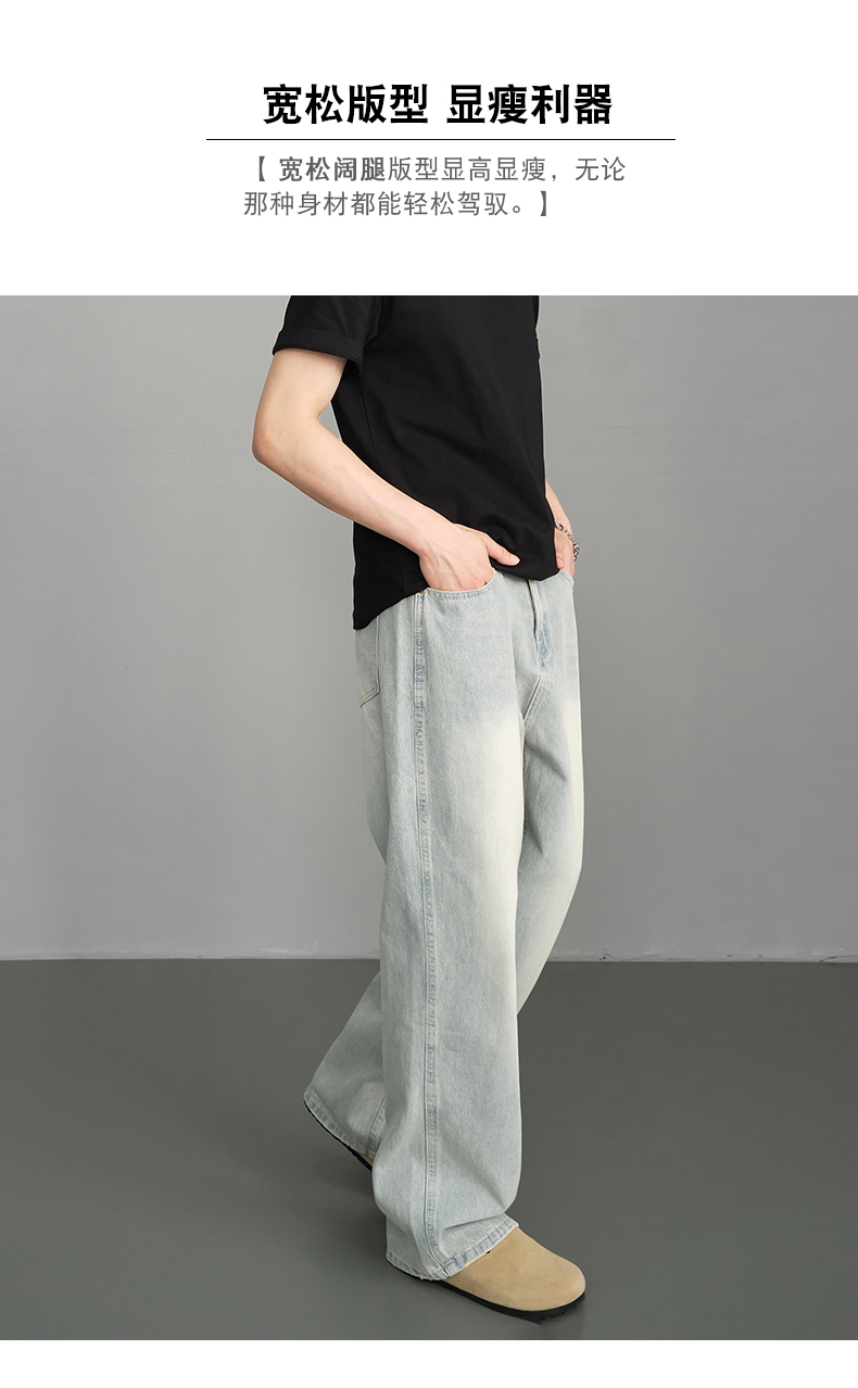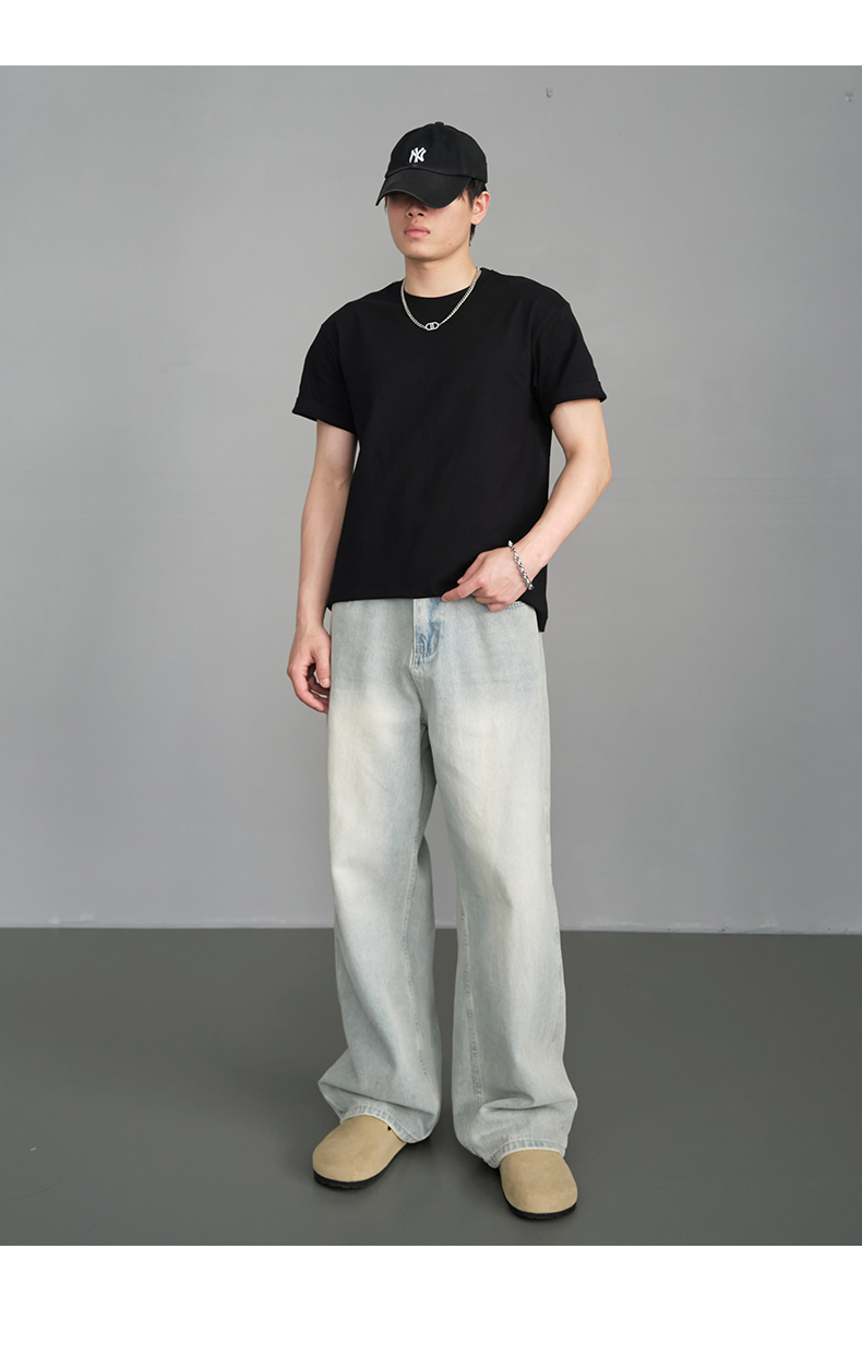 2025新季美式復古cleanfit淺色牛仔褲男直筒寬松做舊水洗垂感長褲