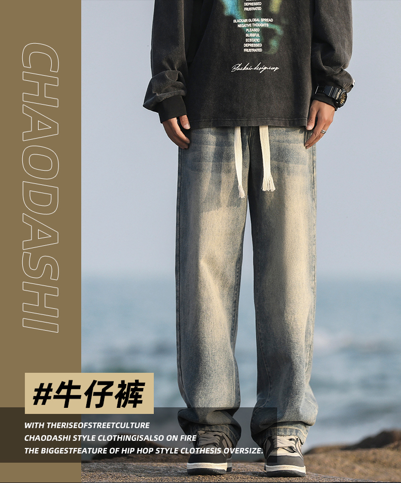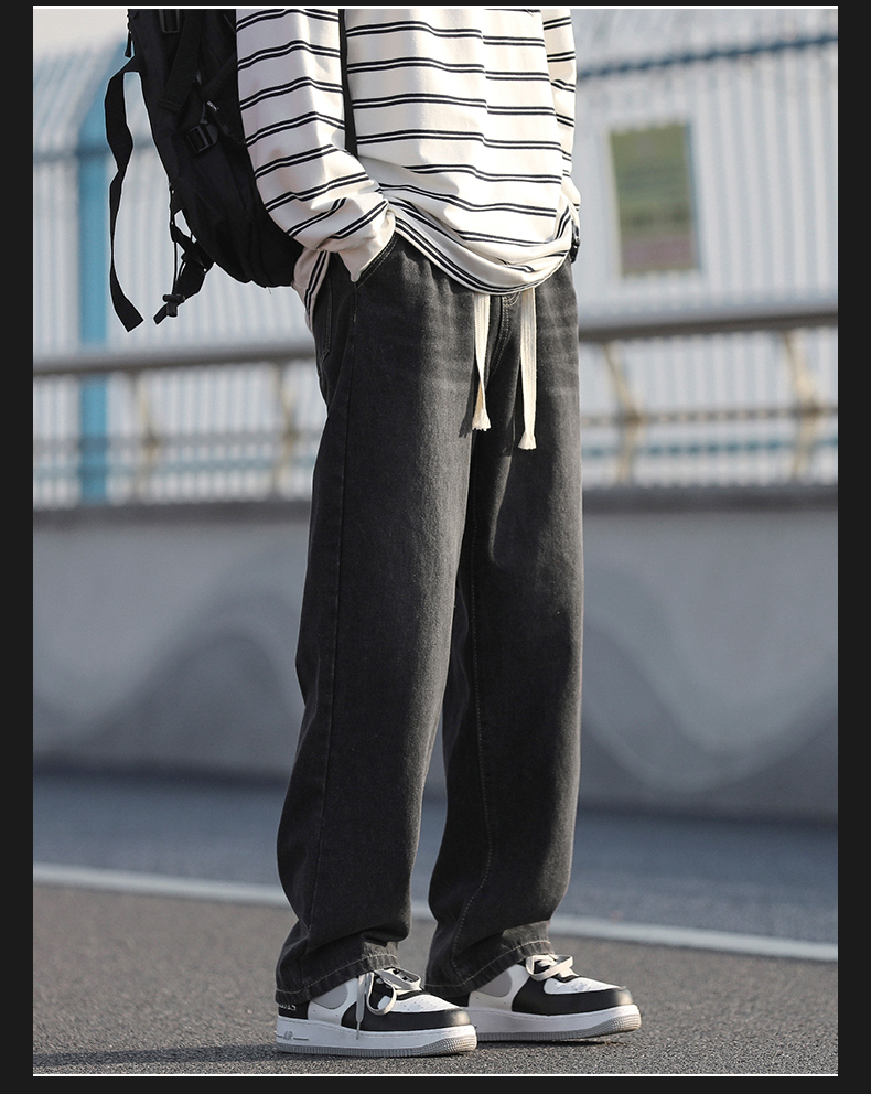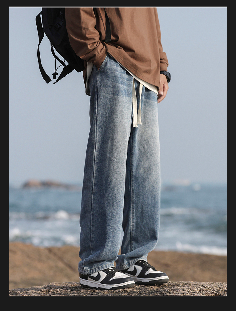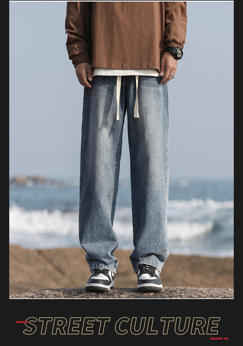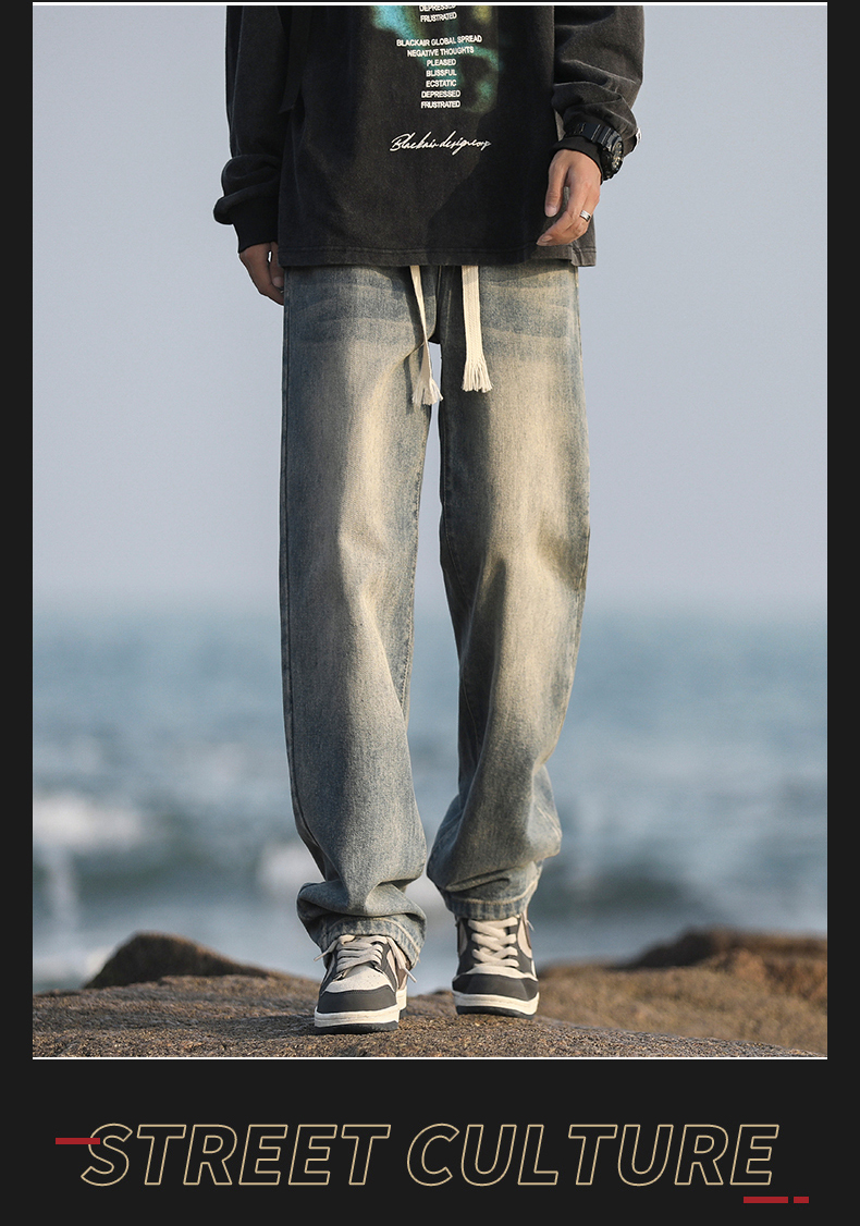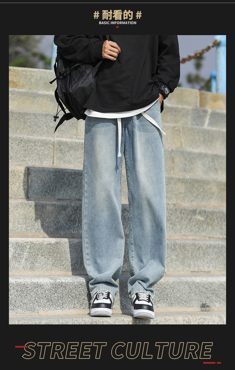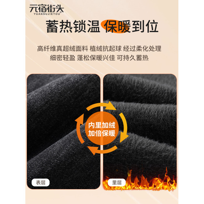 美式直筒加絨牛仔褲男款秋冬潮牌寬松水洗抽繩冬季休閒長褲子男士