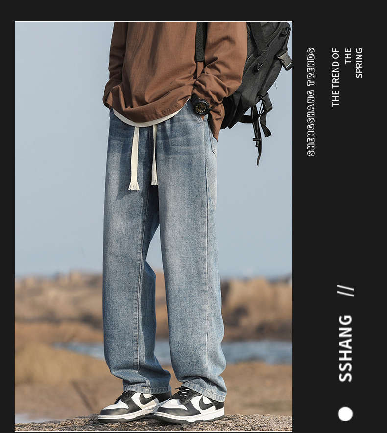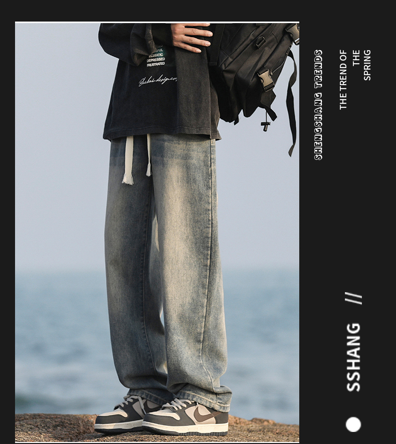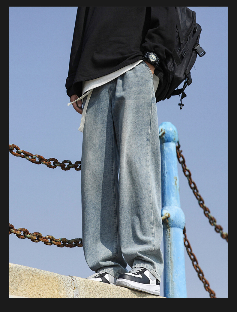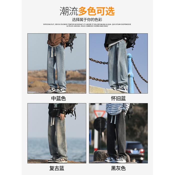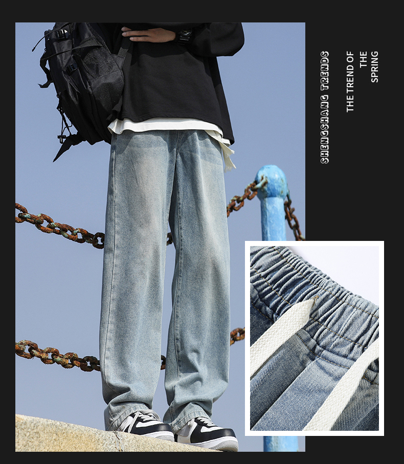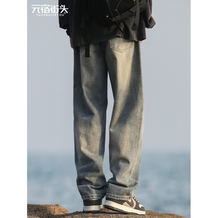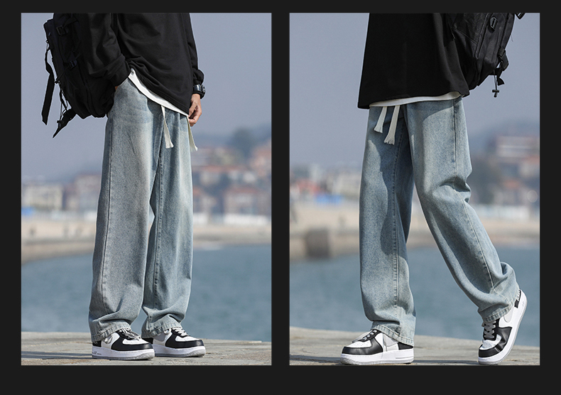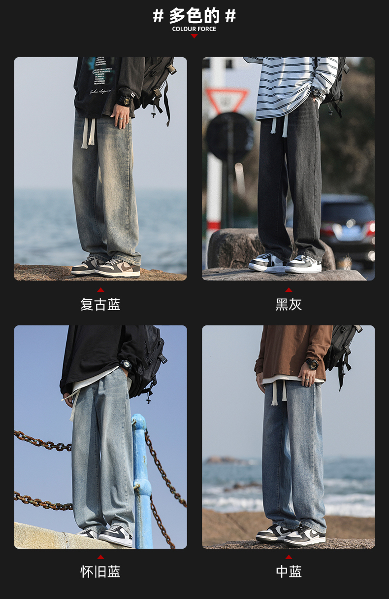 美式直筒加絨牛仔褲男款秋冬潮牌寬松水洗抽繩冬季休閒長褲子男士