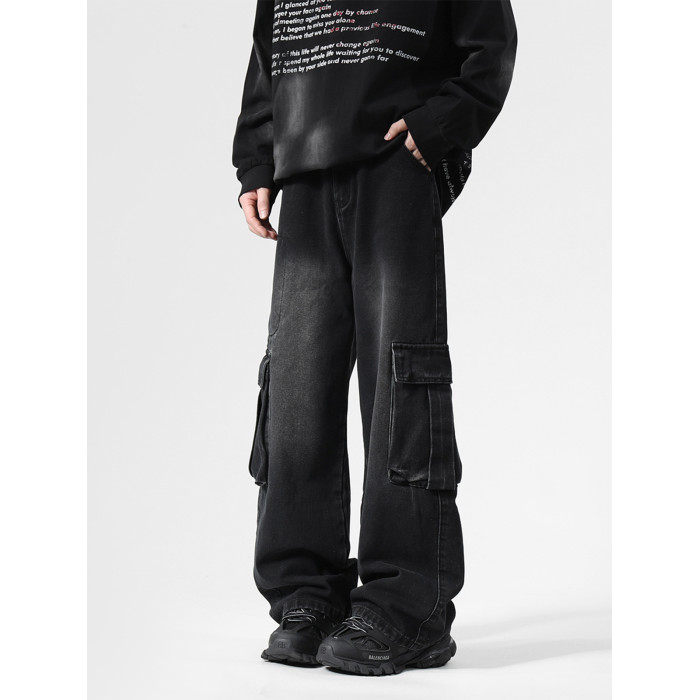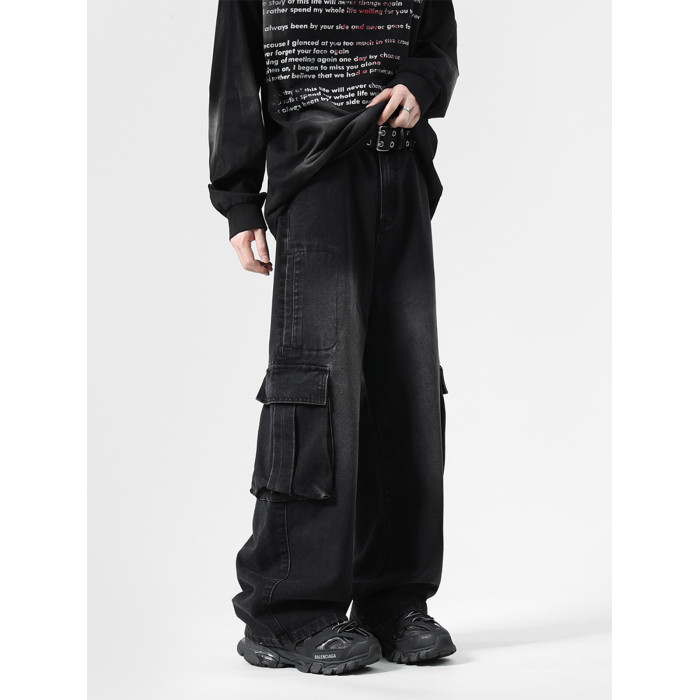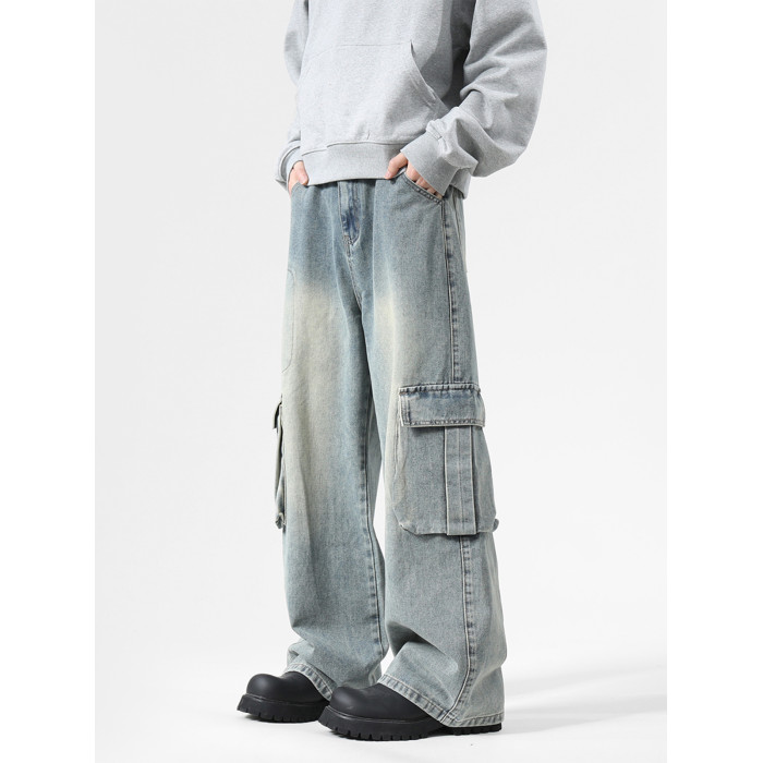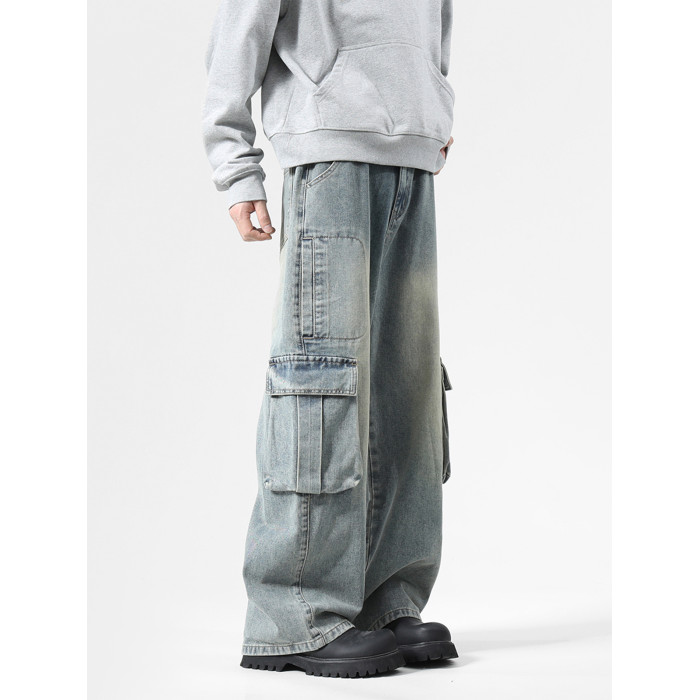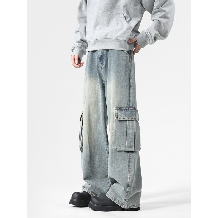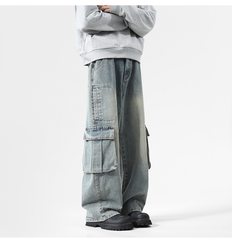 大口袋工裝牛仔褲男潮牌新款寬松濶腿水洗復古高街美式拖地長褲子