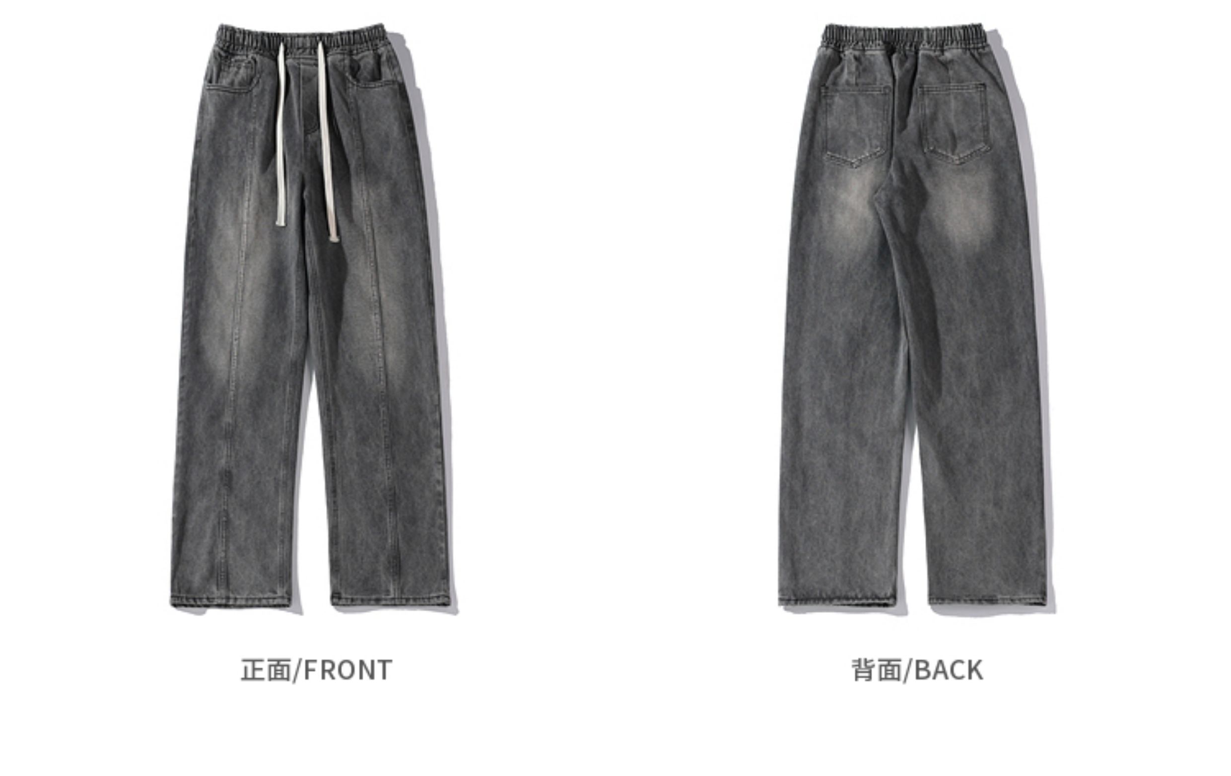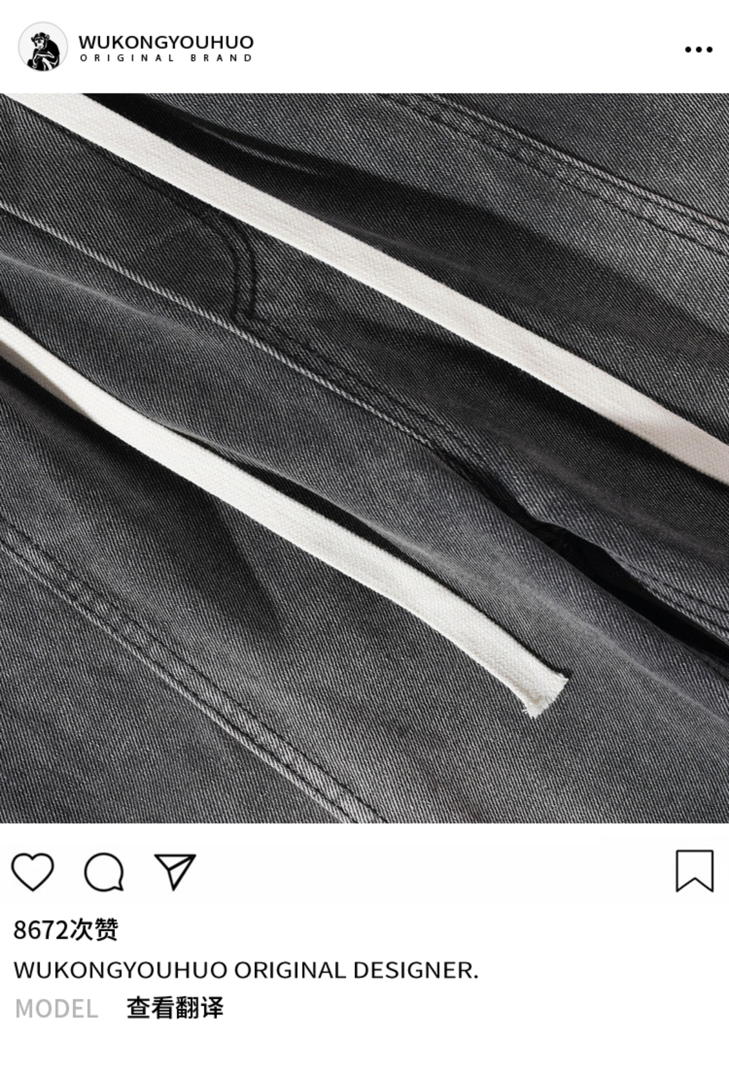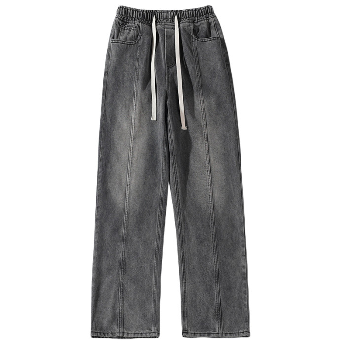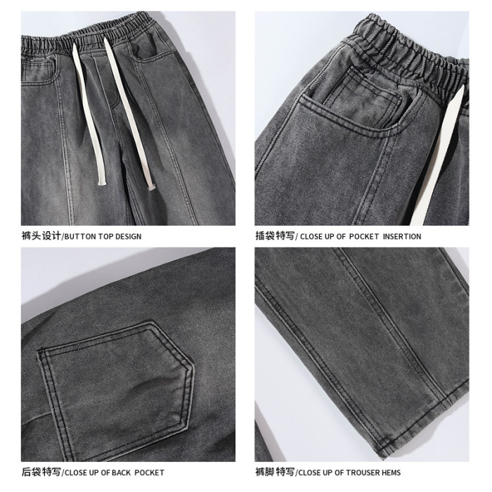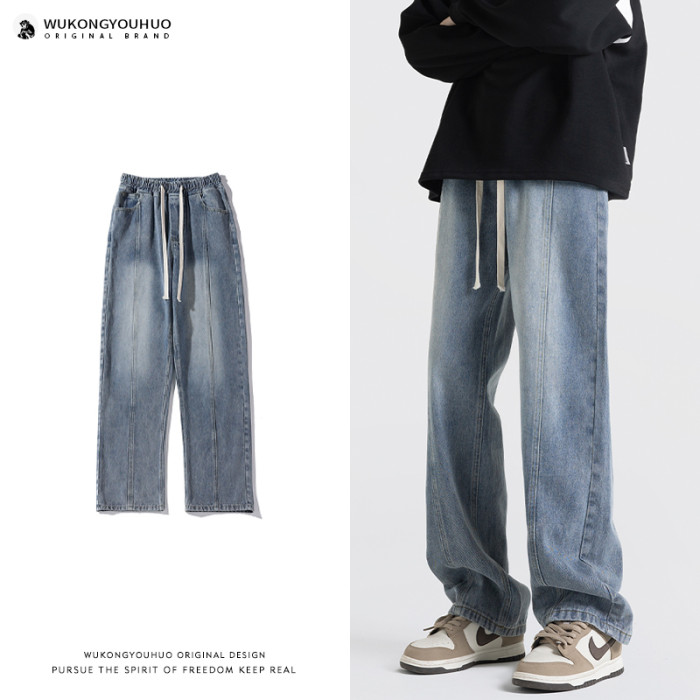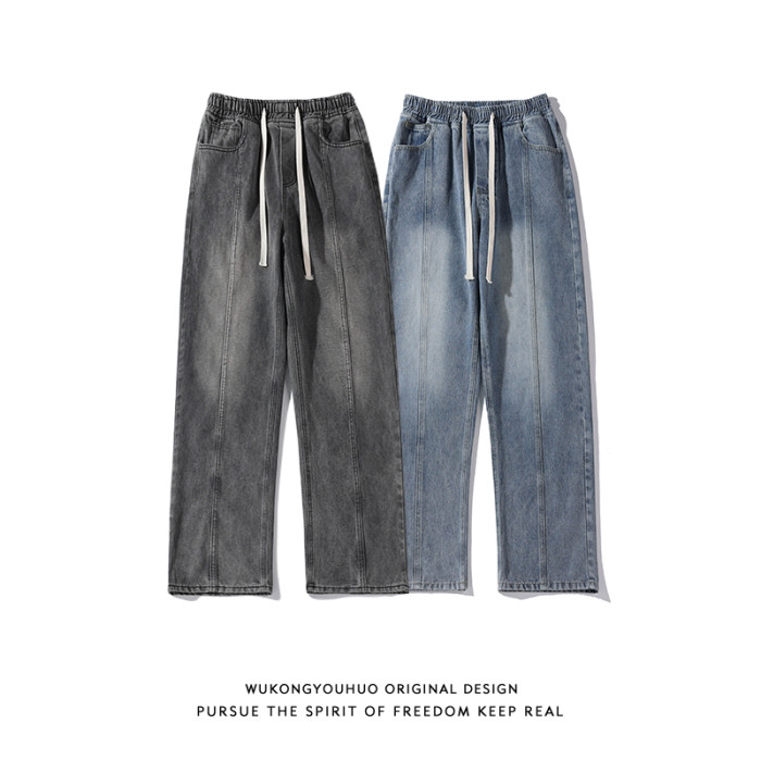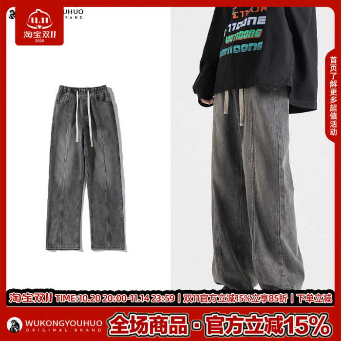 悟空有貨美式街頭做舊抽繩松緊腰牛仔褲男女潮牌寬松直筒百搭長褲