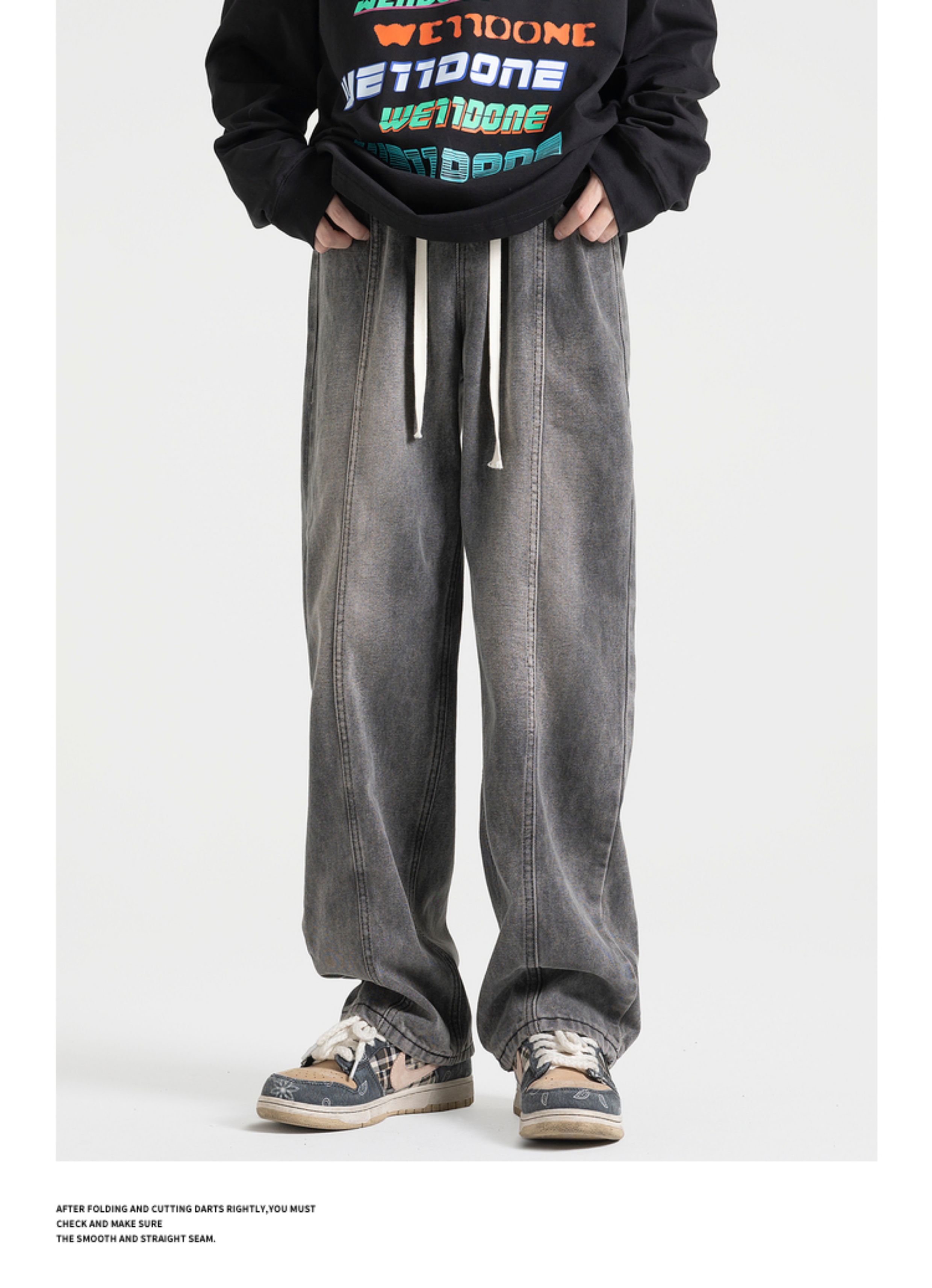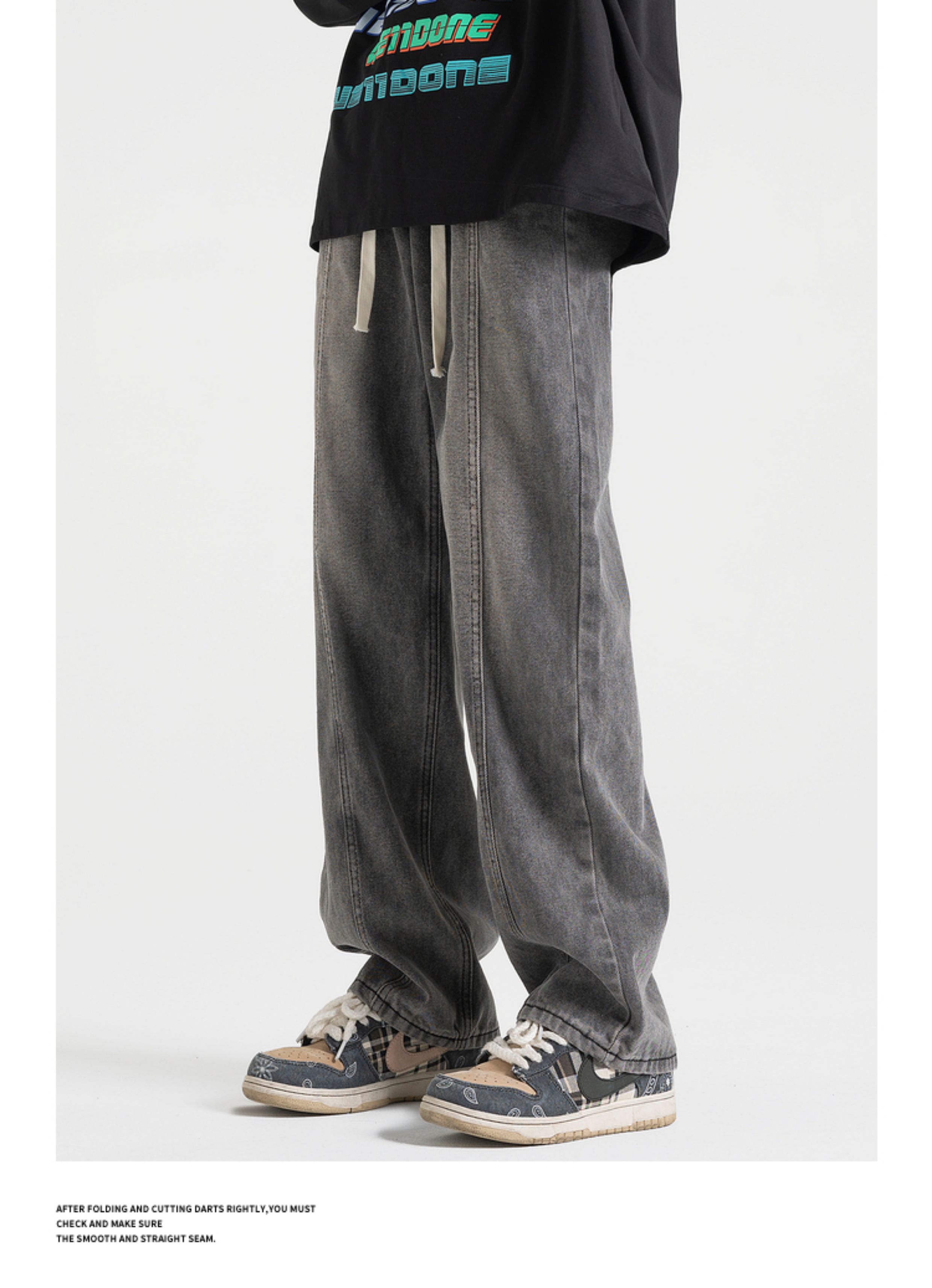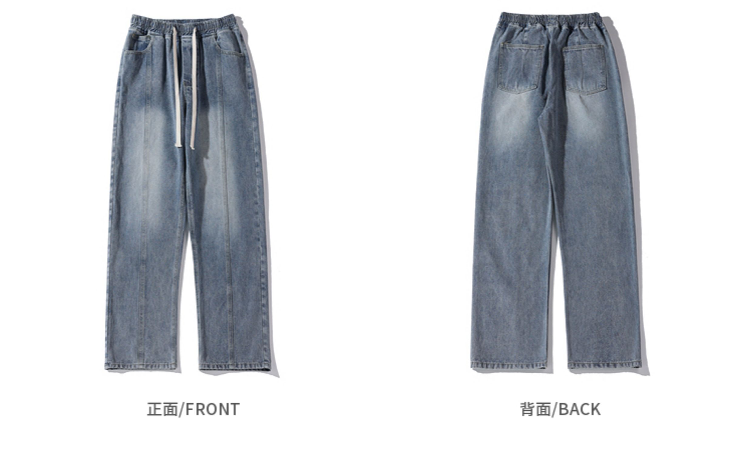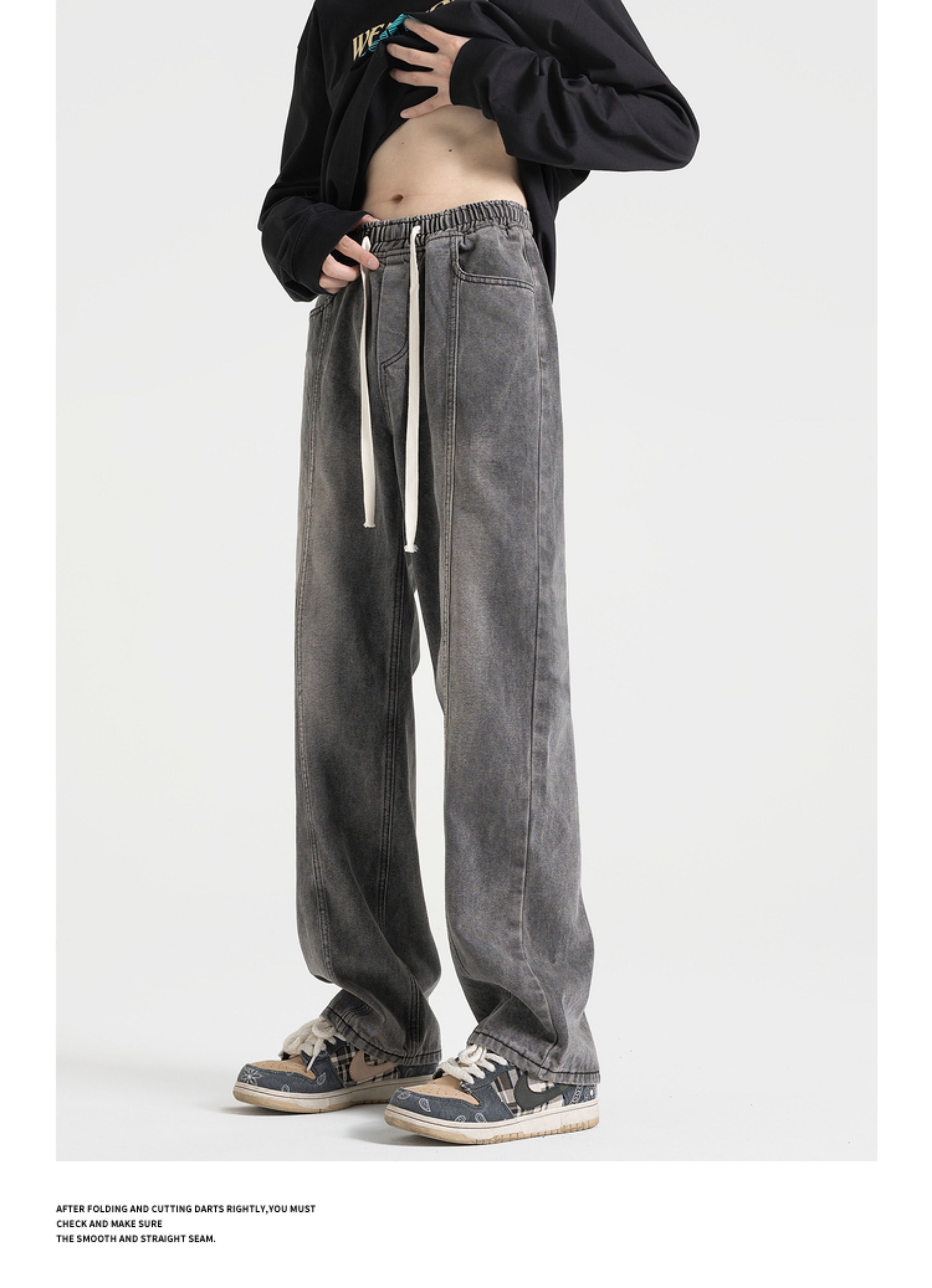 悟空有貨美式街頭做舊抽繩松緊腰牛仔褲男女潮牌寬松直筒百搭長褲