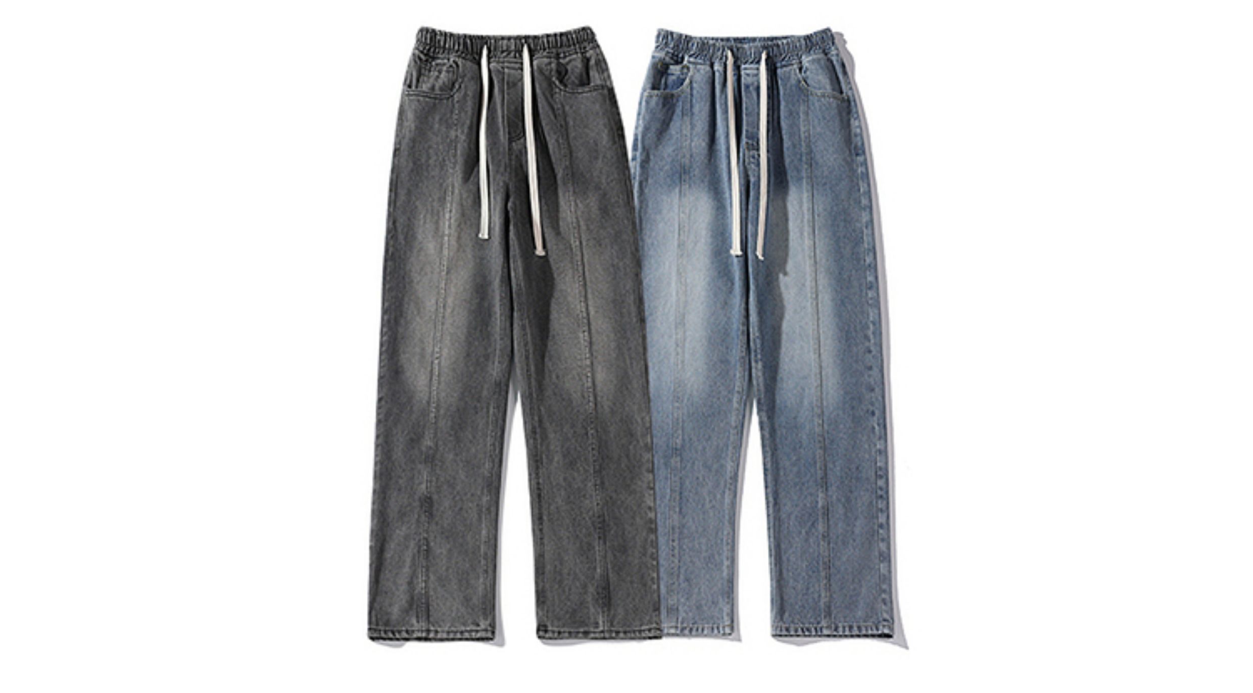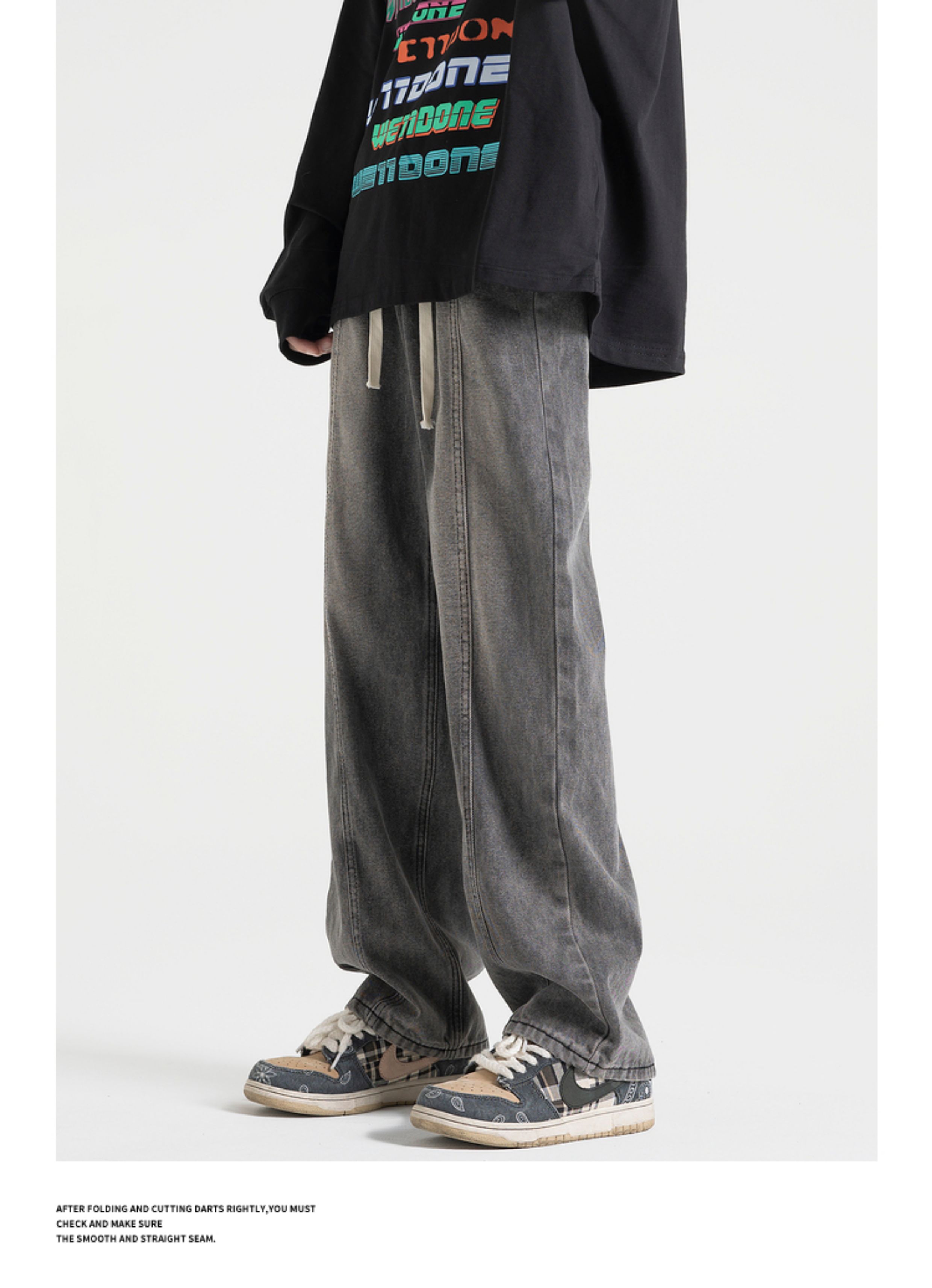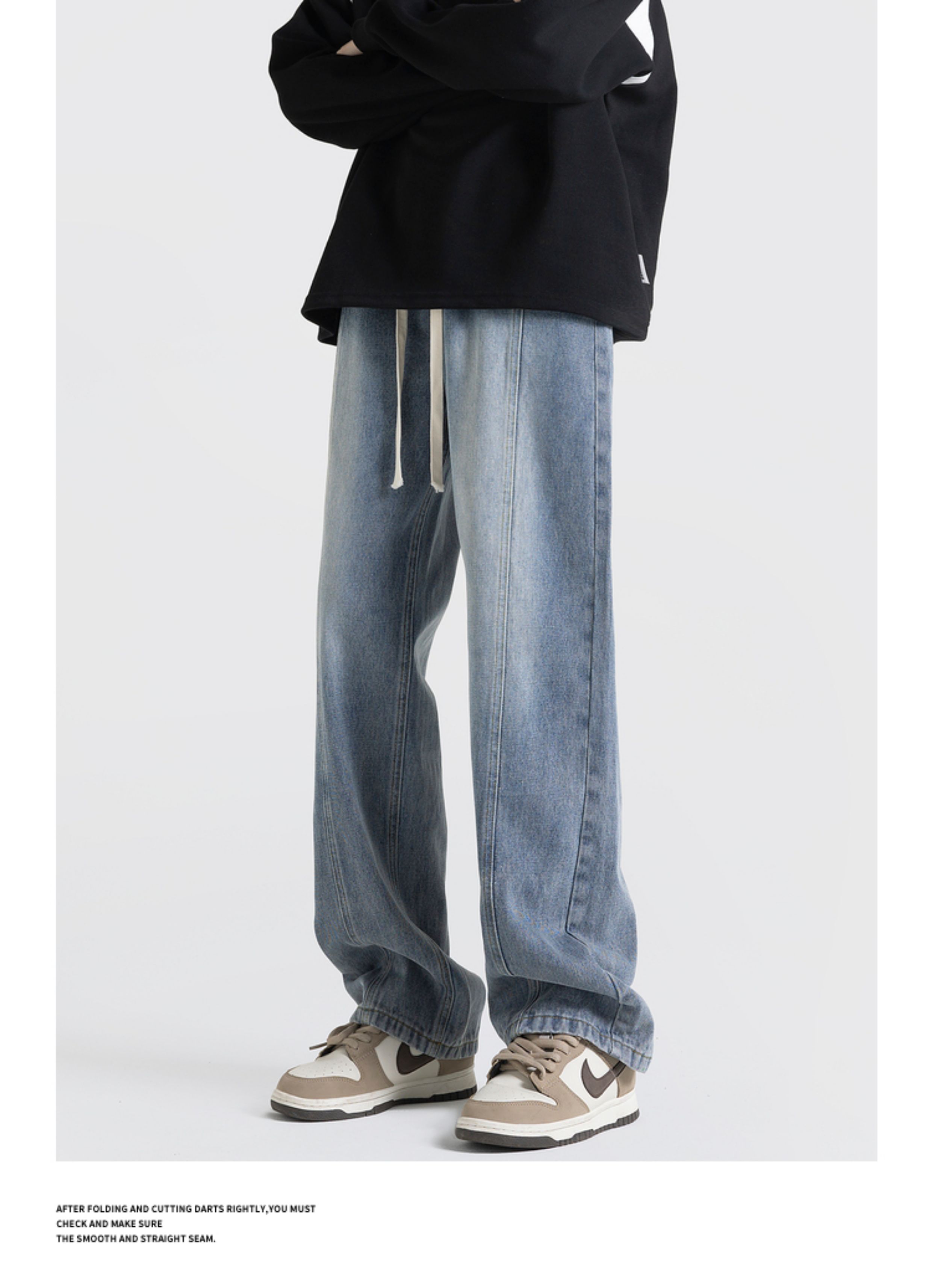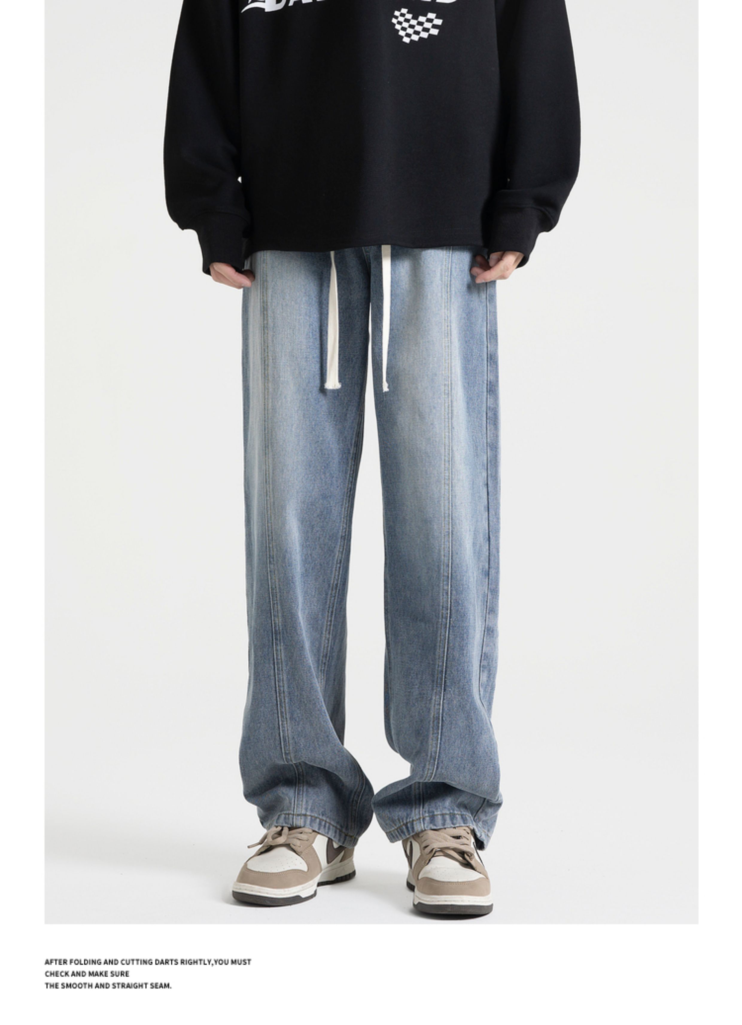 悟空有貨美式街頭做舊抽繩松緊腰牛仔褲男女潮牌寬松直筒百搭長褲