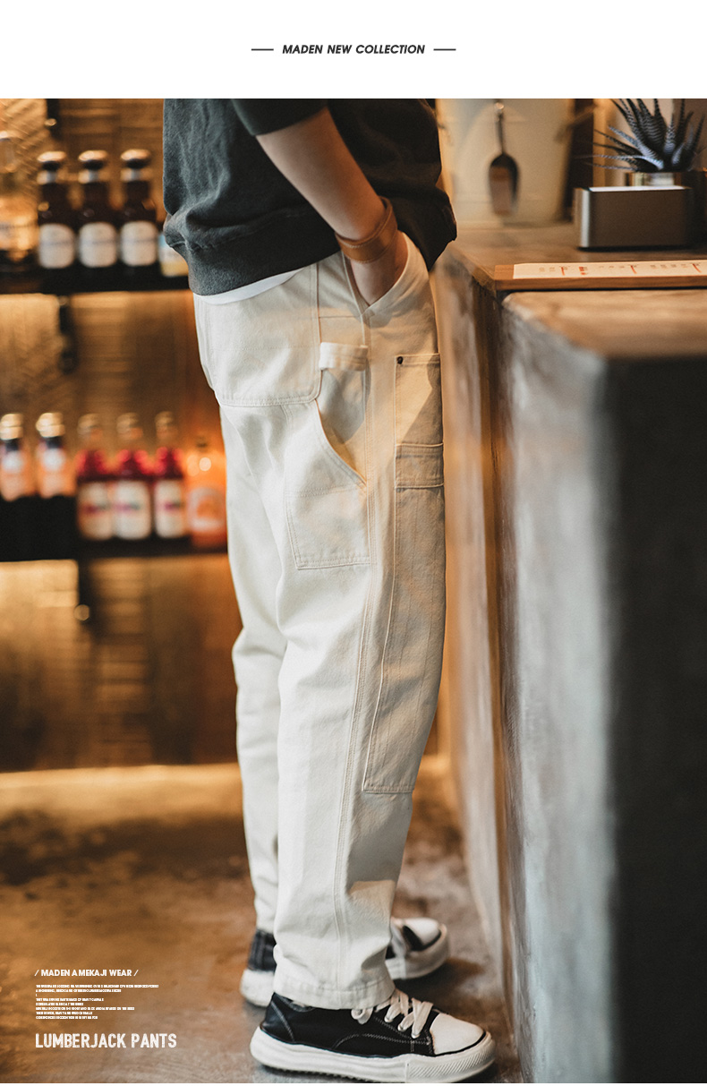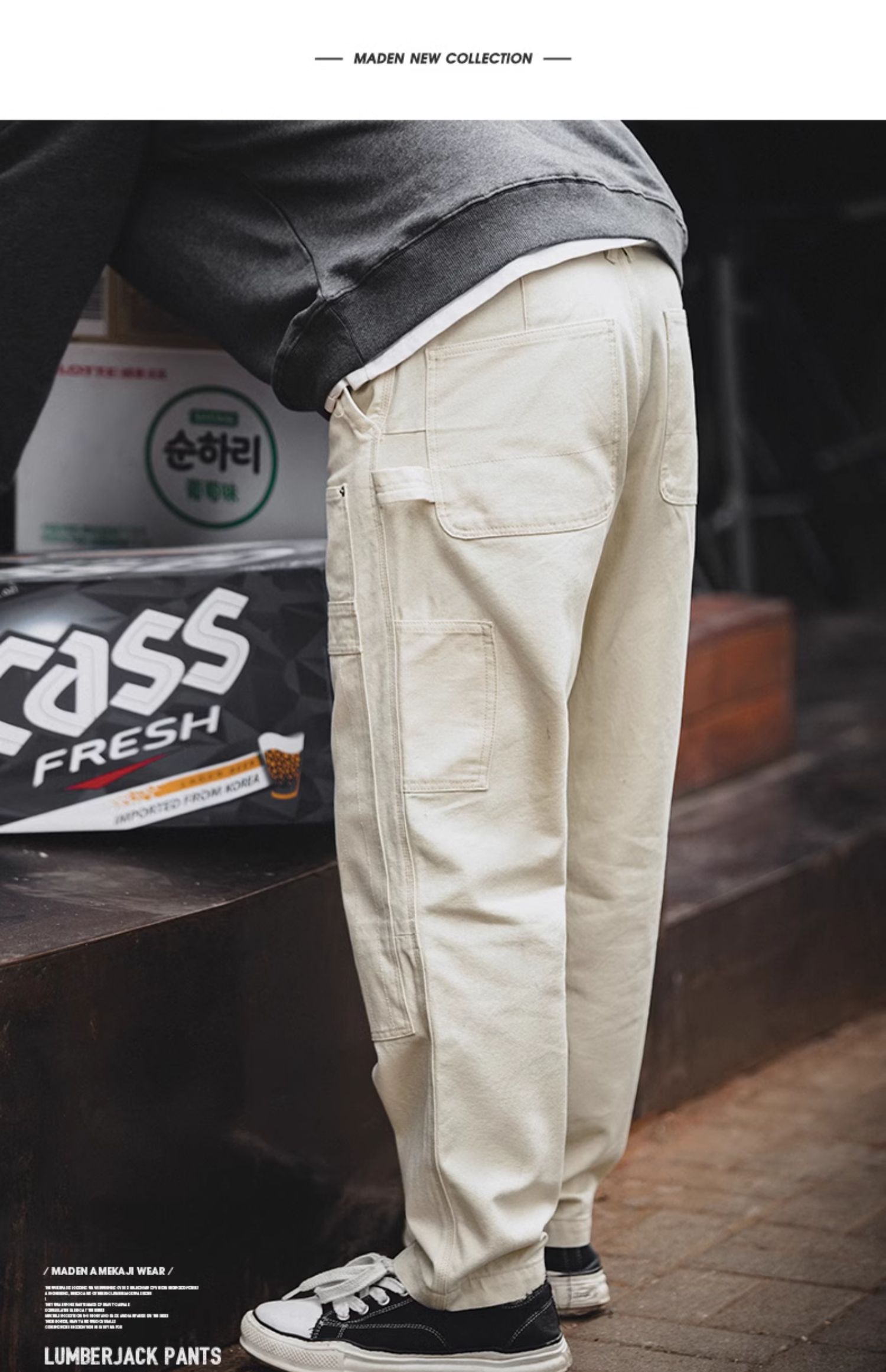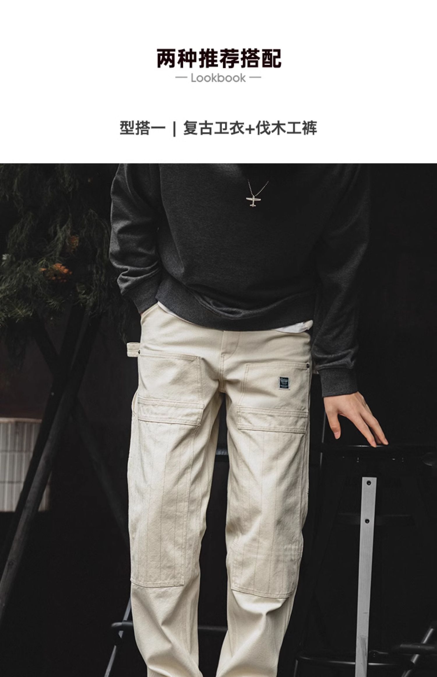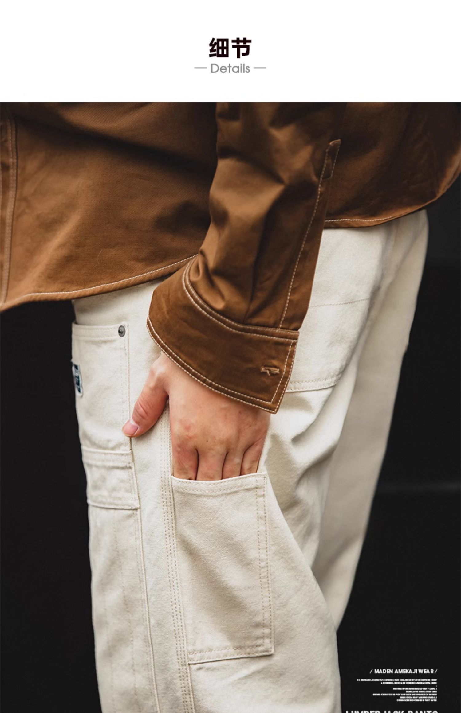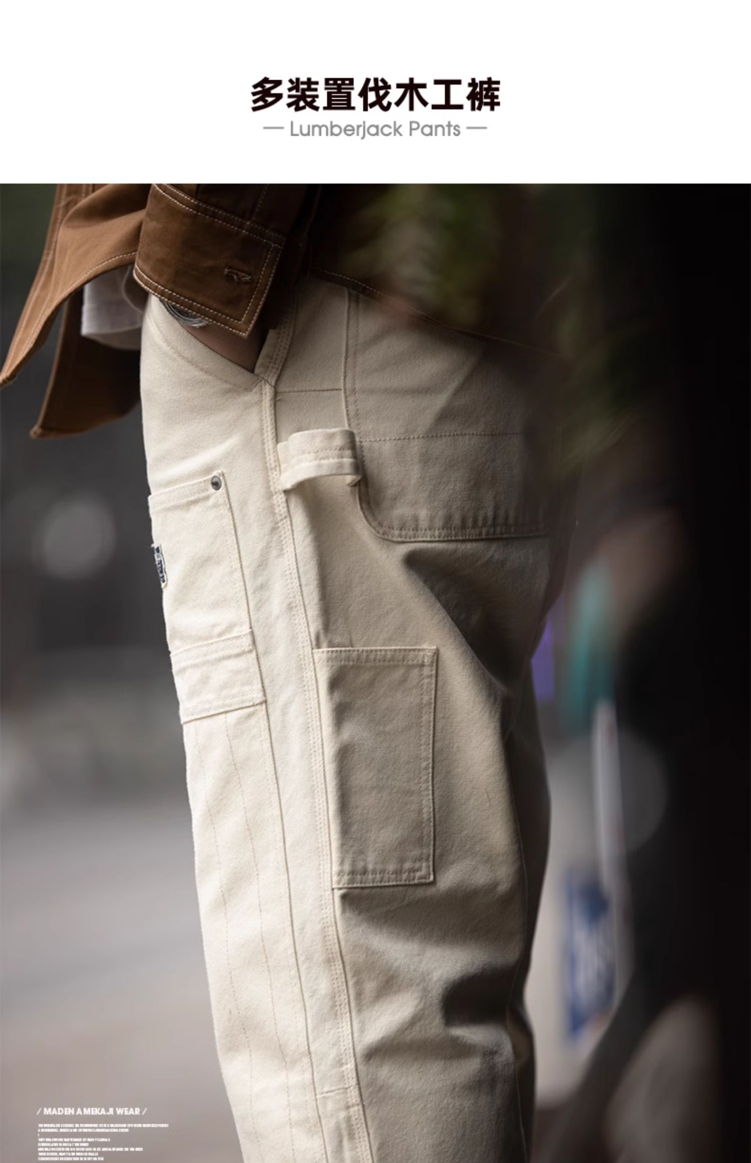 馬登工裝美式復古做舊寬松米白牛仔褲休閒直筒多口袋伐木工褲男秋