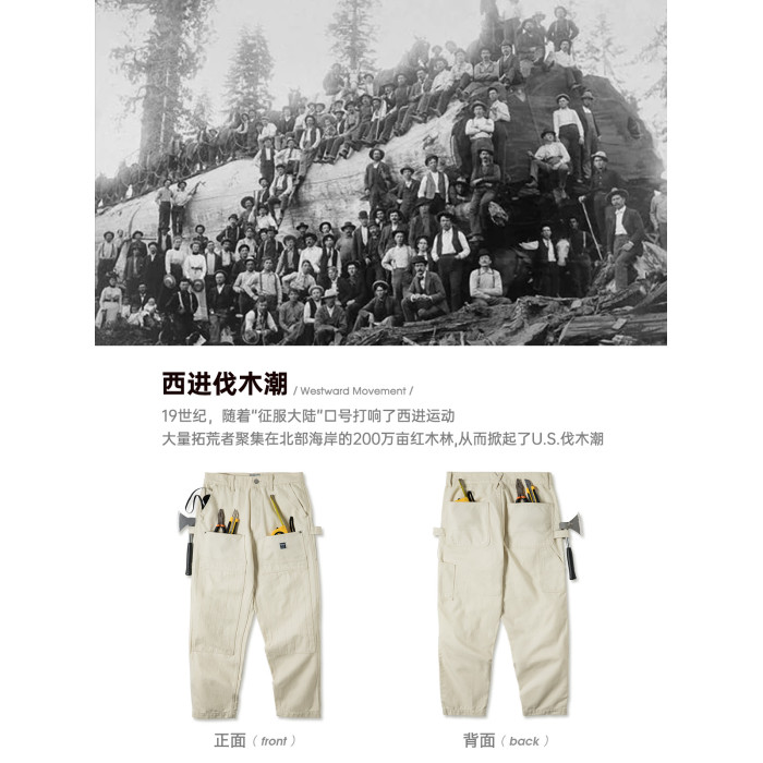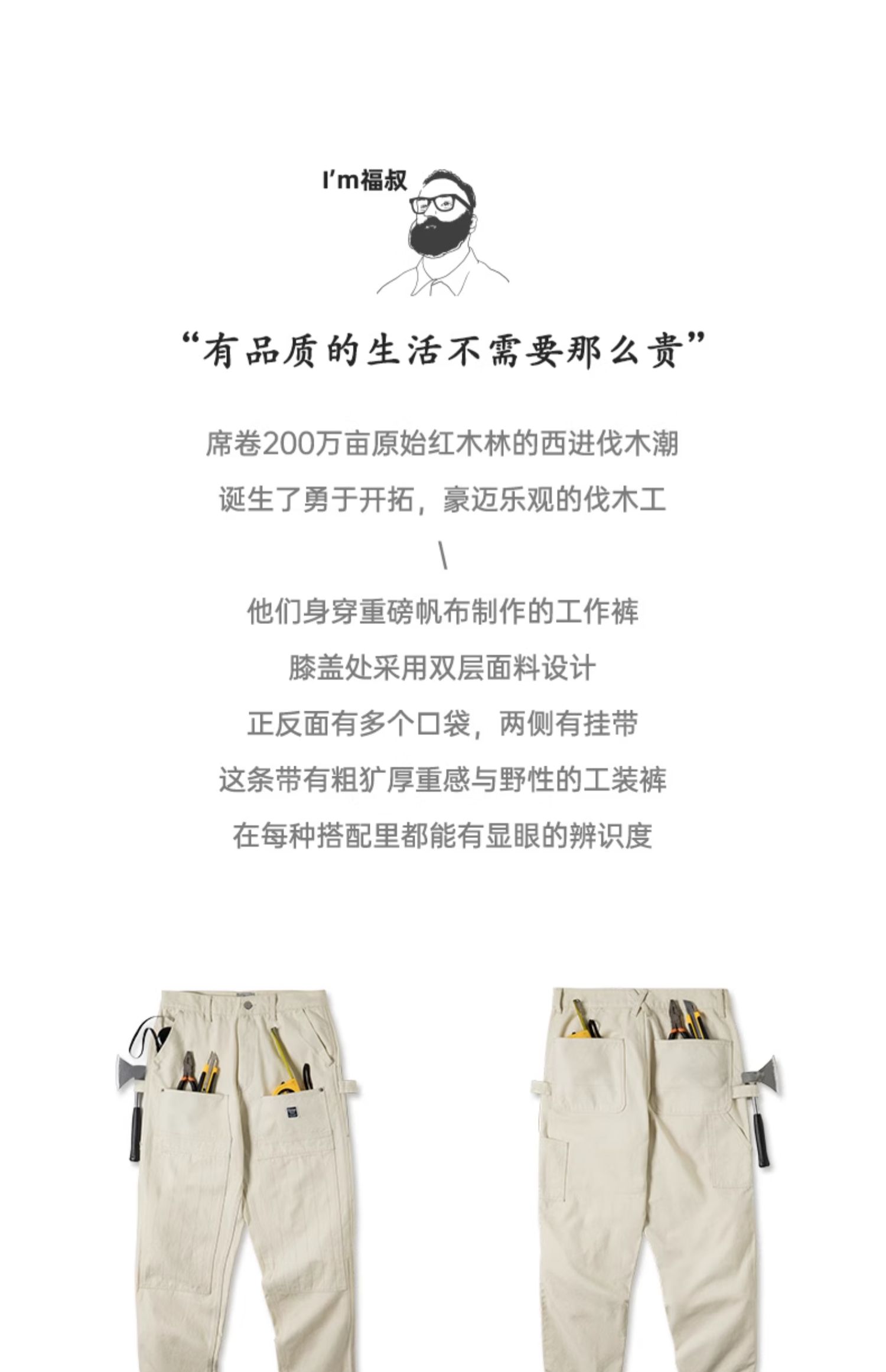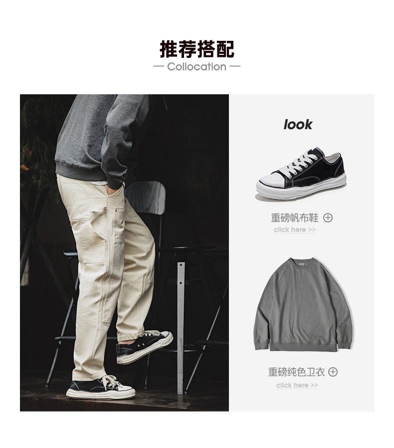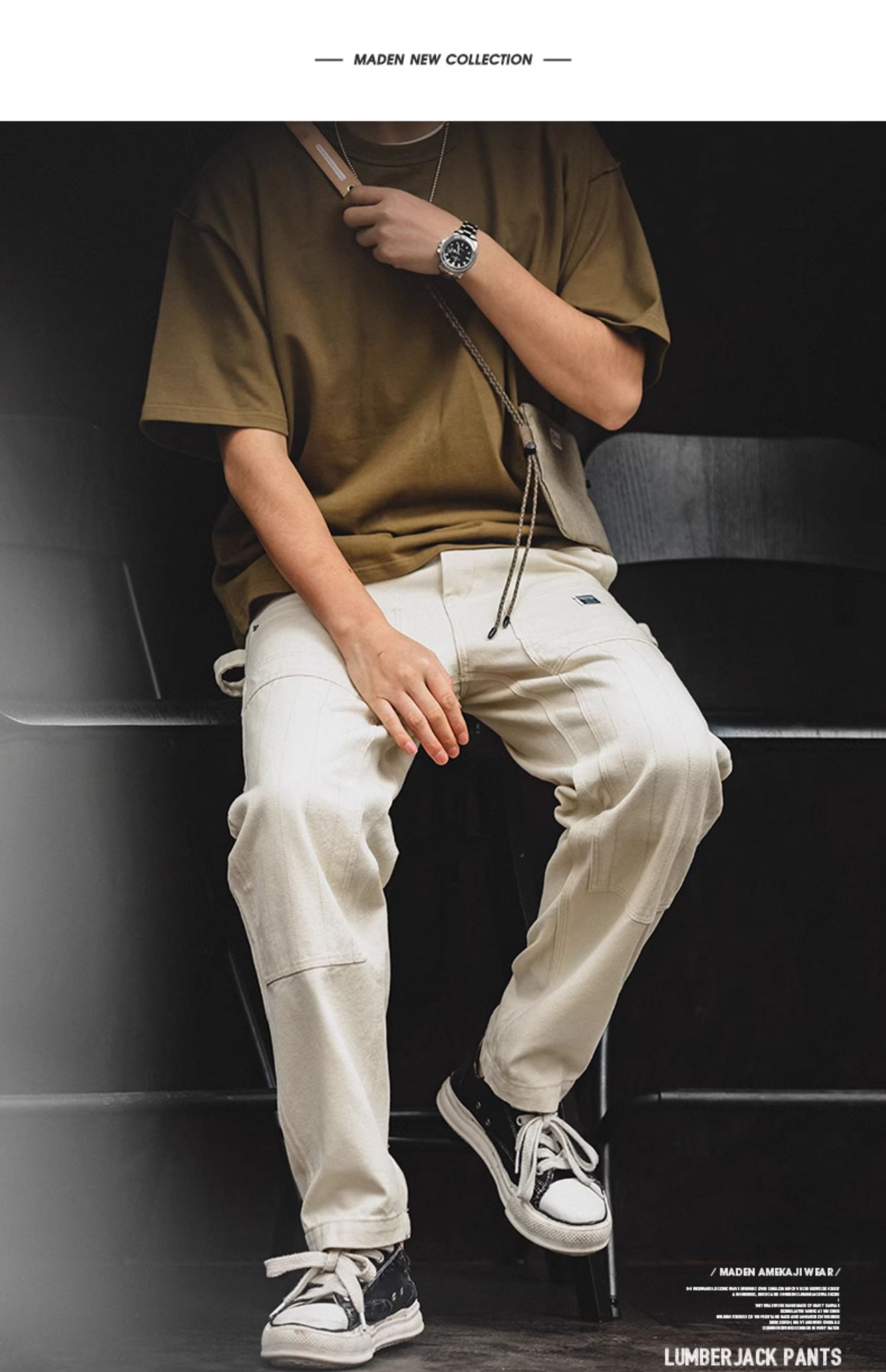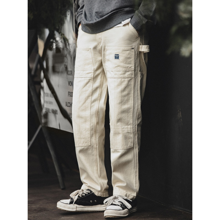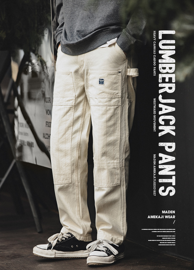 馬登工裝美式復古做舊寬松米白牛仔褲休閒直筒多口袋伐木工褲男秋