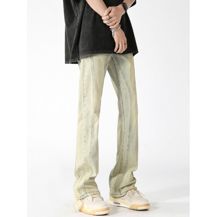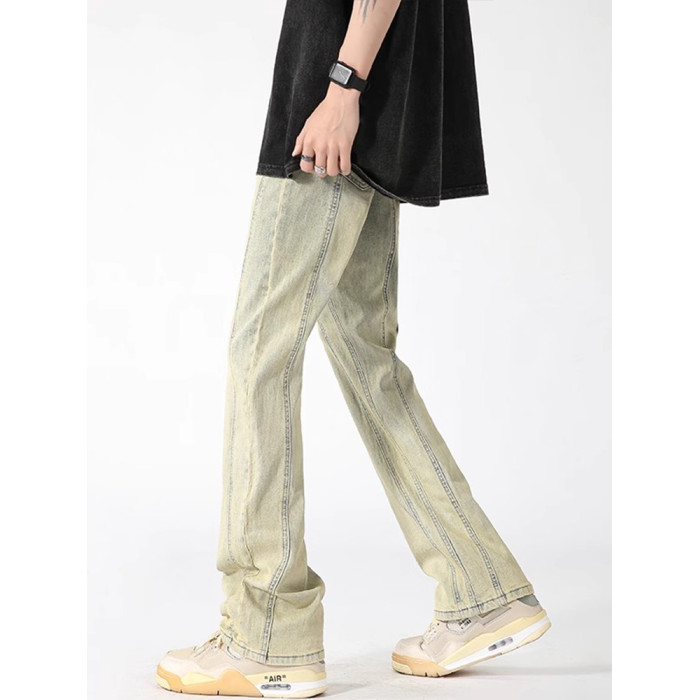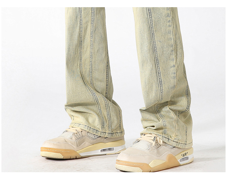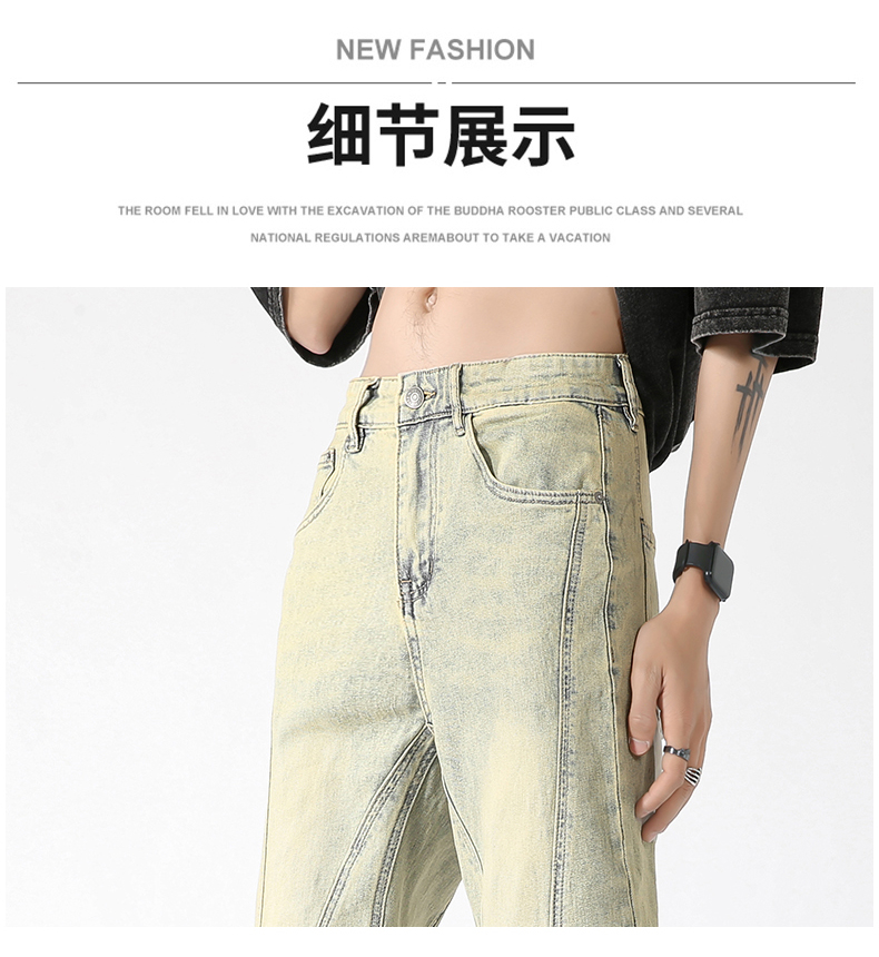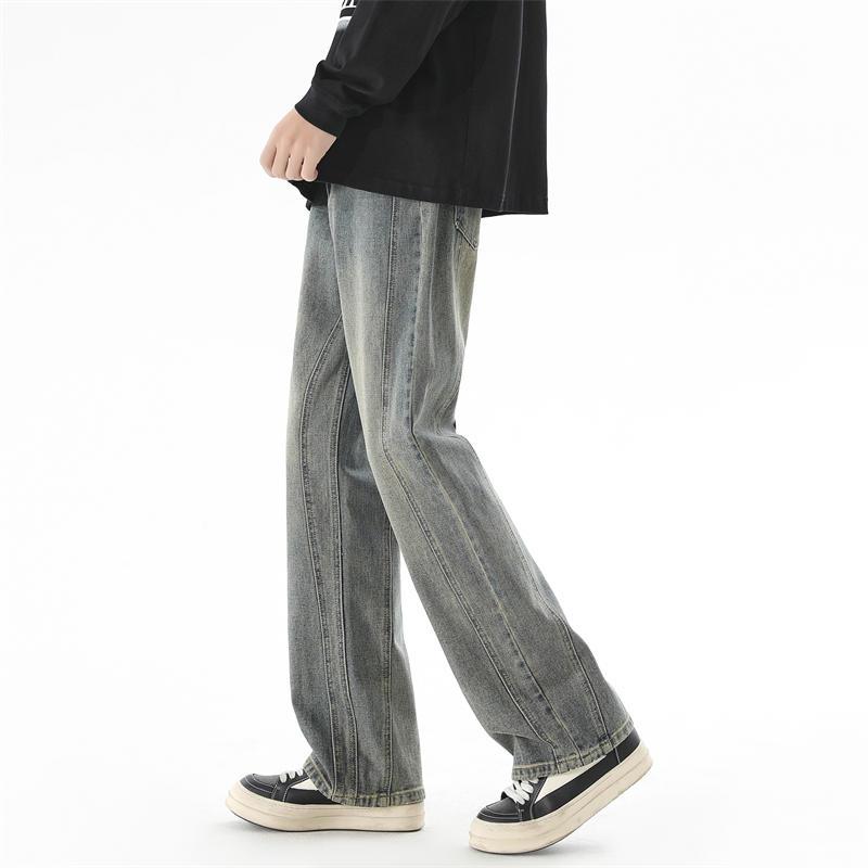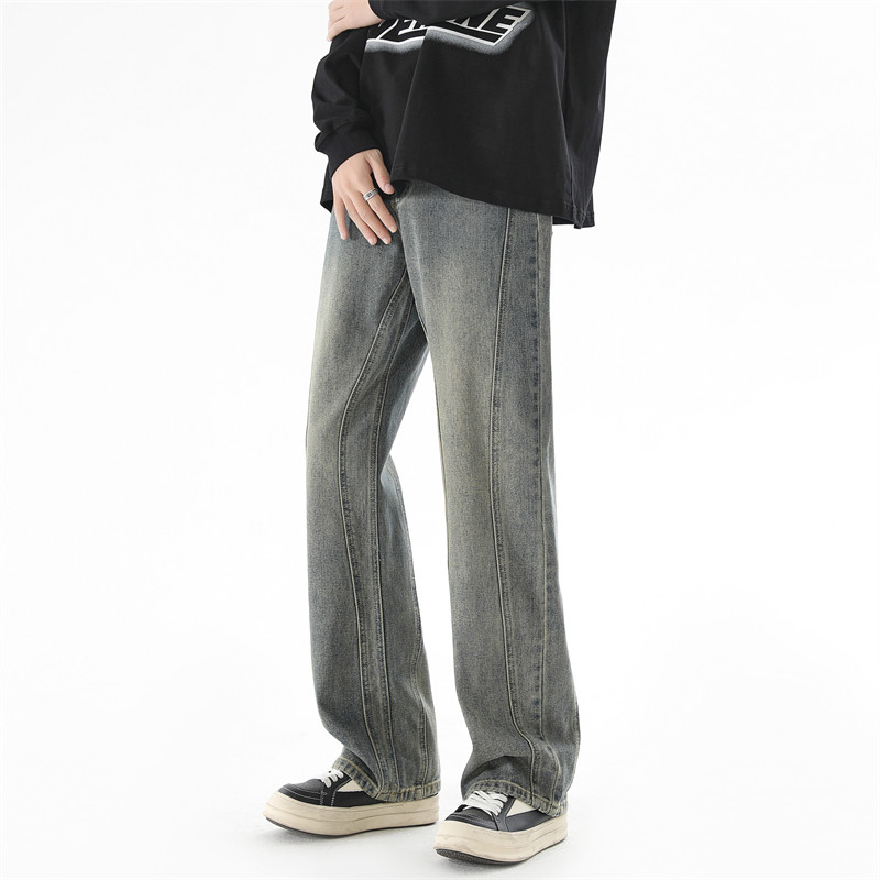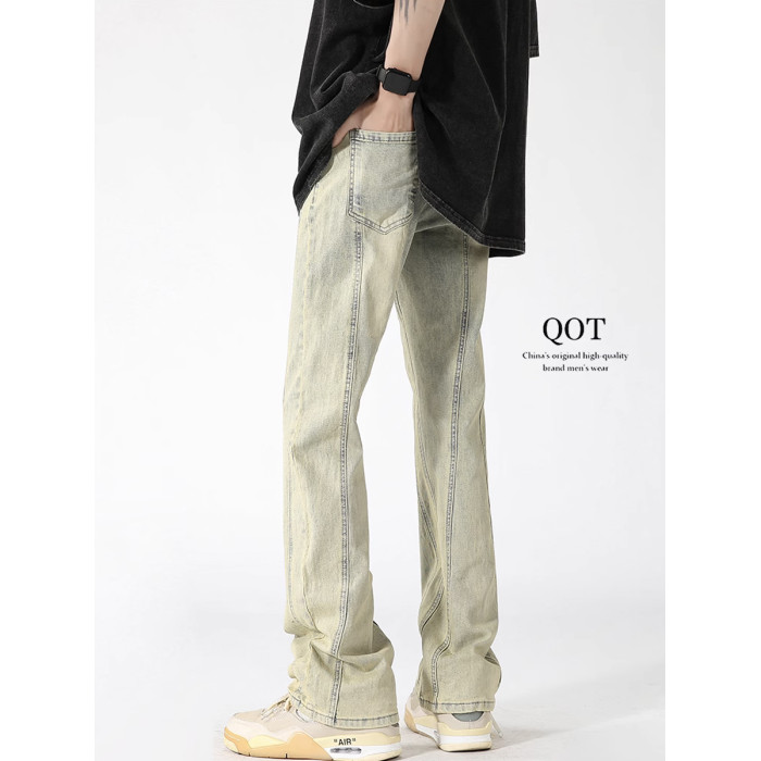 QOTRIOCK美式黃泥染微喇牛仔褲男女秋季潮拼接直筒褲大碼休閒長褲