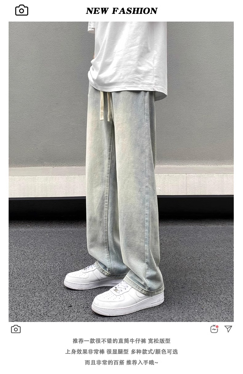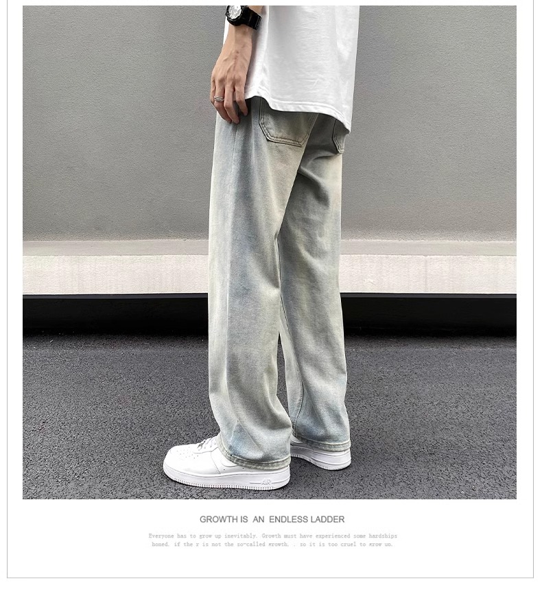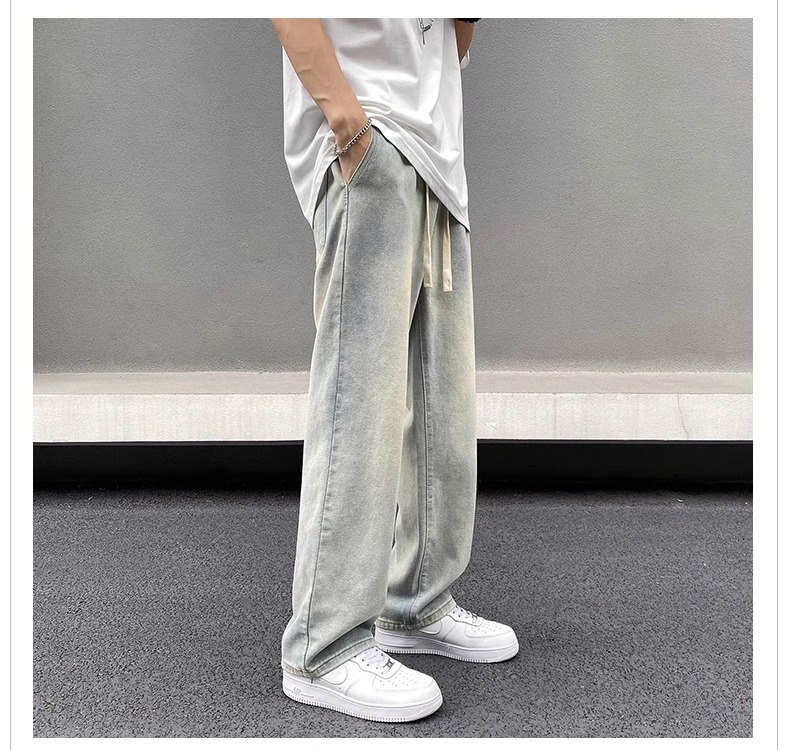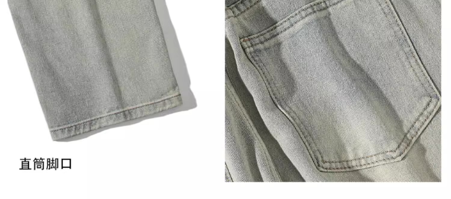 美式黃泥牛仔褲男士秋季冬秋潮牌高街直筒寬松做舊休閒濶腿長褲子