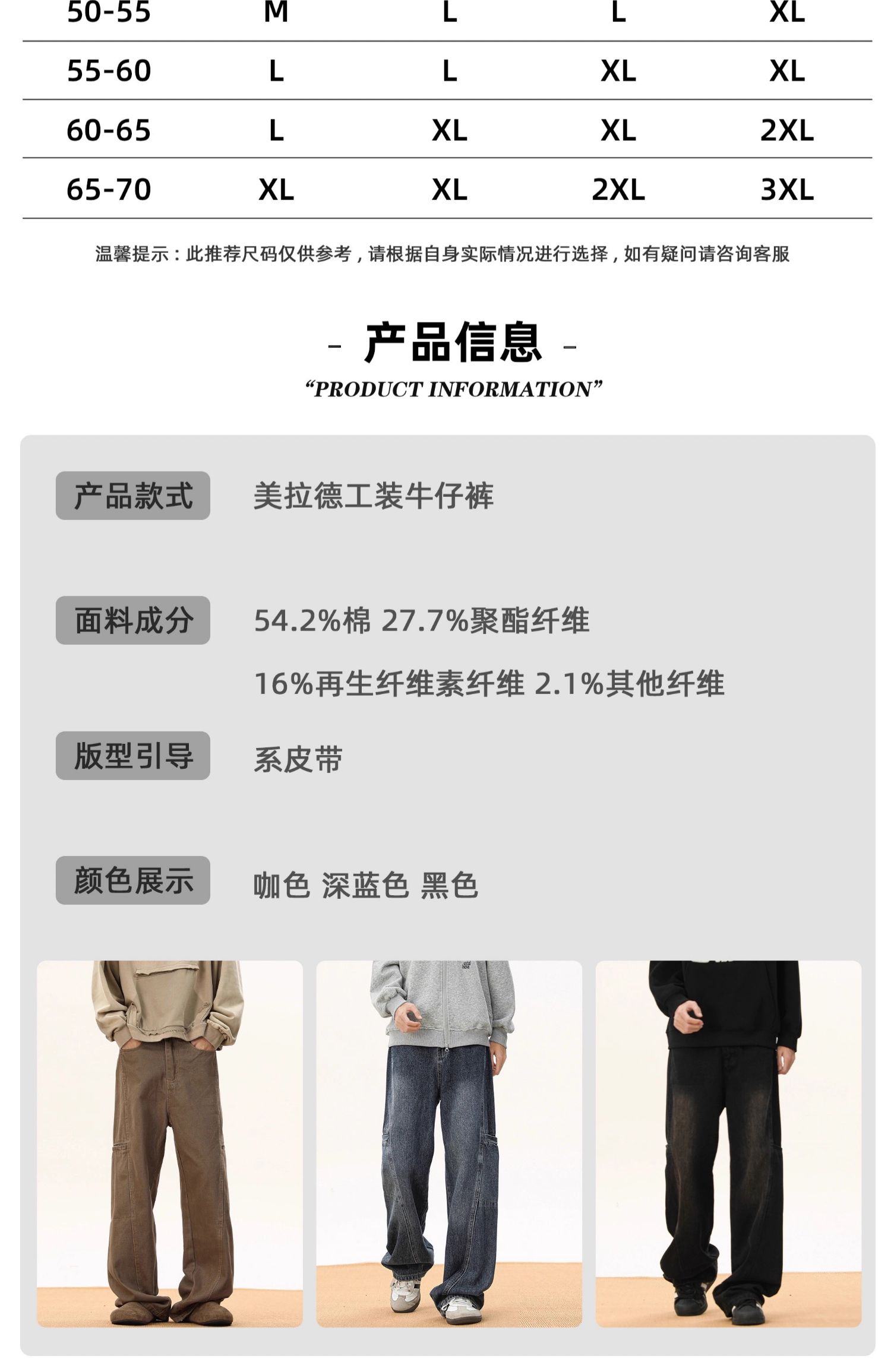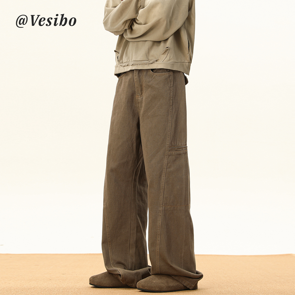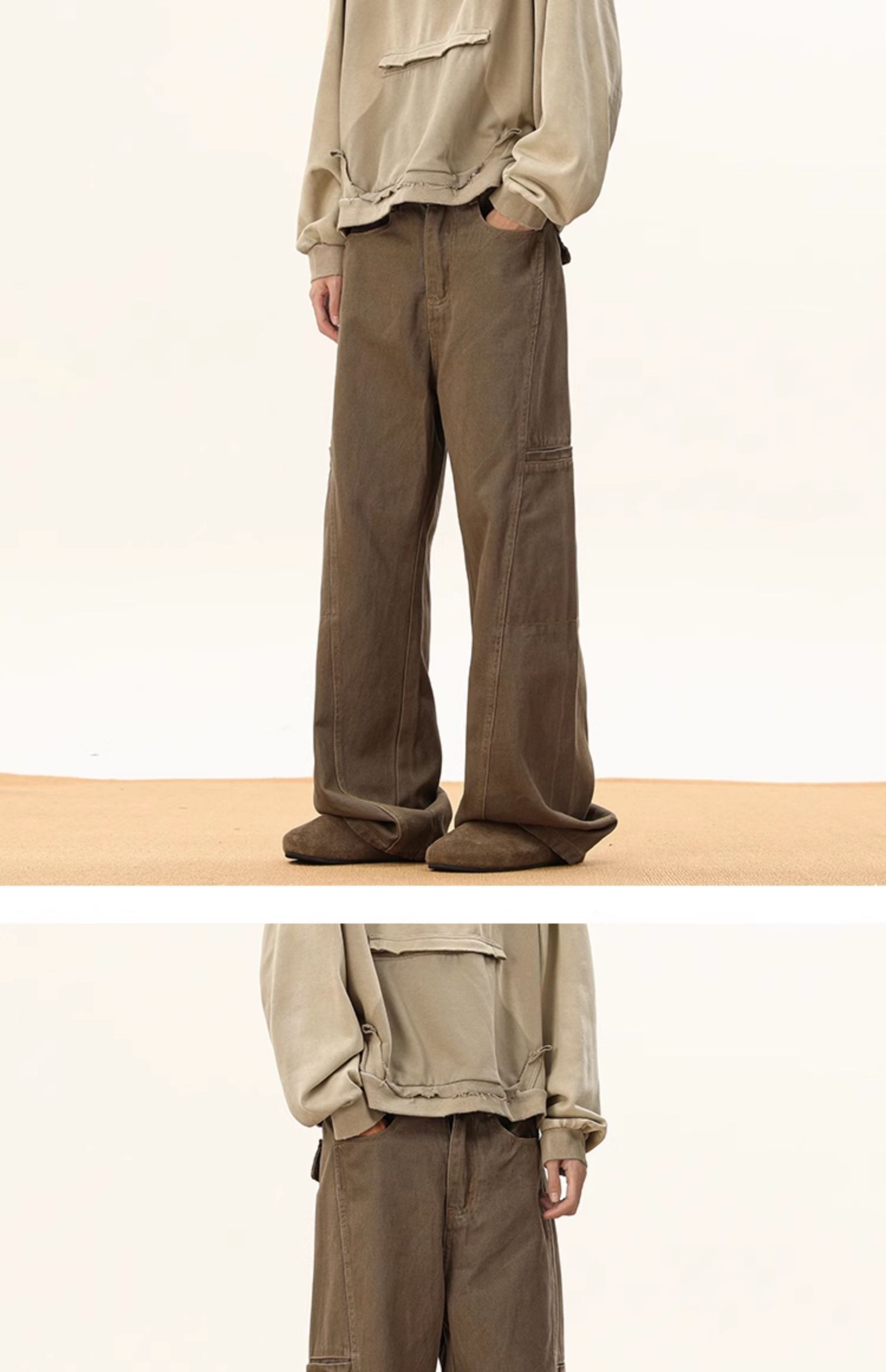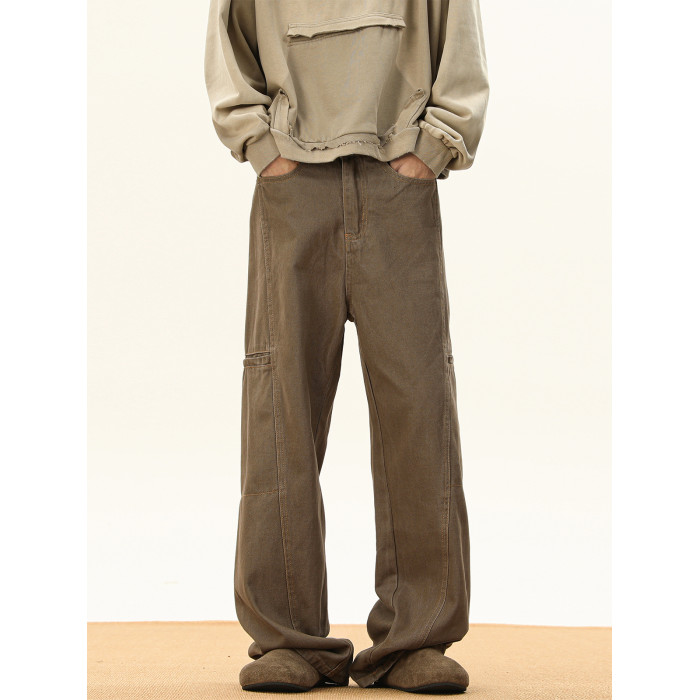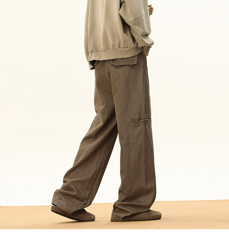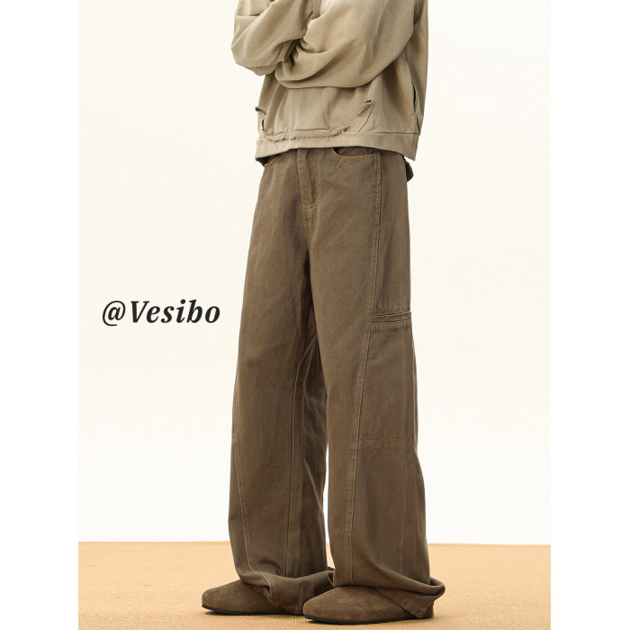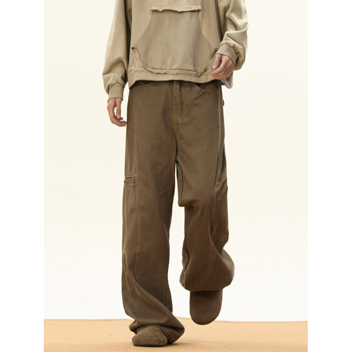 美拉德棕色牛仔褲男秋季潮牌做舊濶腿長褲高街設計感百搭工裝褲子