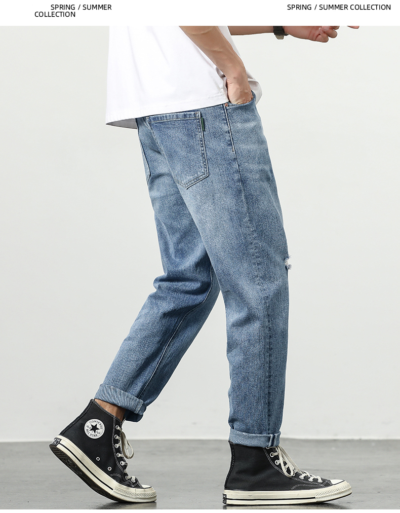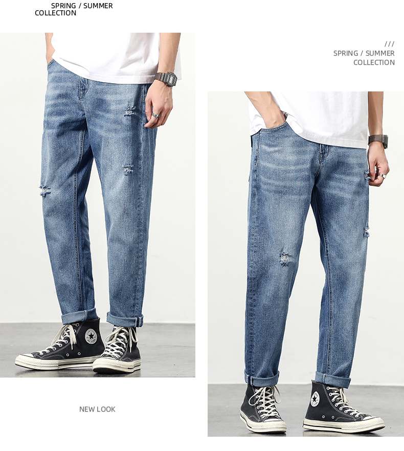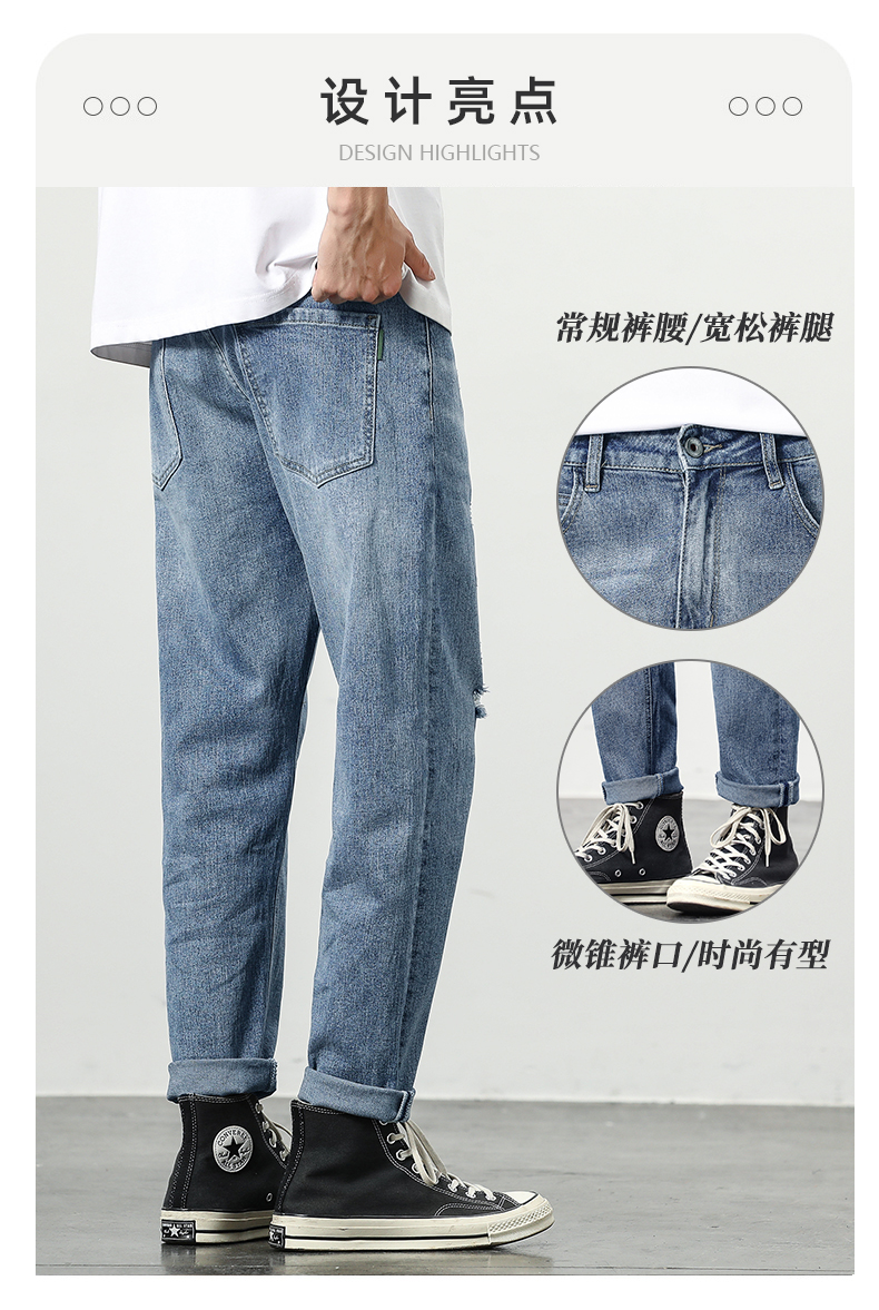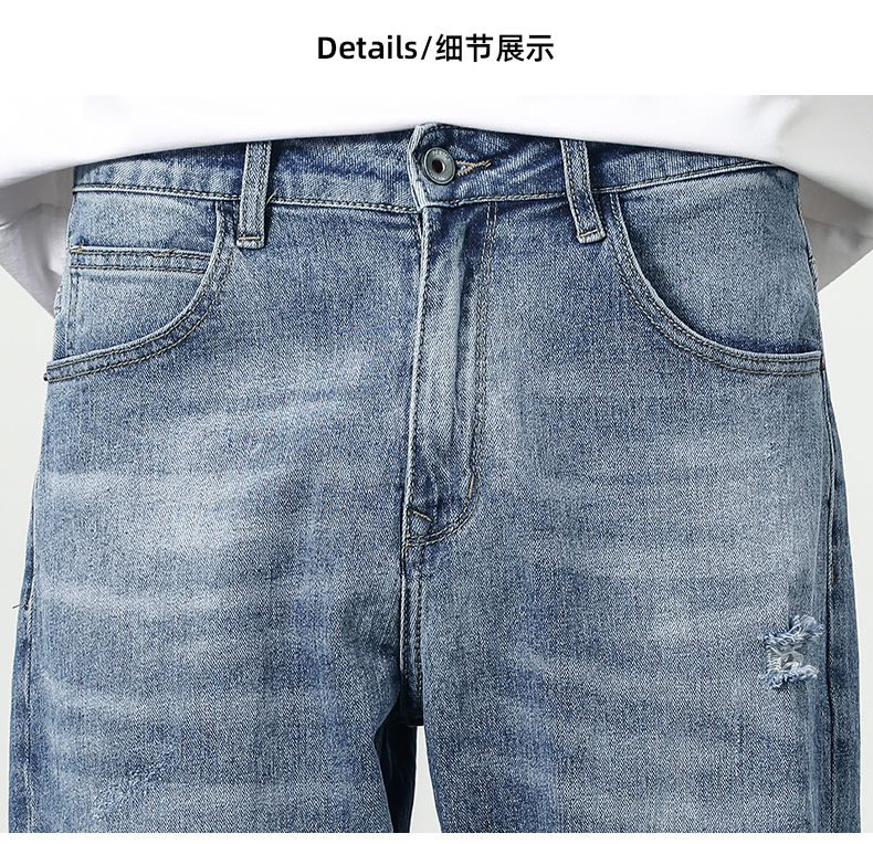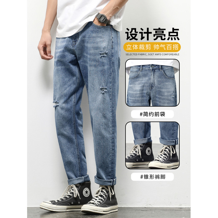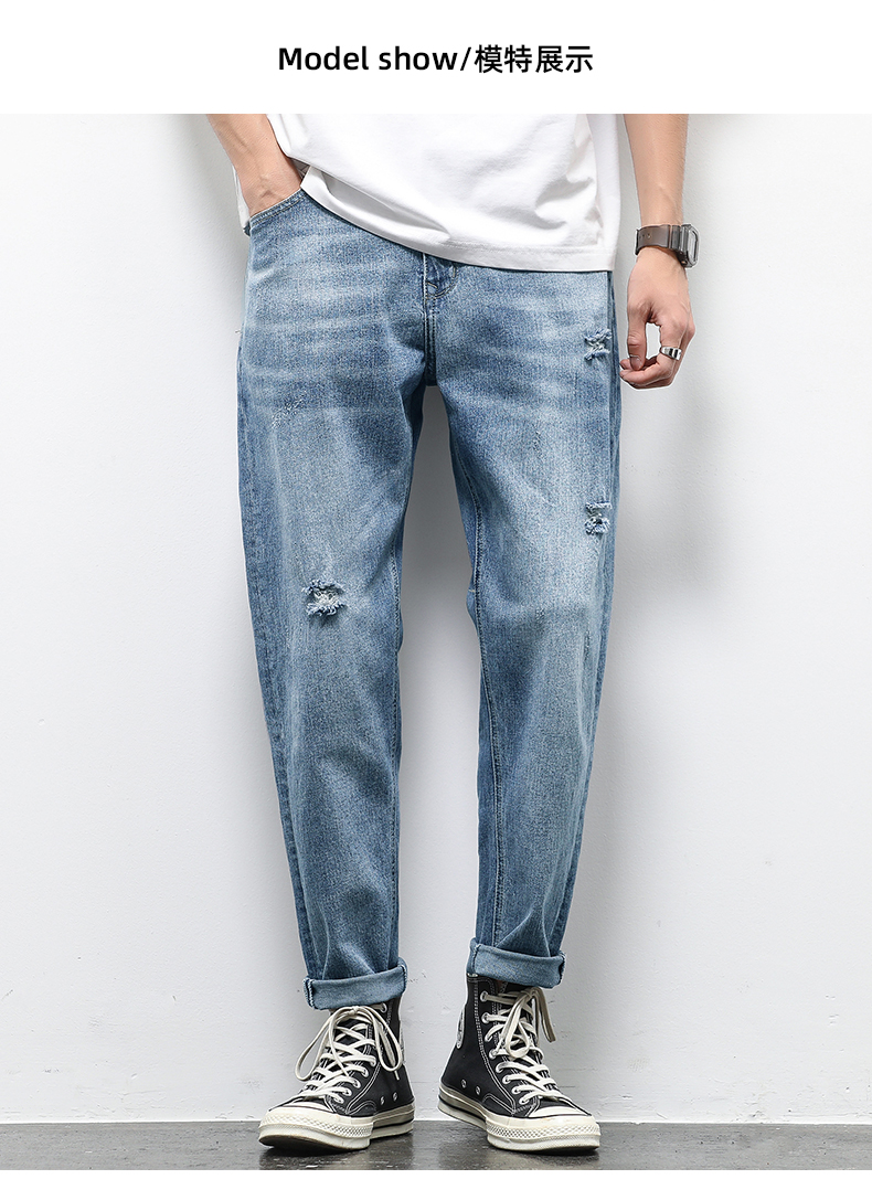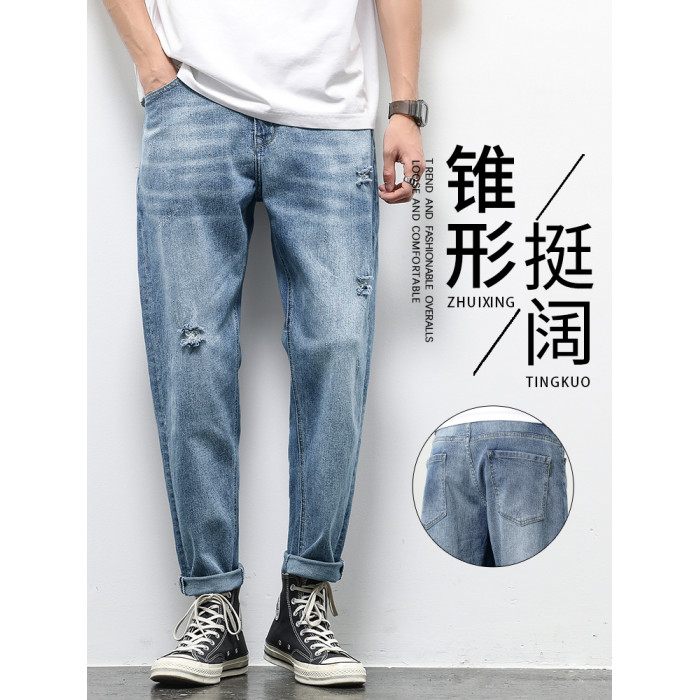 夏季薄款水洗淺色牛仔褲男寬松直筒破洞潮牌九分錐形長褲2025新款