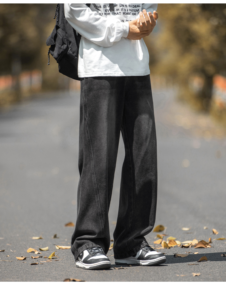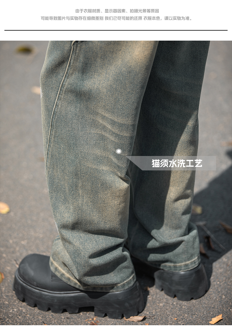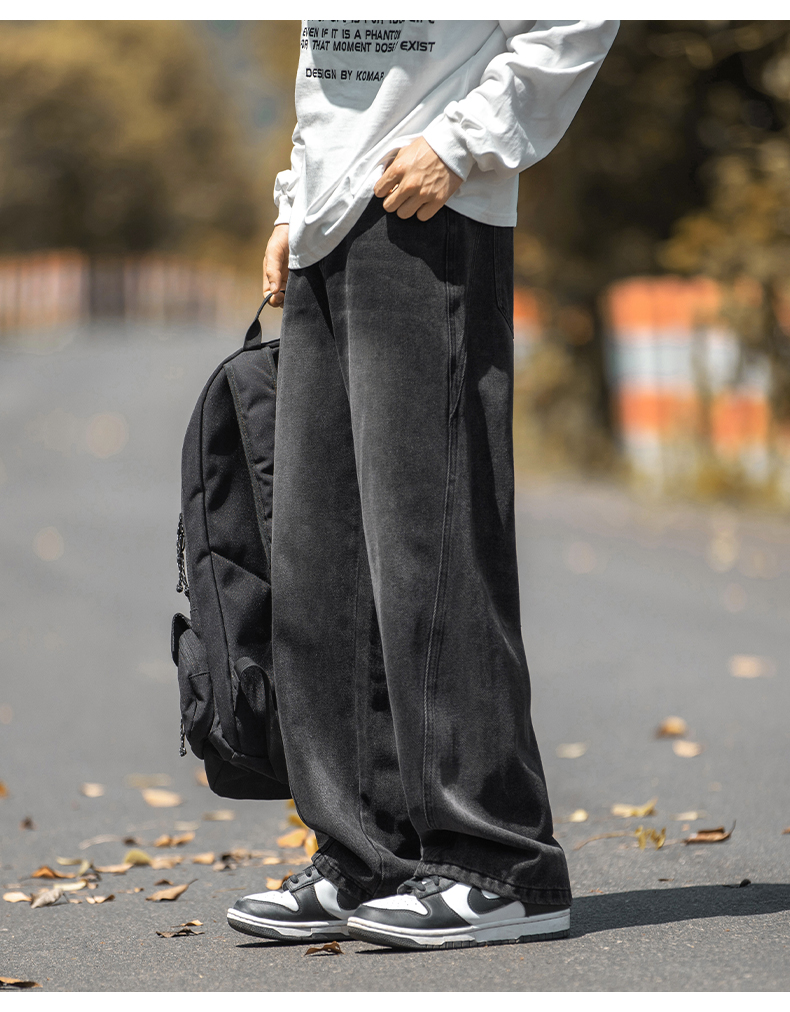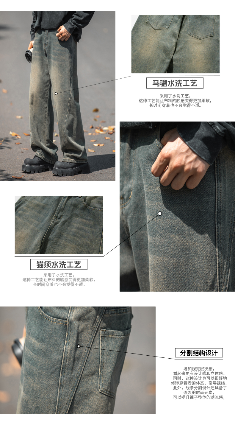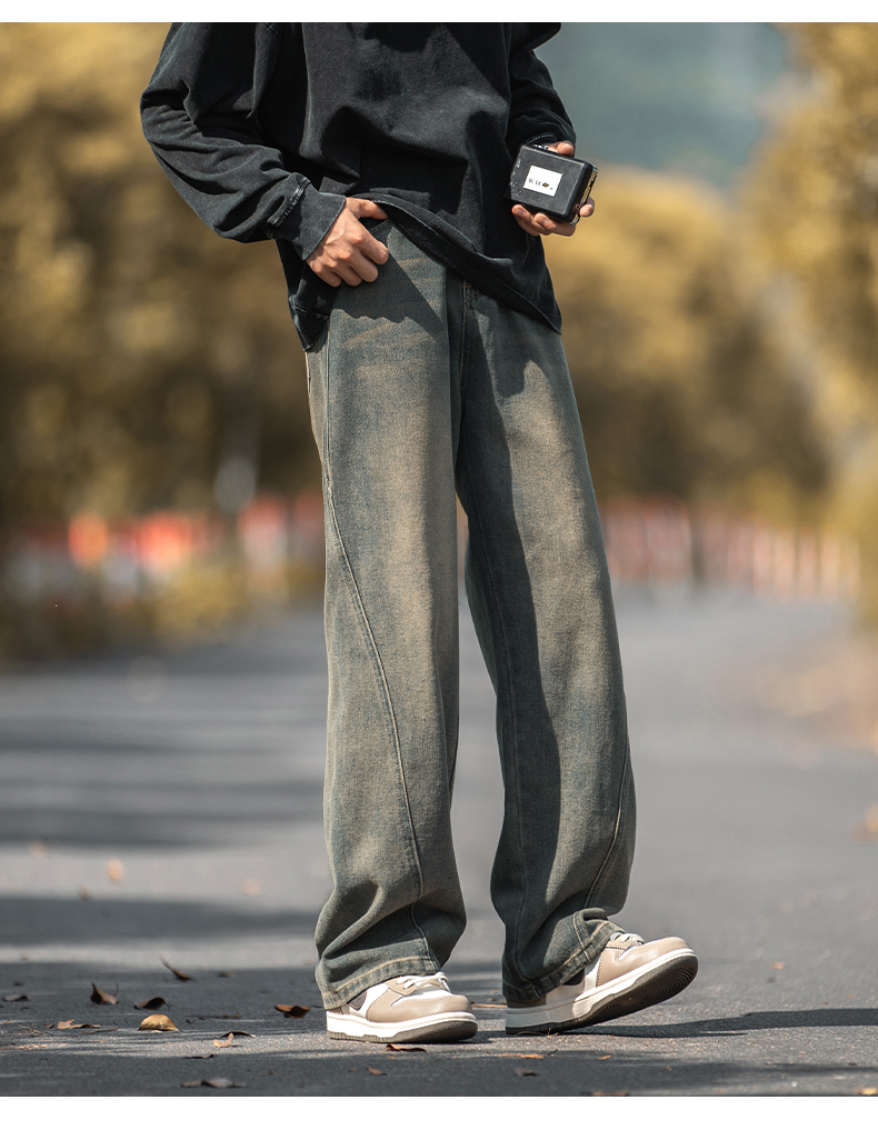 設計感復古水洗牛仔褲高街直筒寬松長褲秋季美式潮牌微濶褲子男款