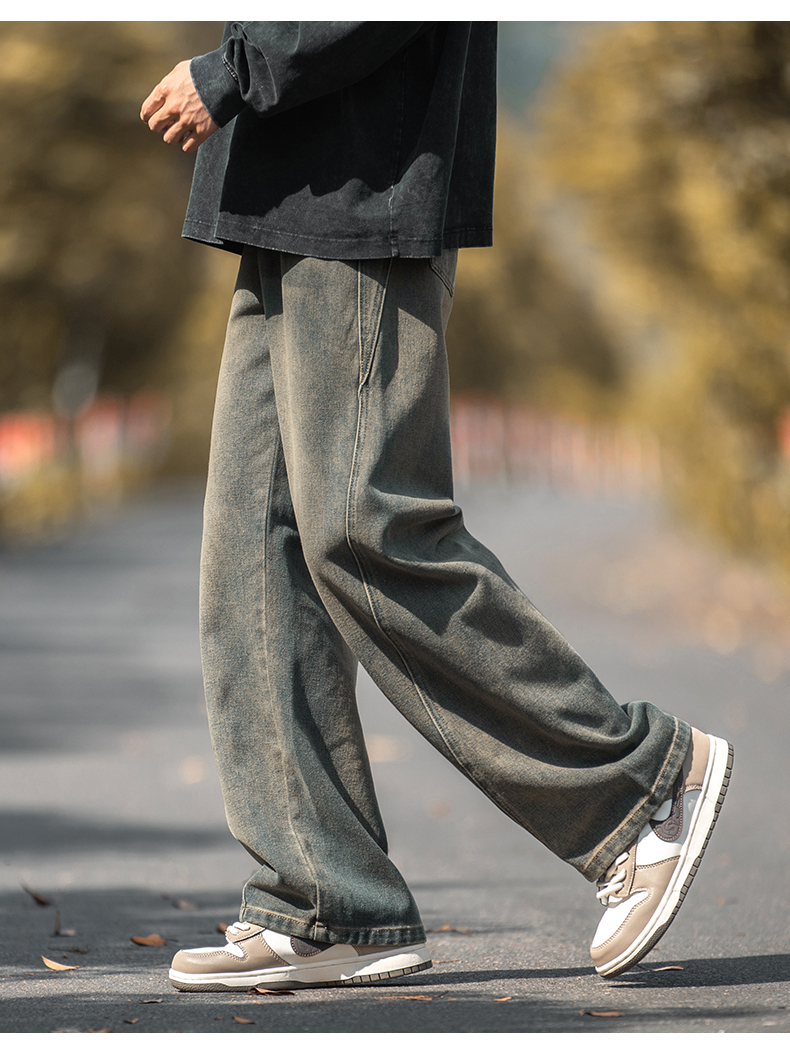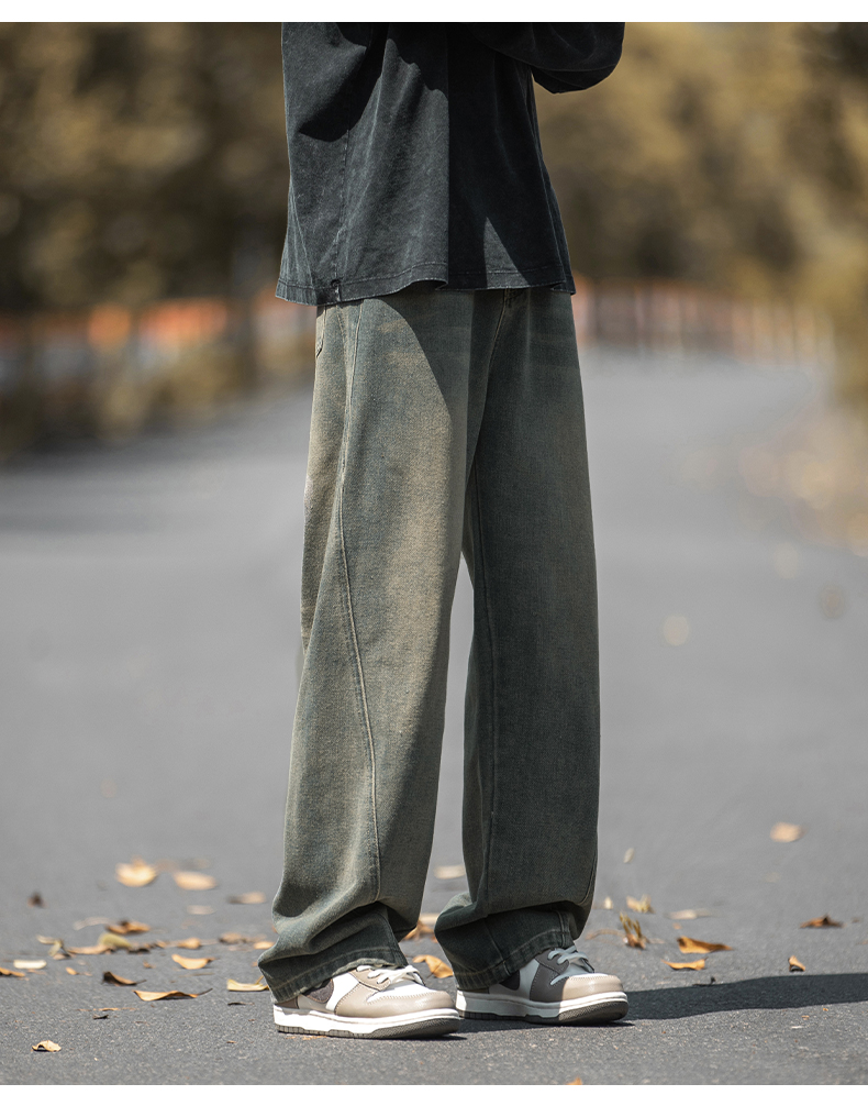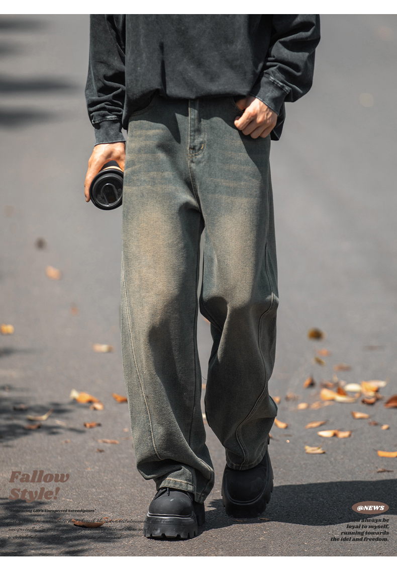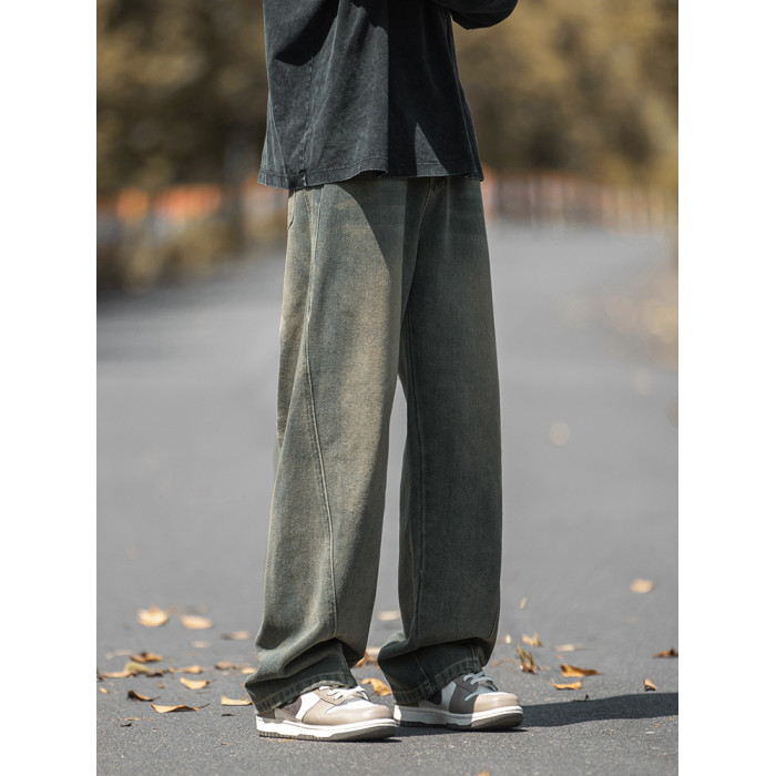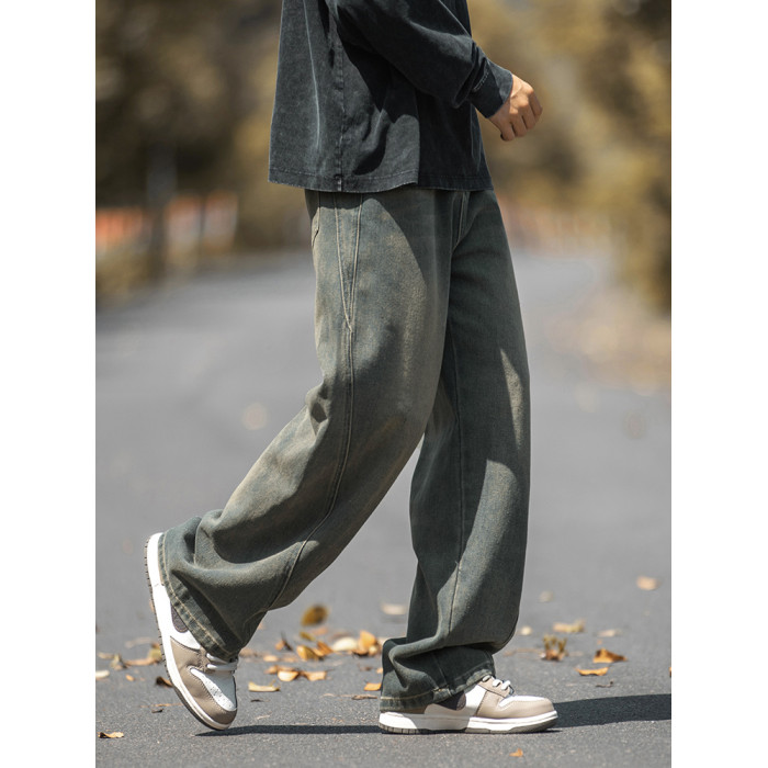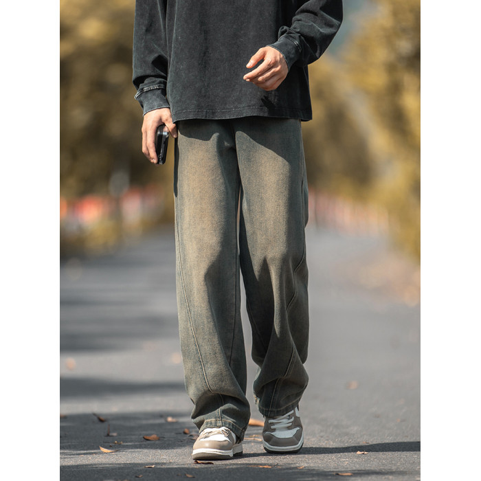 設計感復古水洗牛仔褲高街直筒寬松長褲秋季美式潮牌微濶褲子男款