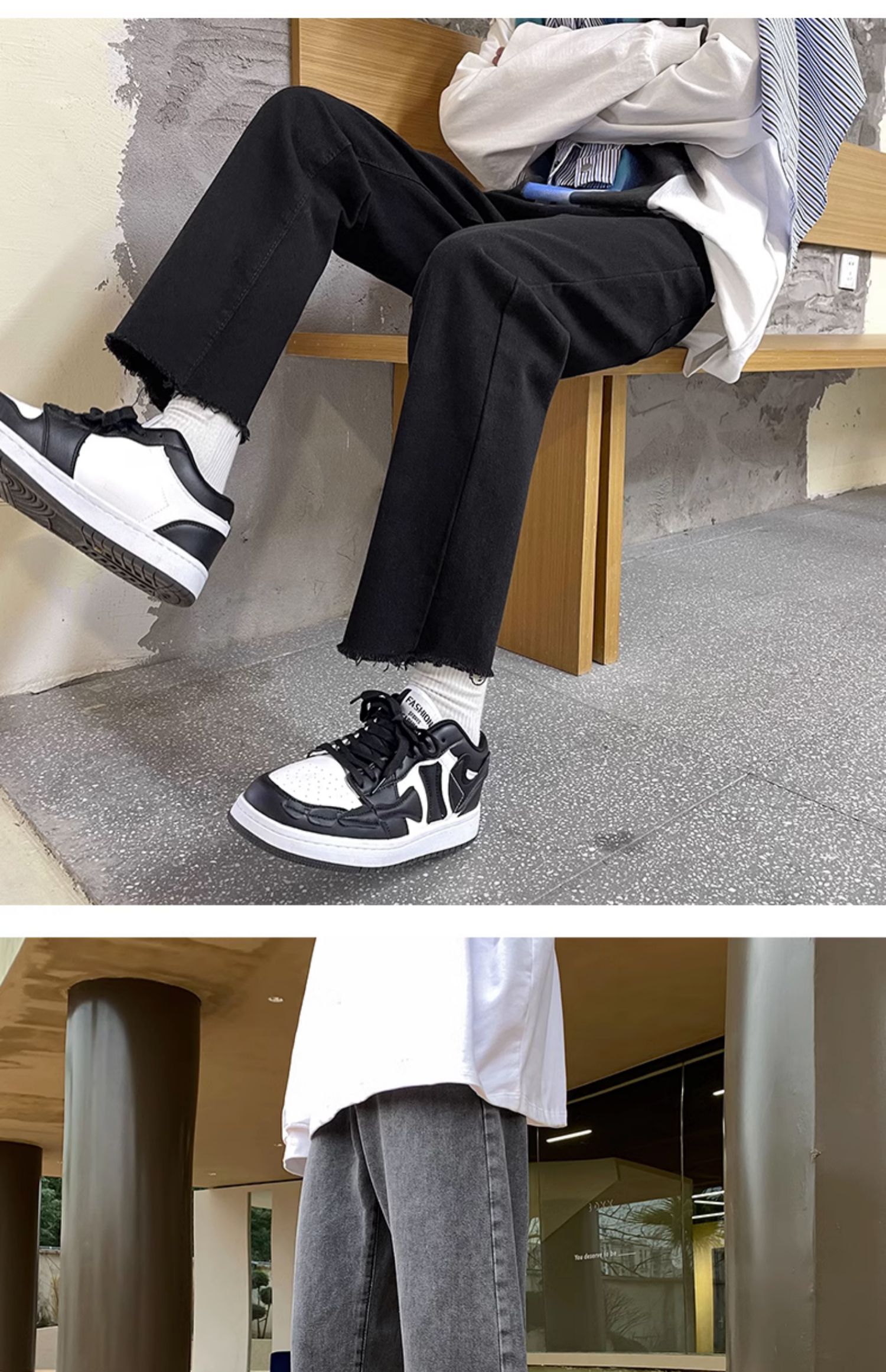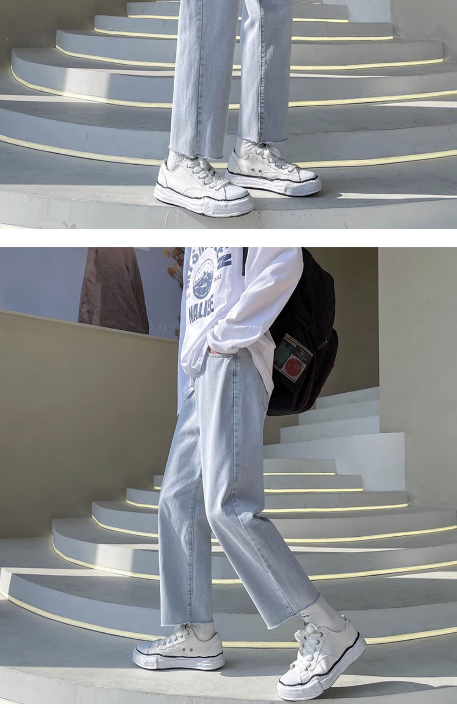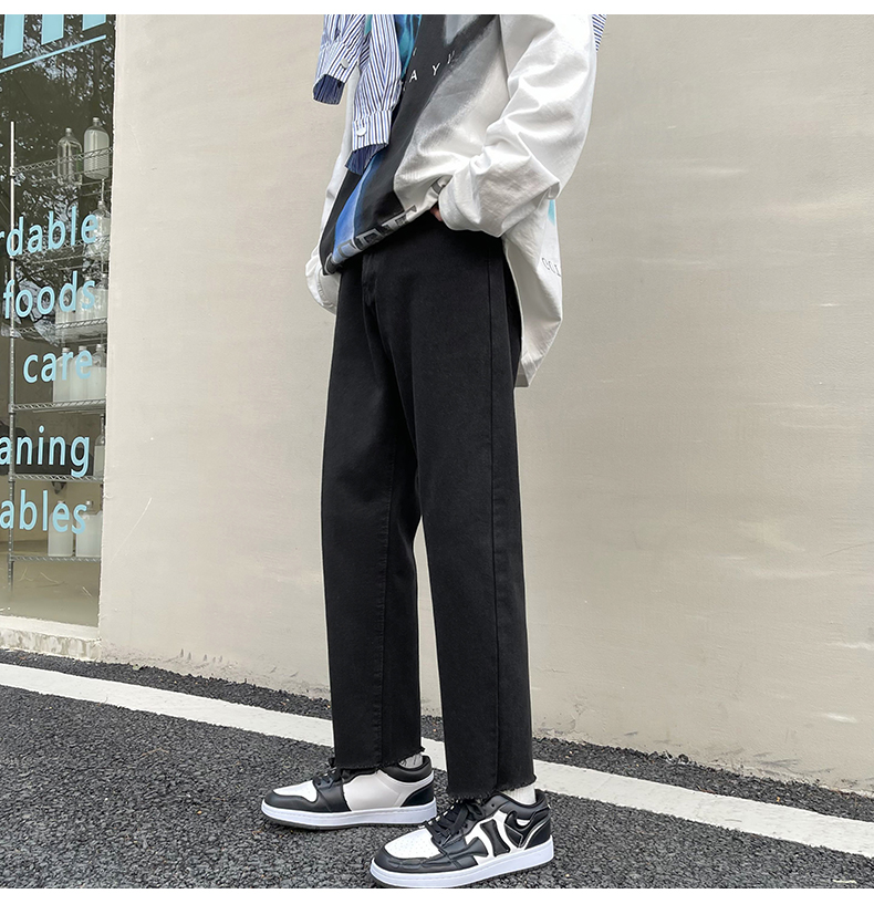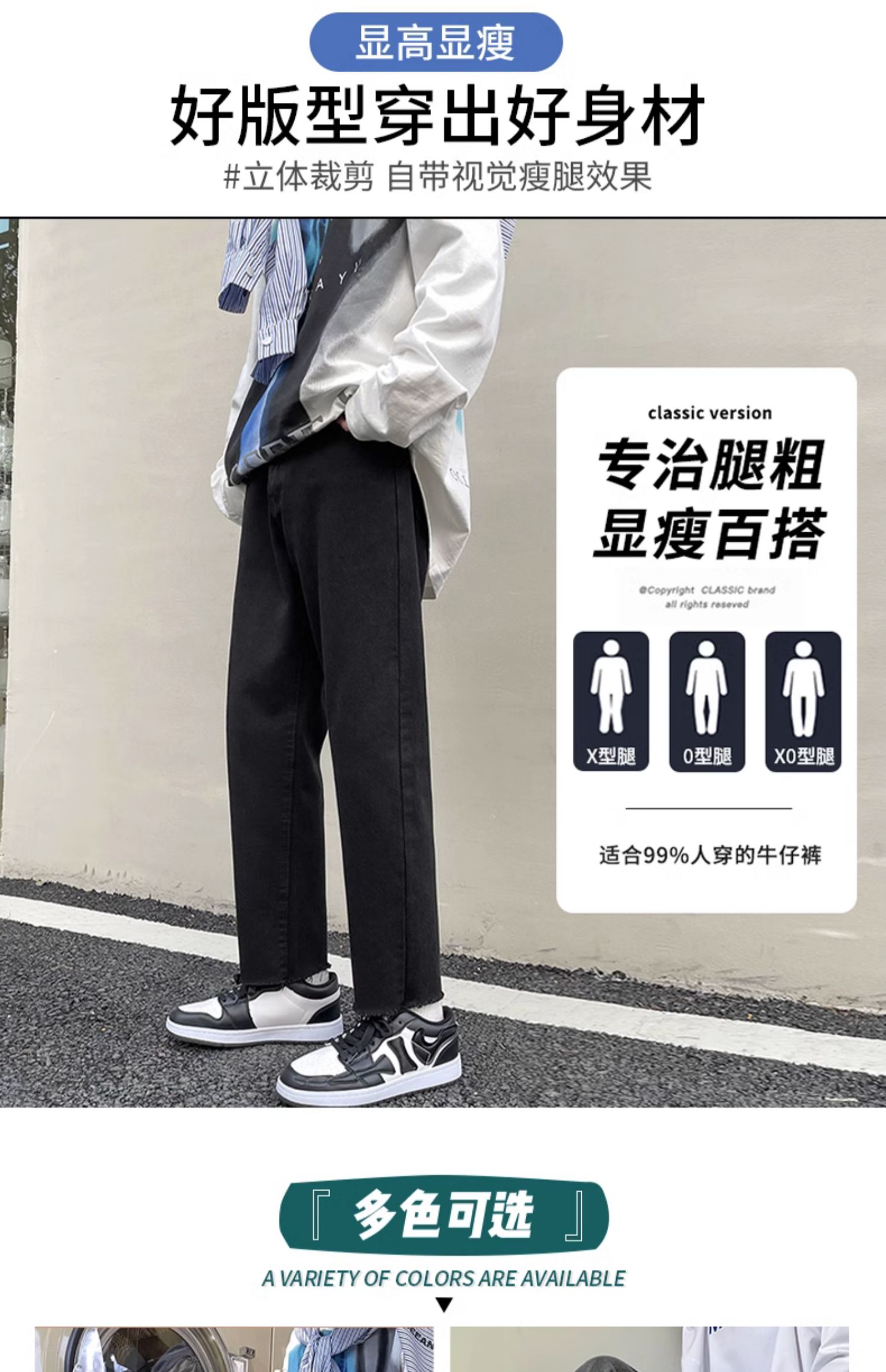 2025學生黑色牛仔褲男毛邊直筒九分褲休閒百搭修身潮牌秋季褲子男