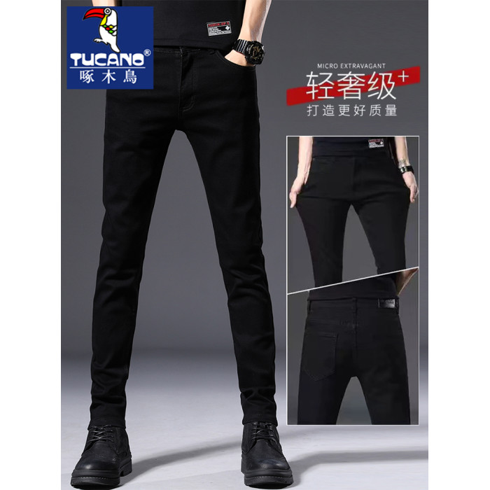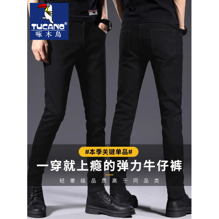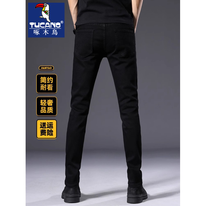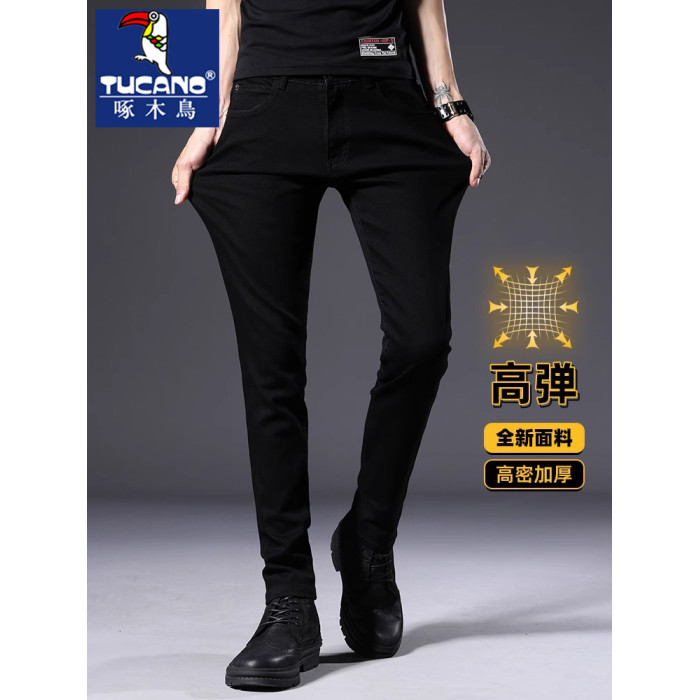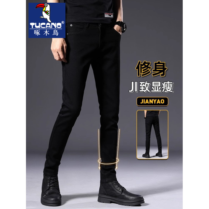 啄木鳥秋冬加絨褲子男士韓版彈力修身小腳秋冬款潮牌黑色牛仔褲男