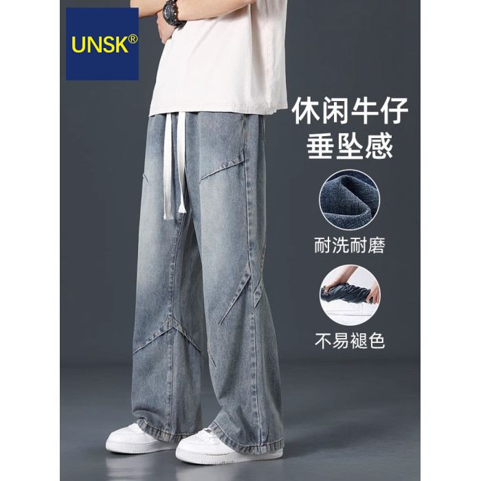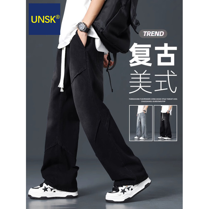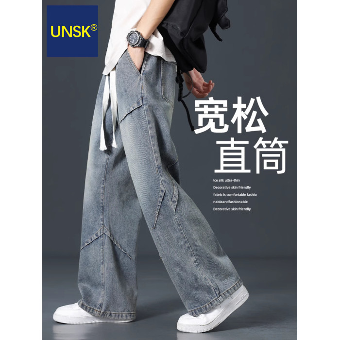 潮牌牛仔褲男士春秋冬季加絨加厚2025新款美式濶腿寬松直筒長褲子