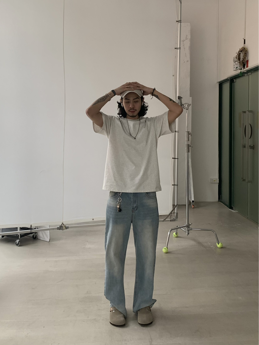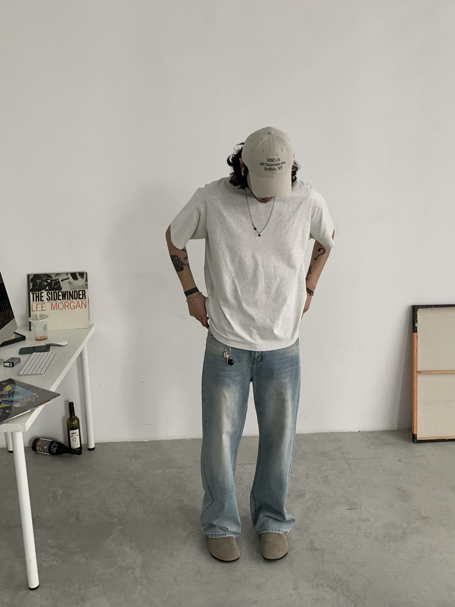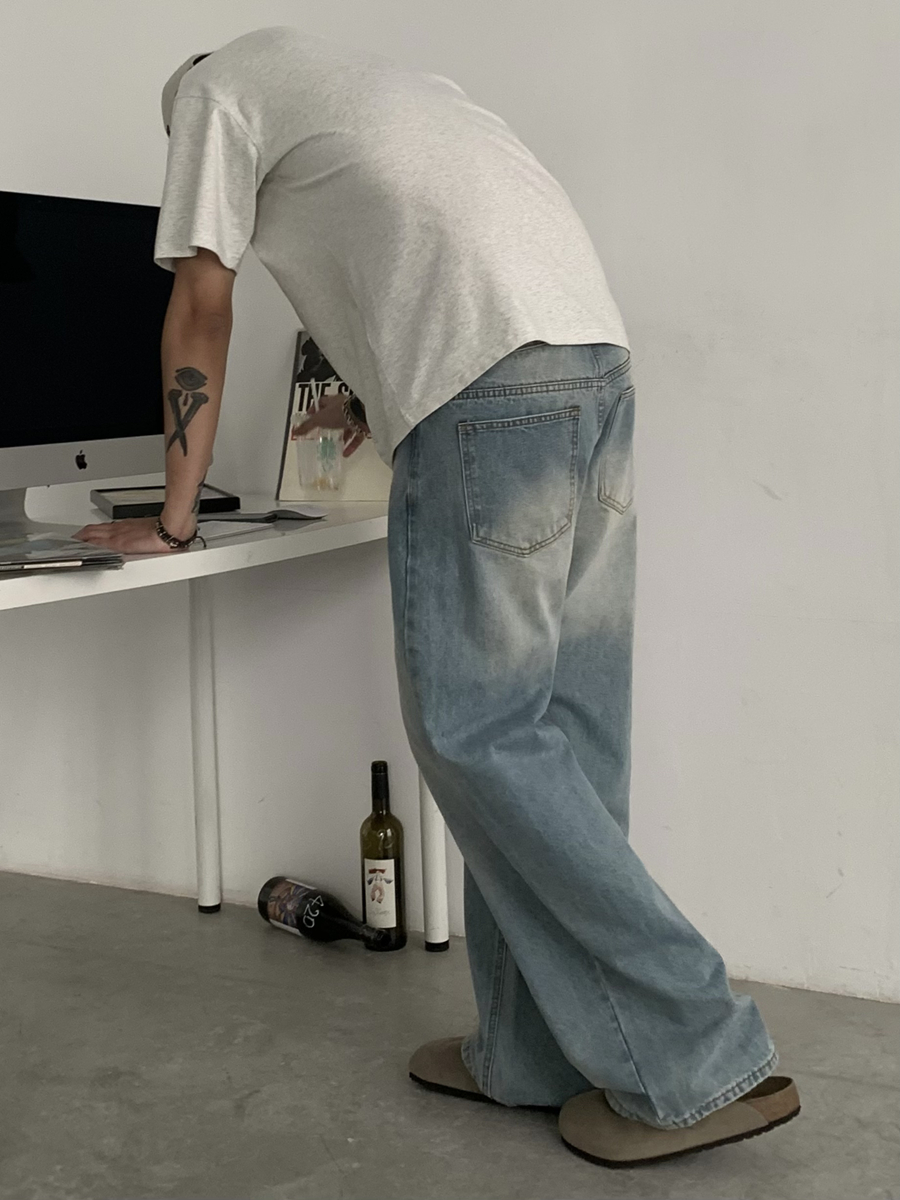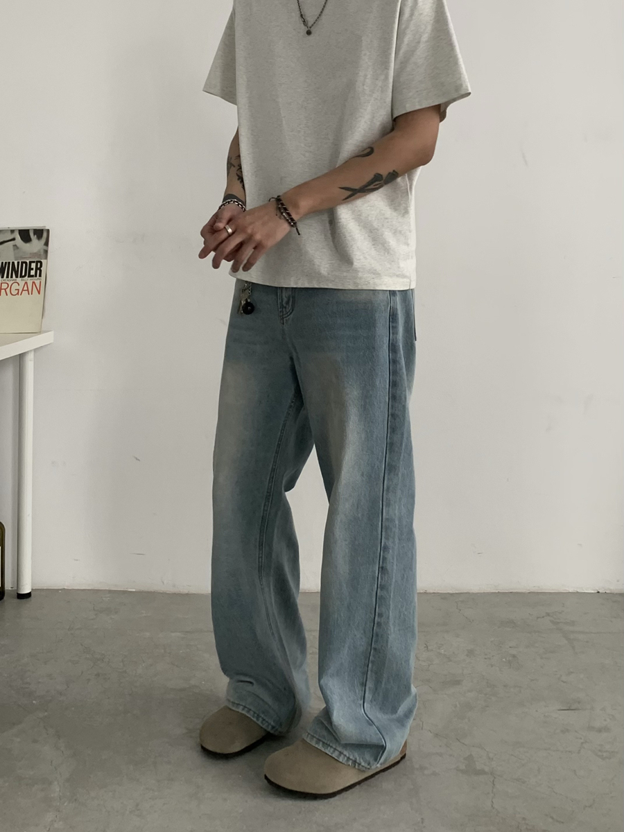 美式高街復古vintage水洗直筒淺藍色牛仔褲男女cleanfit長褲子潮