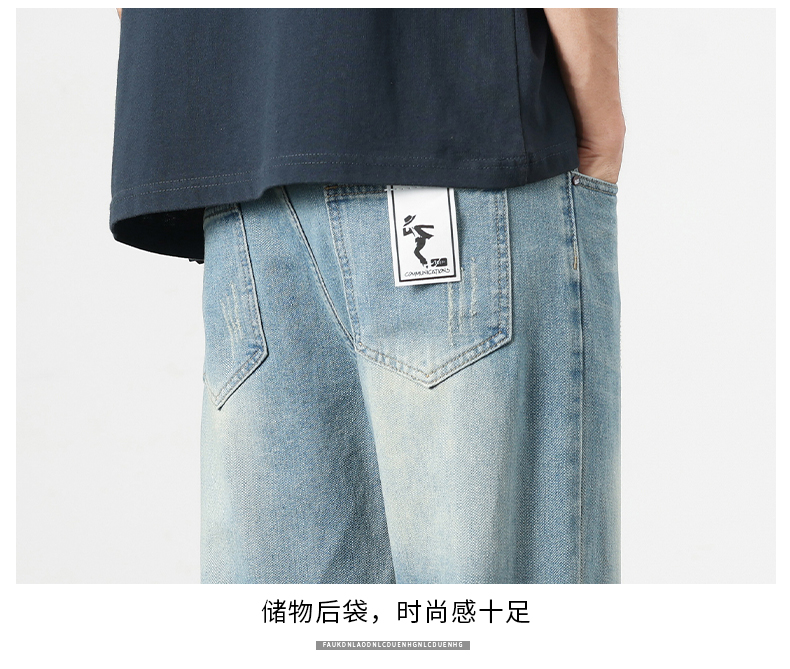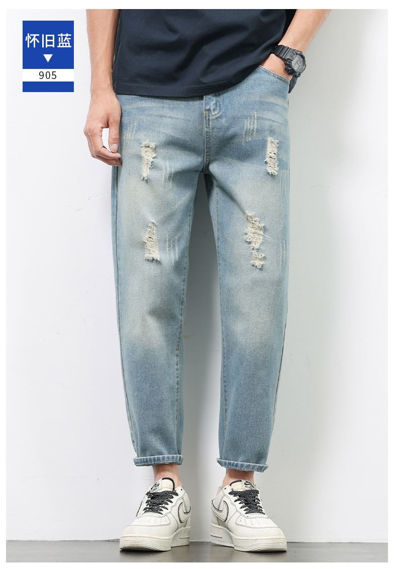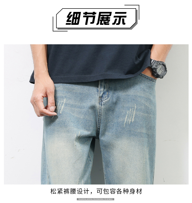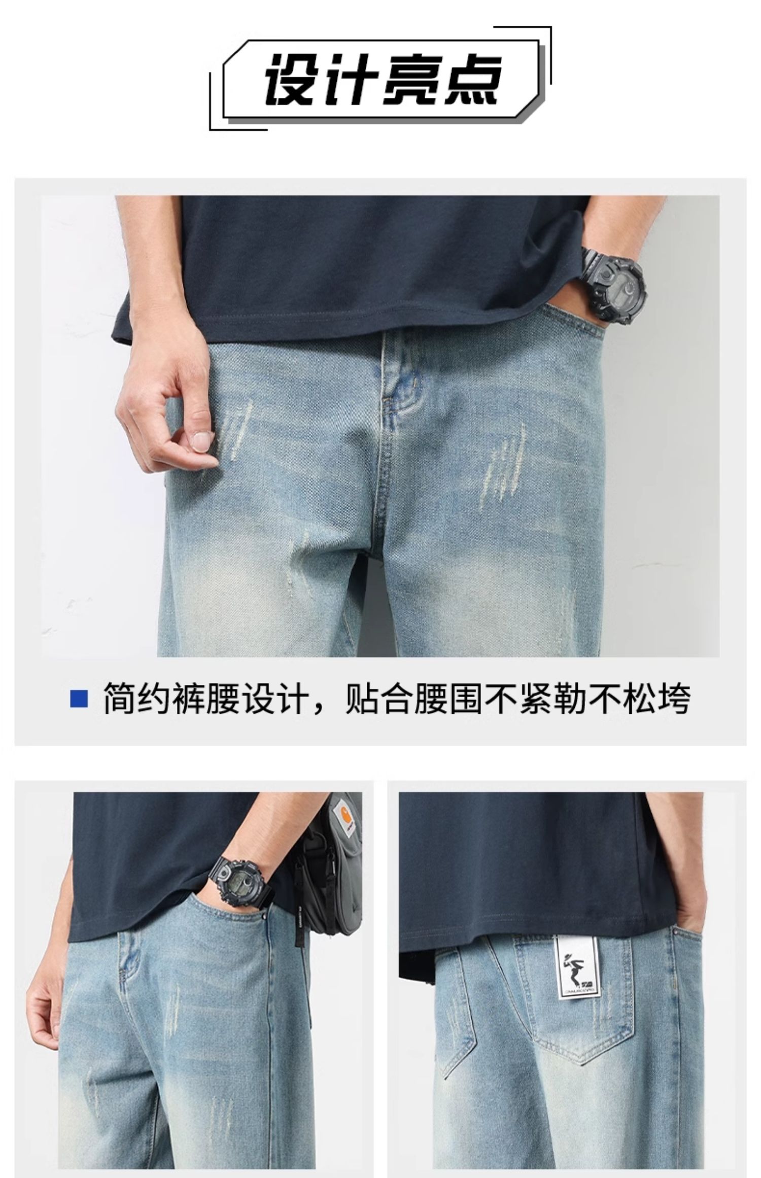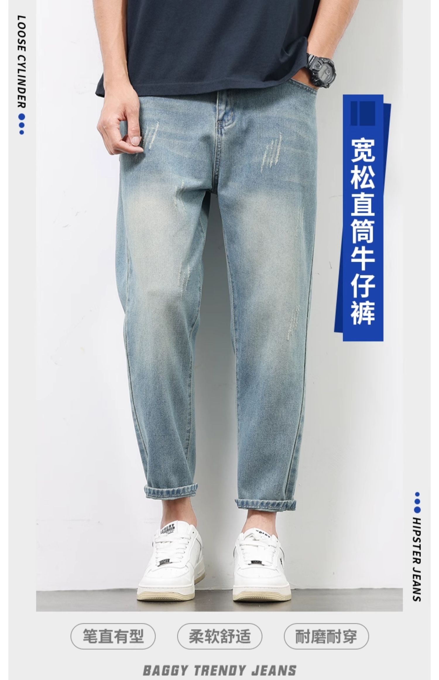 2025春秋季美式高街牛仔褲男款新款水洗寬松直筒休閒破洞九分褲子