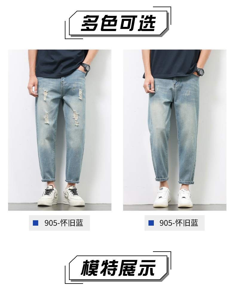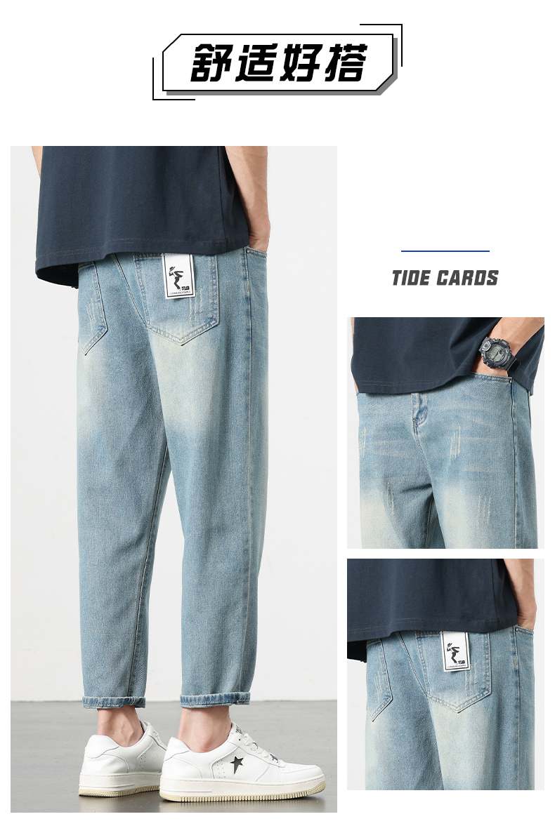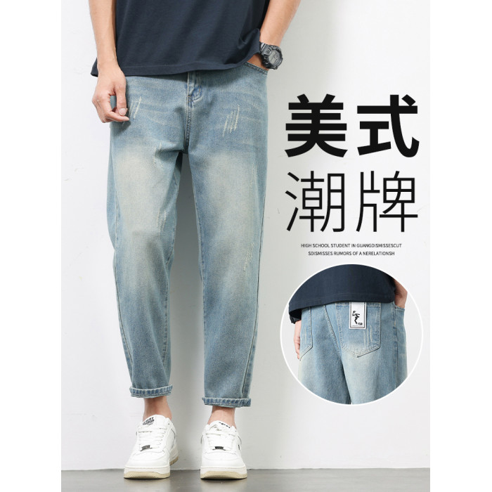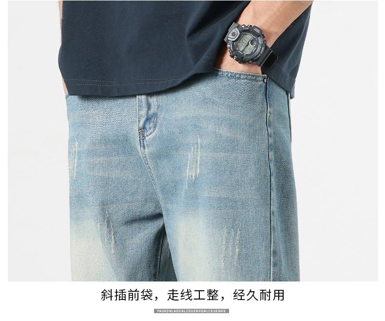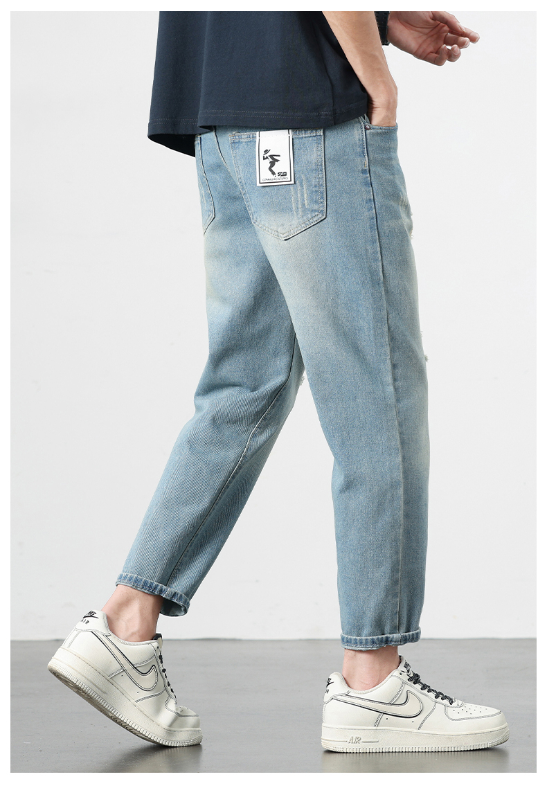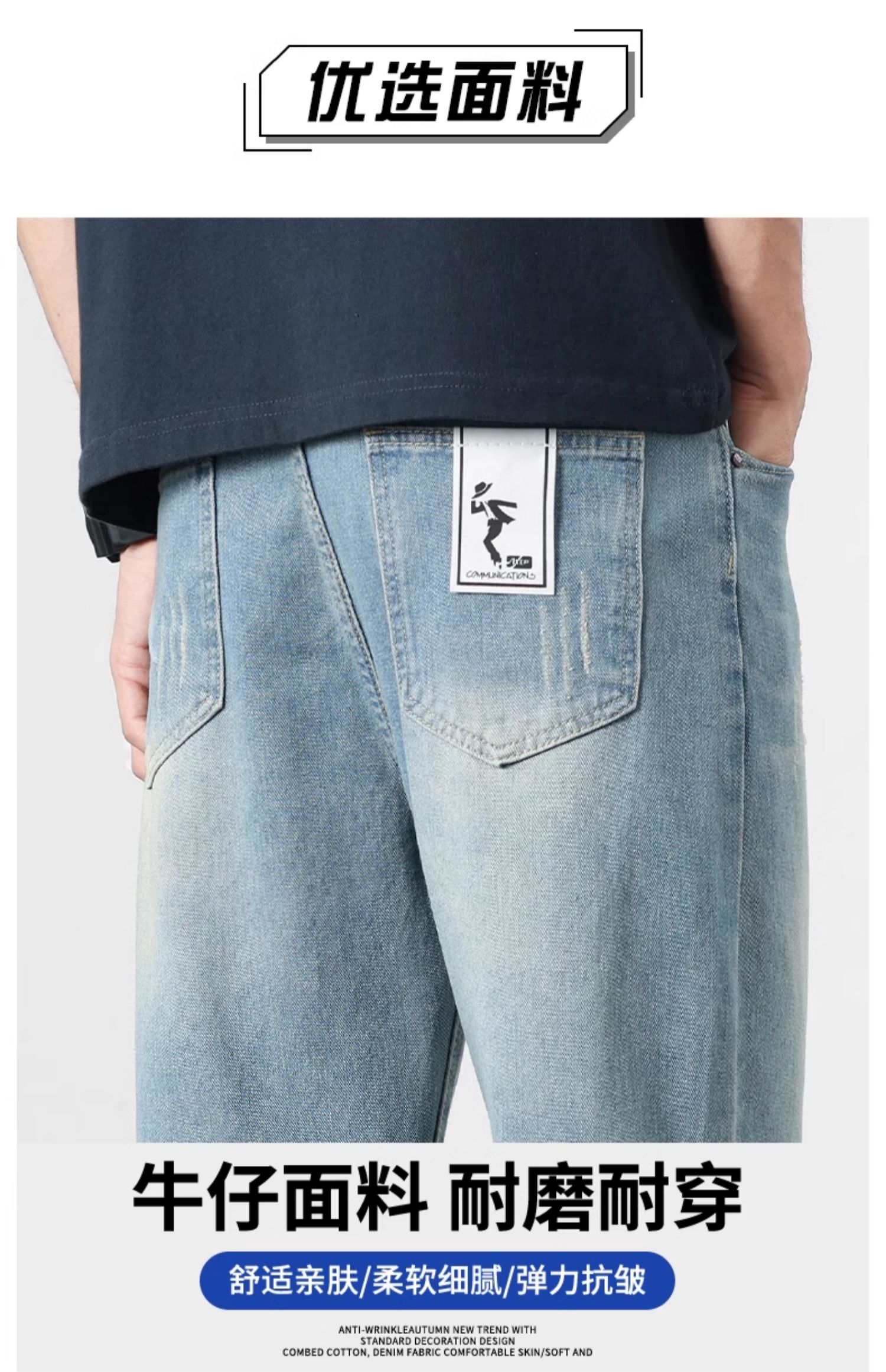 2025春秋季美式高街牛仔褲男款新款水洗寬松直筒休閒破洞九分褲子