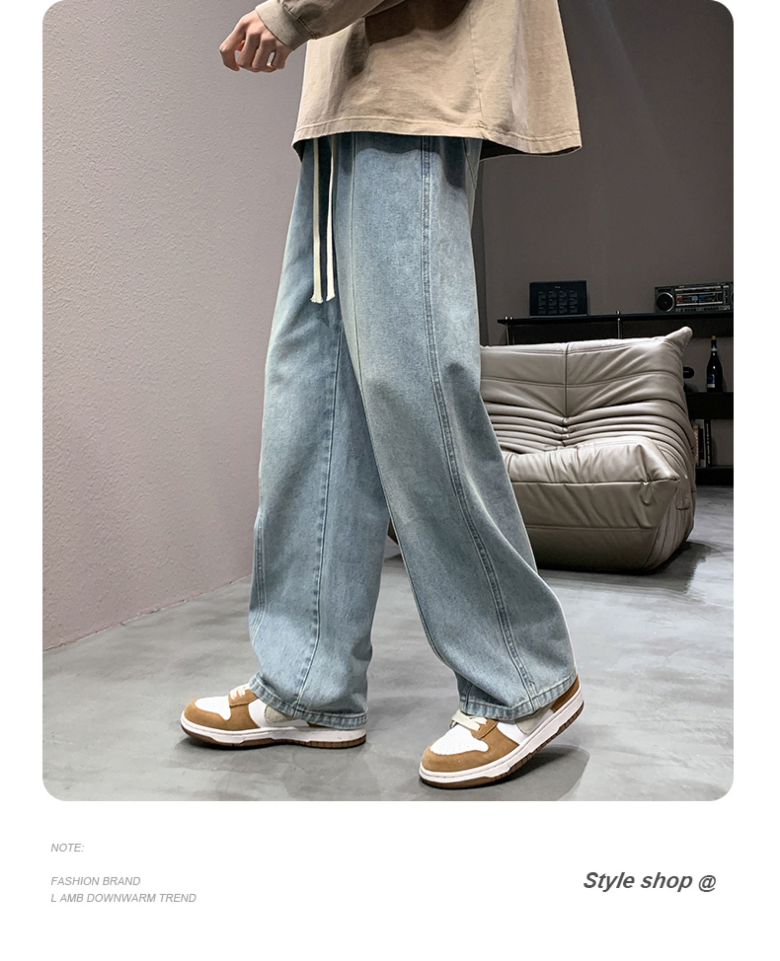 黃泥色牛仔褲男秋冬加絨寬松直筒褲濶腿潮牌美式高街vibe褲子男生
