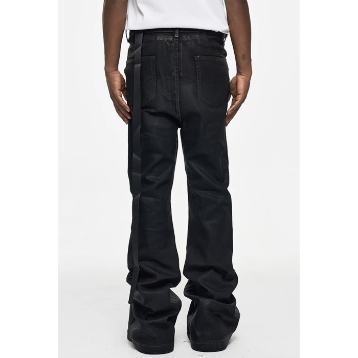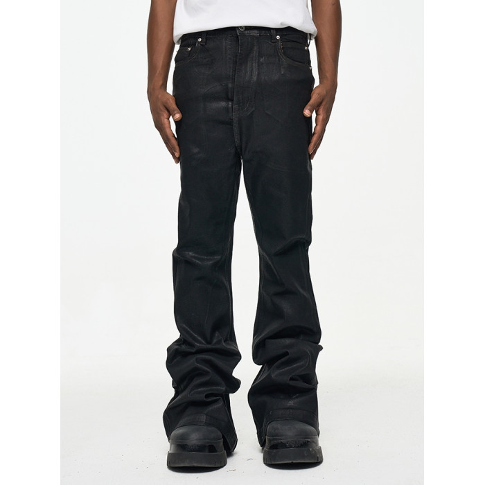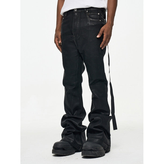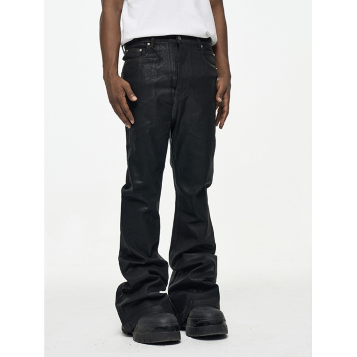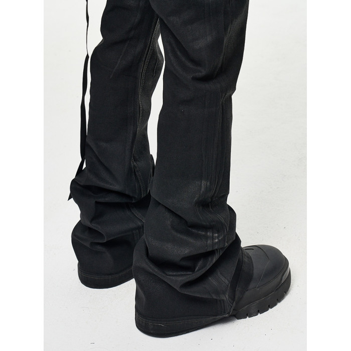 CWHAT高街RO風塗層刷膠微喇叭拖地牛仔褲男潮牌寬松微彈上蠟褲子