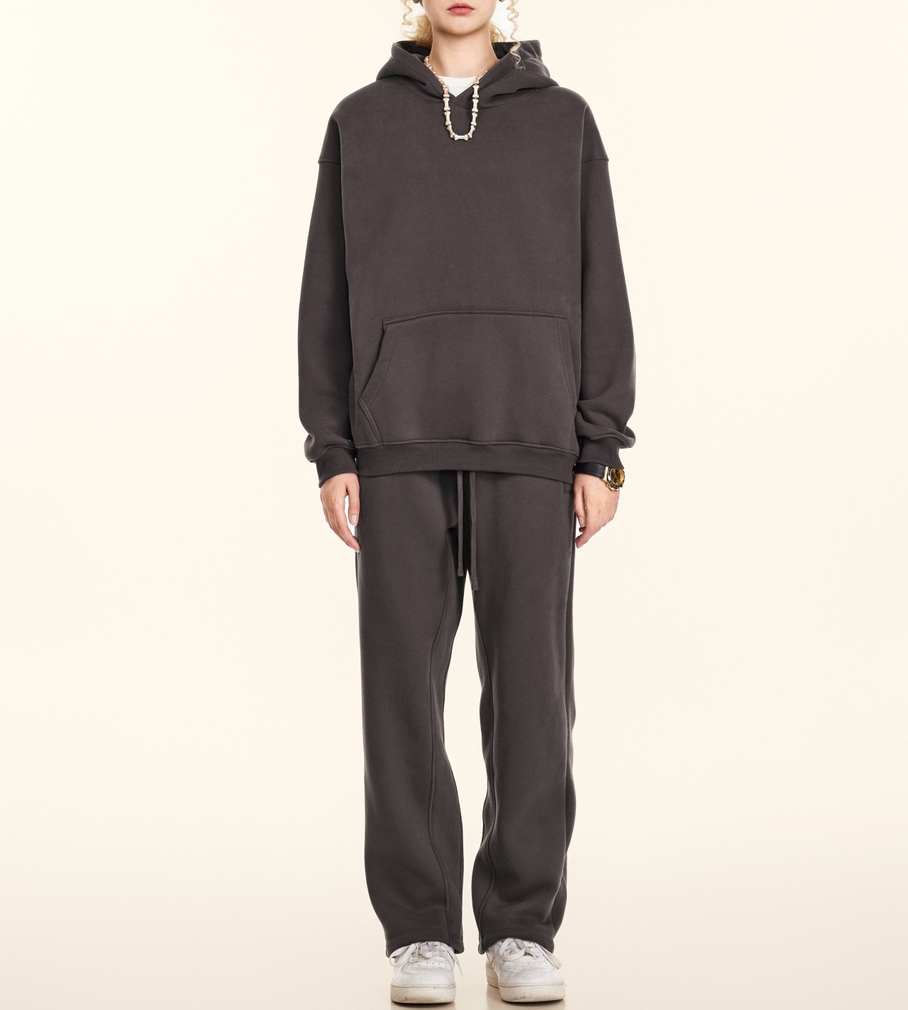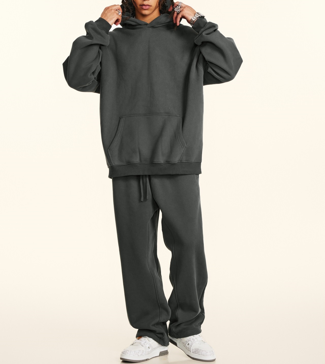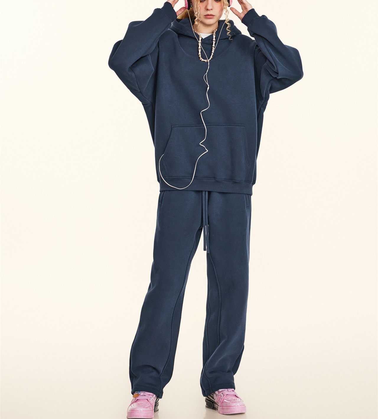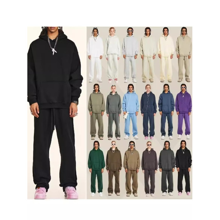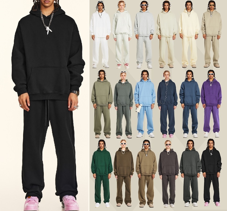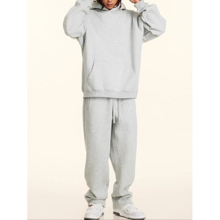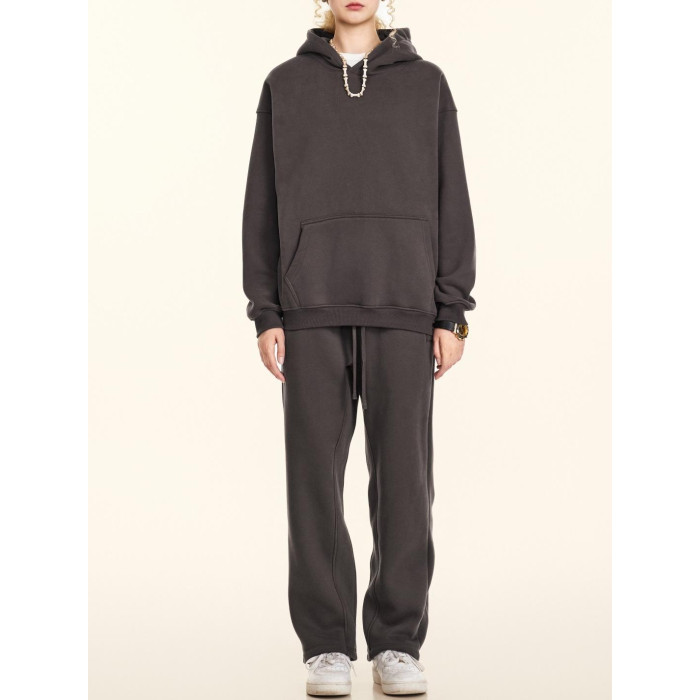 2025秋冬休閒純色美式加絨連帽衛衣兩件套裝寬松衛褲男女oversize