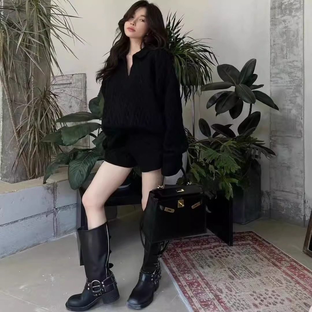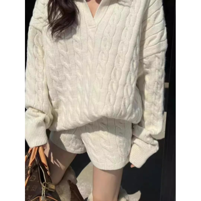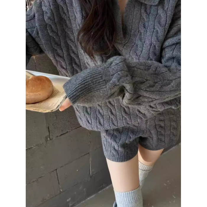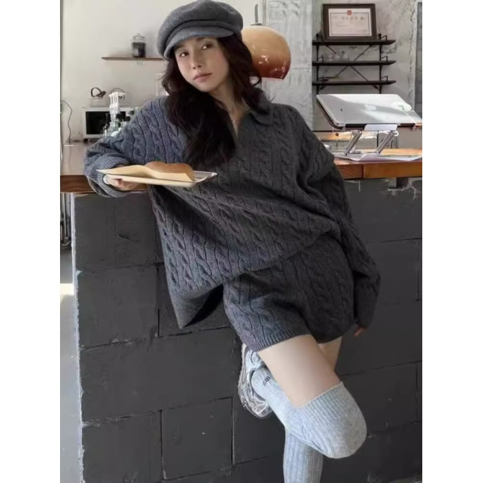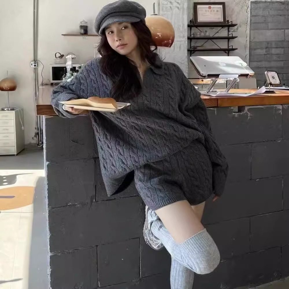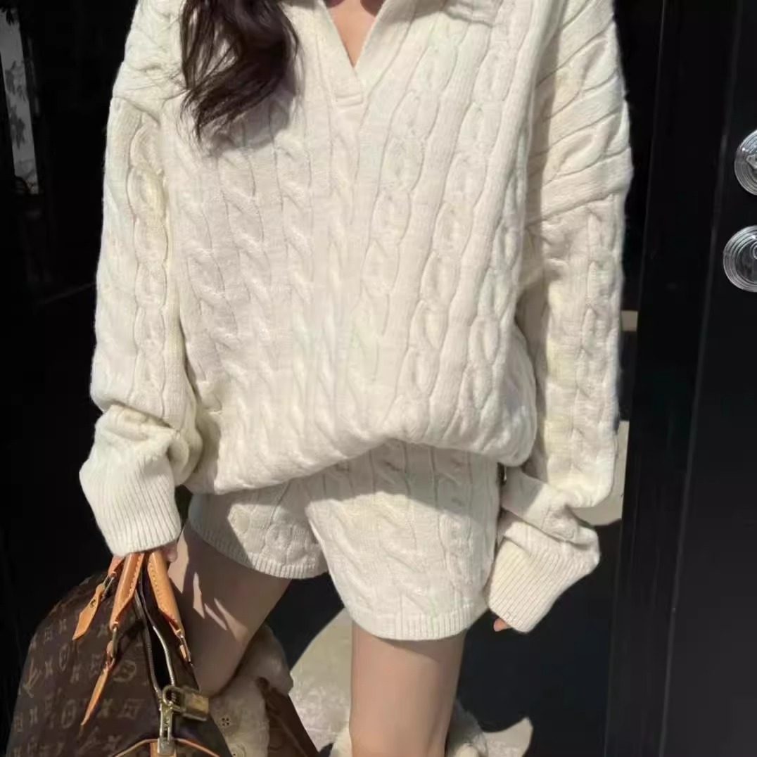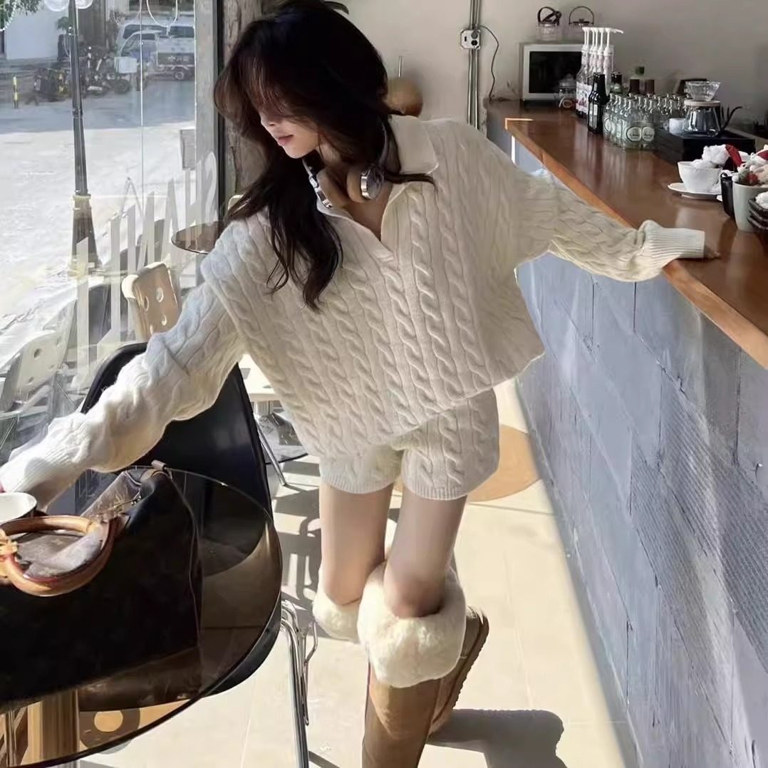 韓系POLO領麻花毛衣短褲兩件套裝女冬寬松慵懶風針織上衣時尚套裝