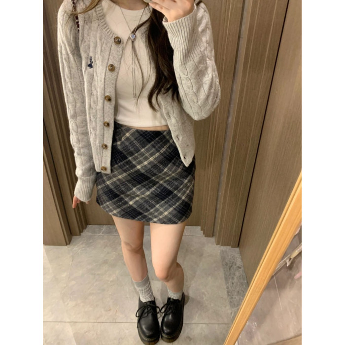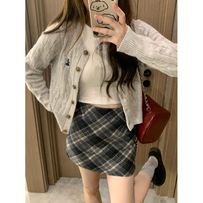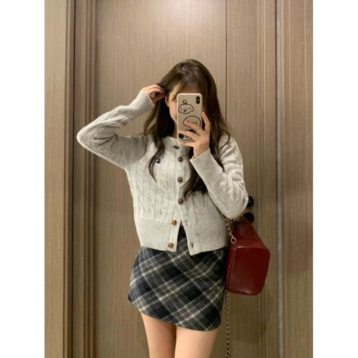 灰色新款韓系粗麻花刺綉針織開衫女2025早秋季學院風短款外套上衣