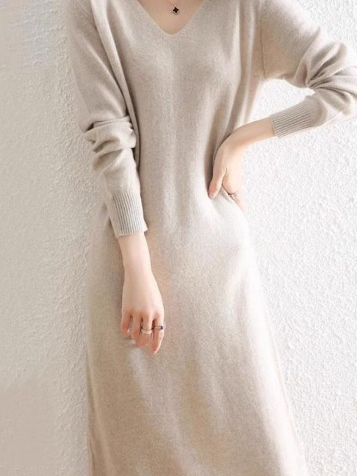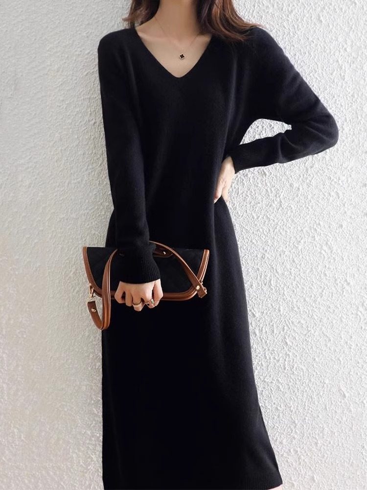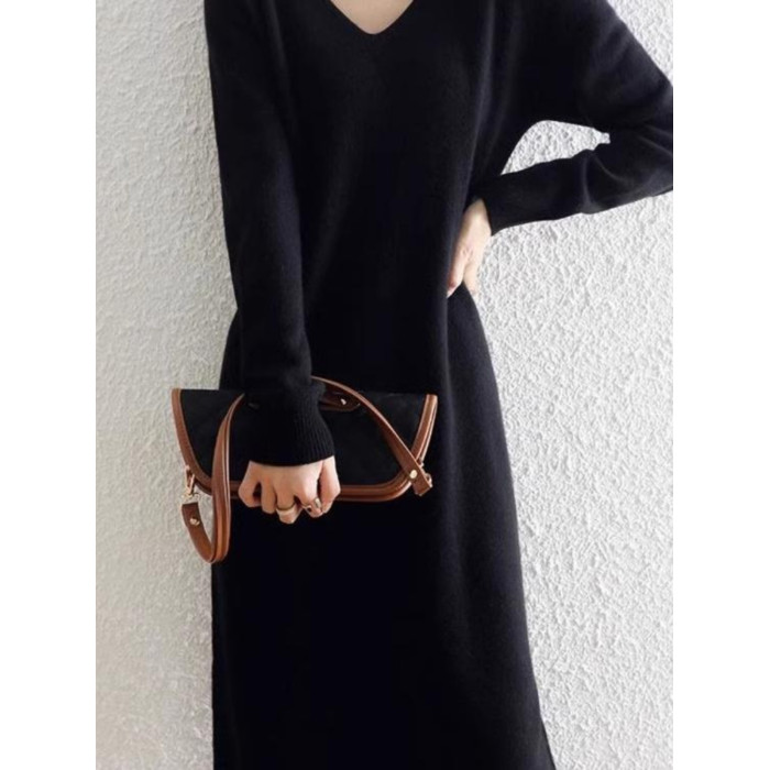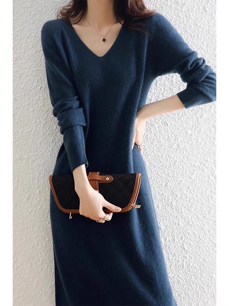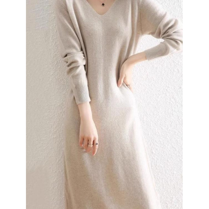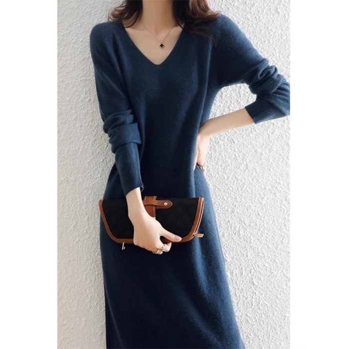 大牌一線剪標歐貨2024秋冬寬松v領長款毛衣打底針織連衣裙女