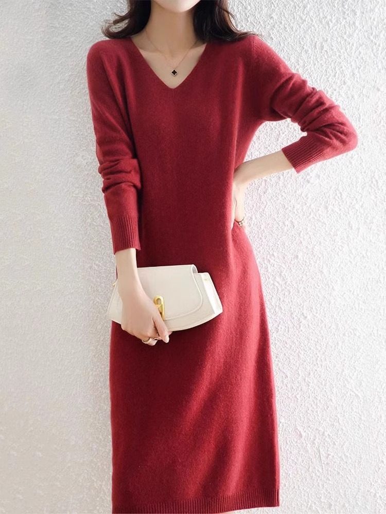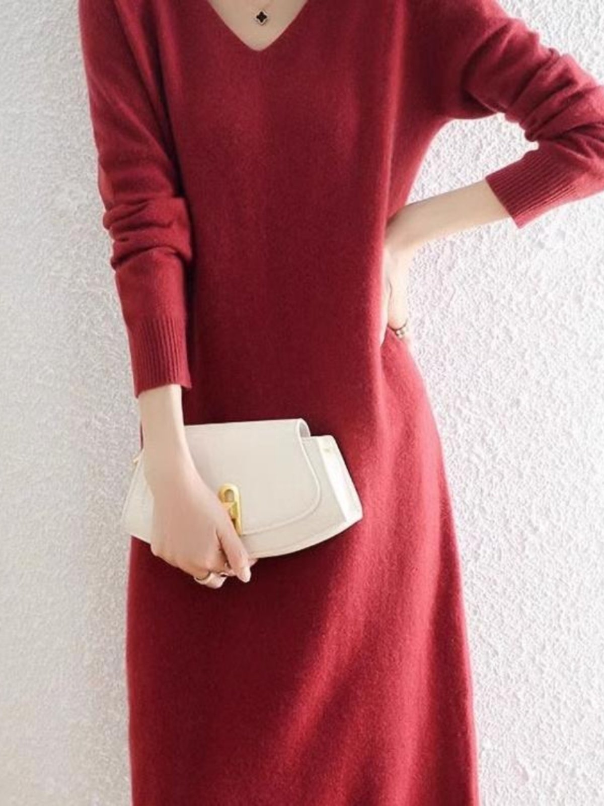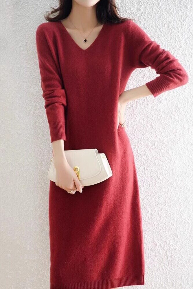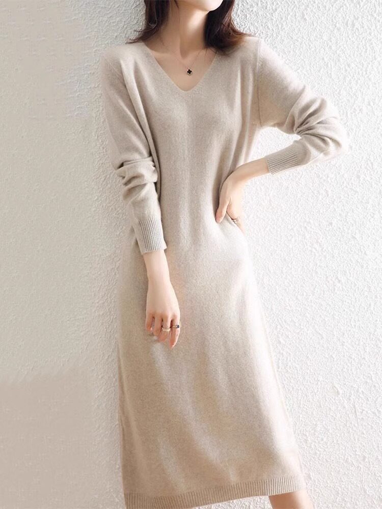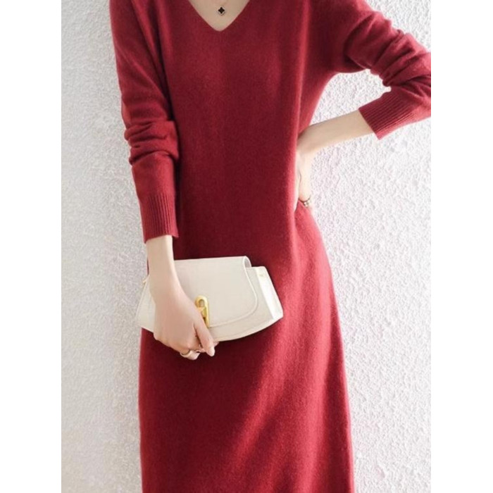 大牌一線剪標歐貨2024秋冬寬松v領長款毛衣打底針織連衣裙女
