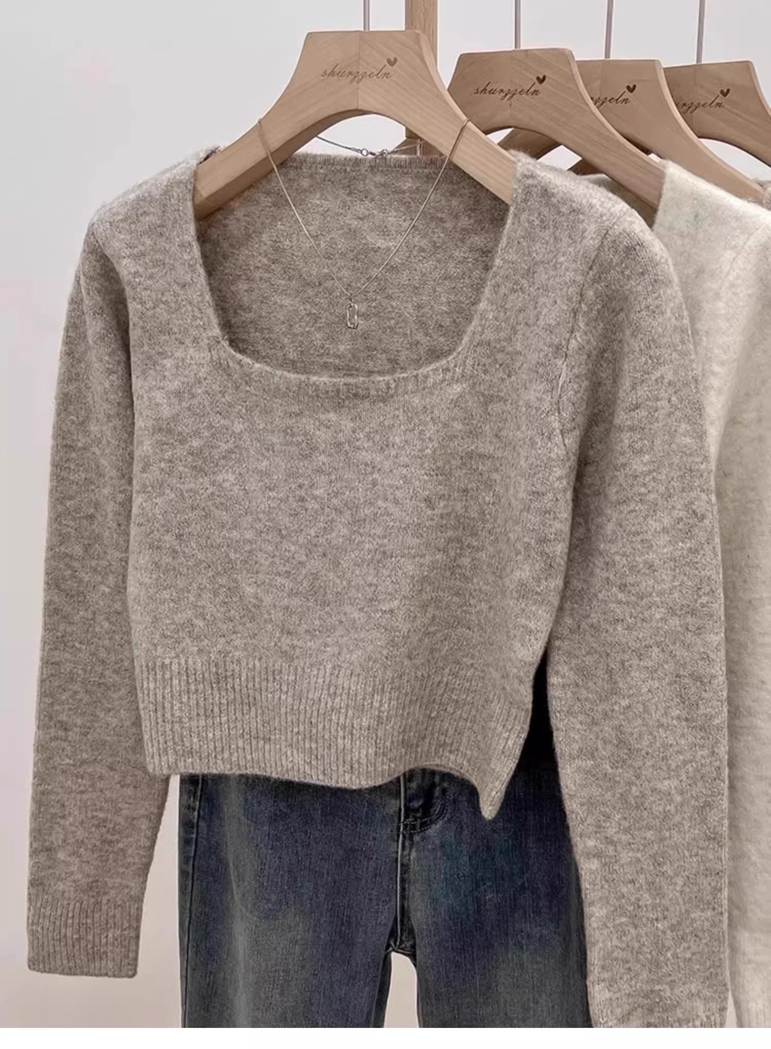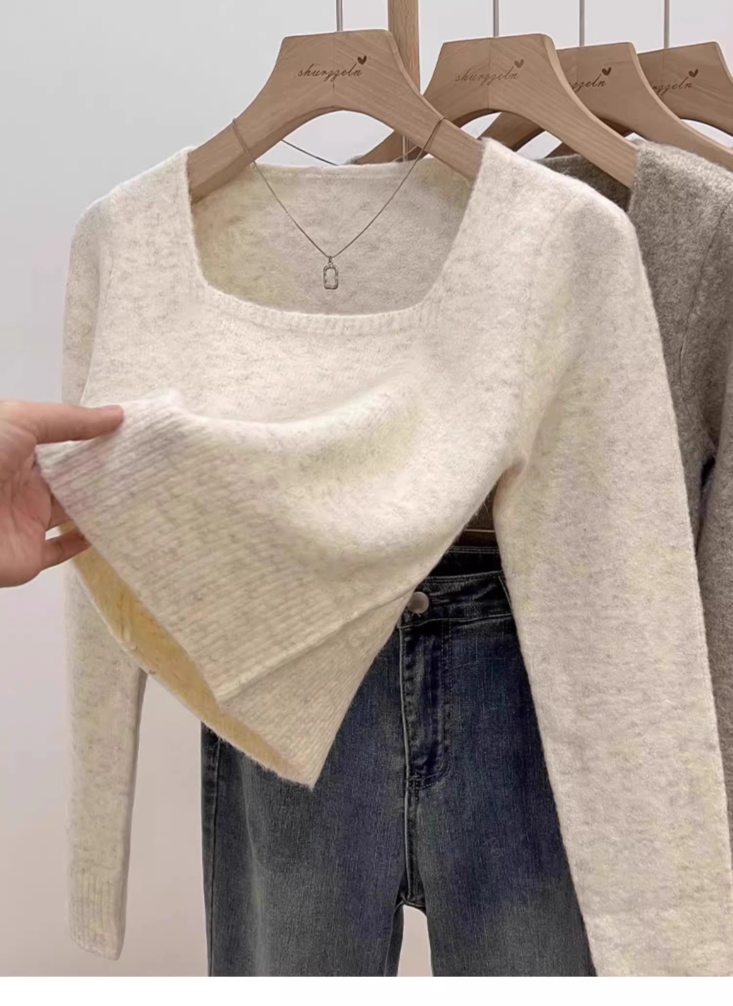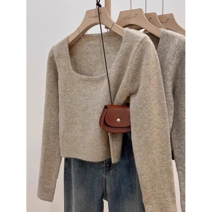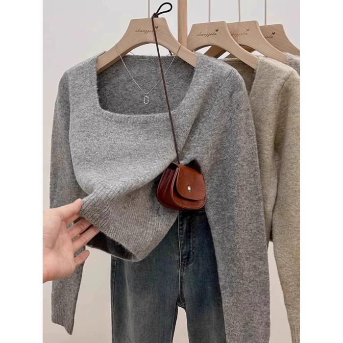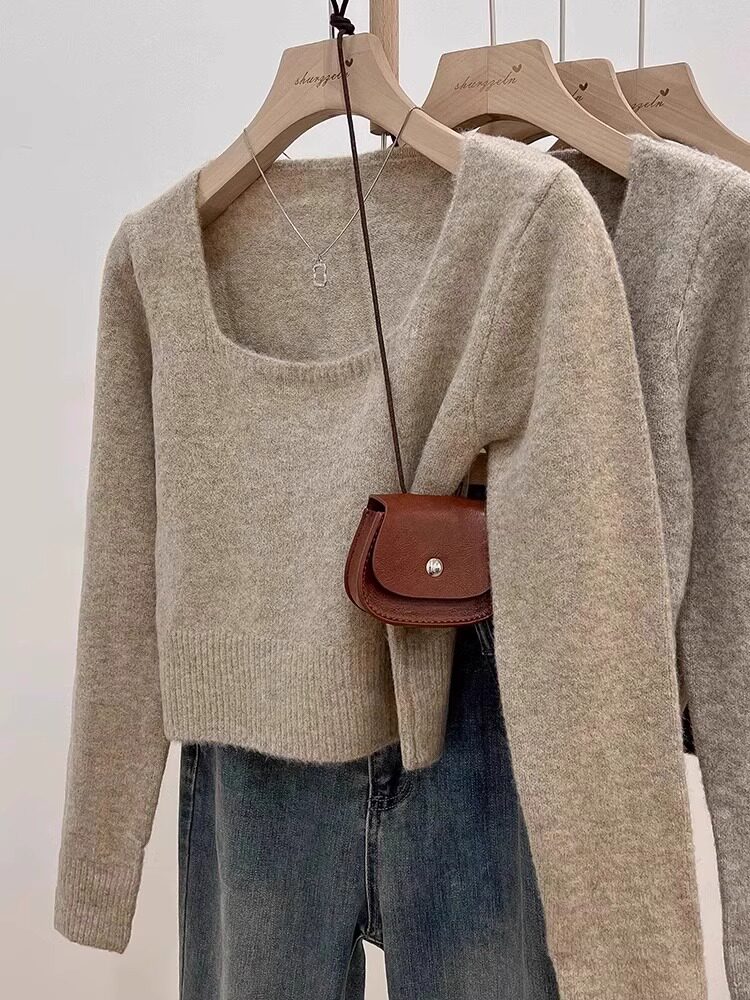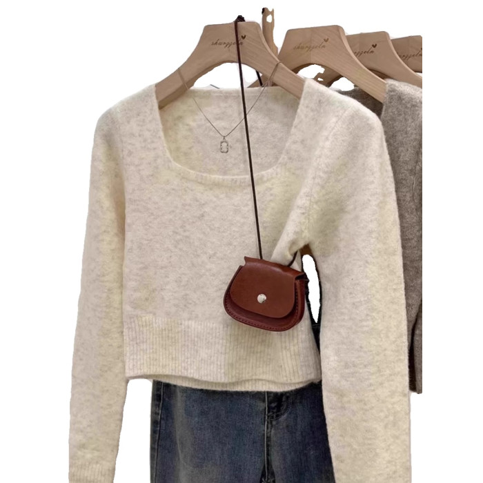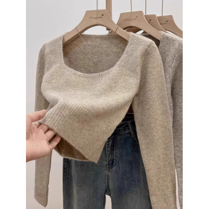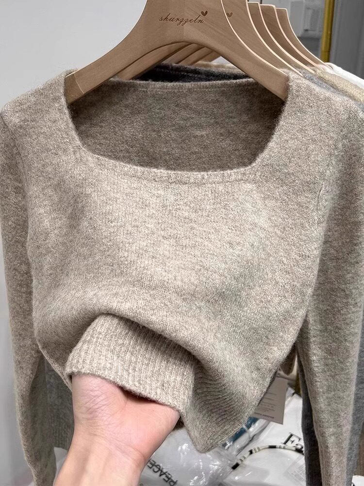 方領露鎖骨軟糯毛衣針織打底衫女2025秋冬高級感加厚套頭內搭上衣