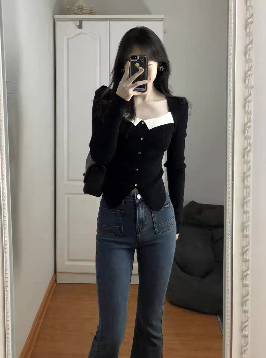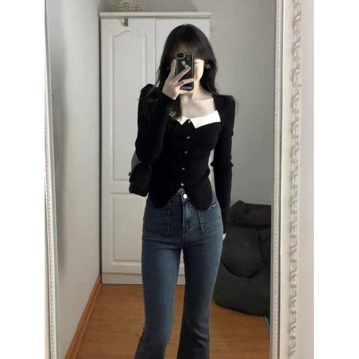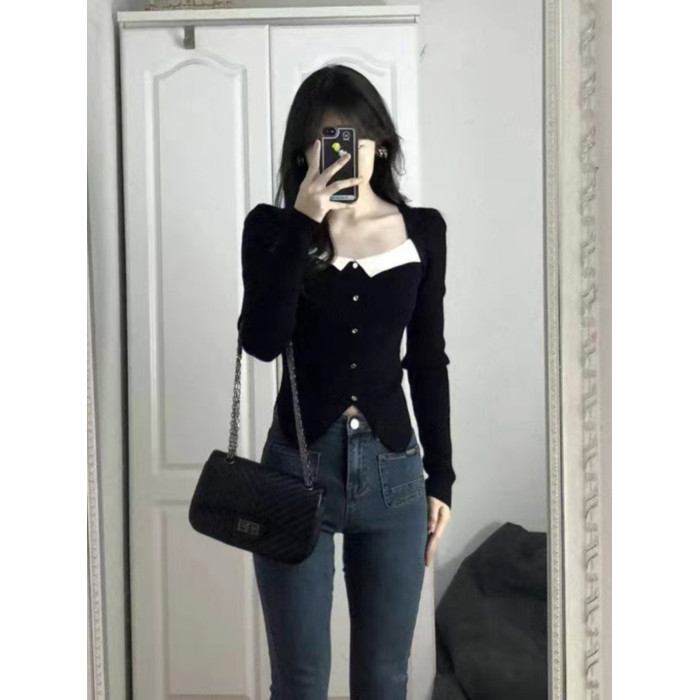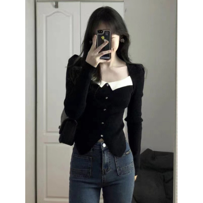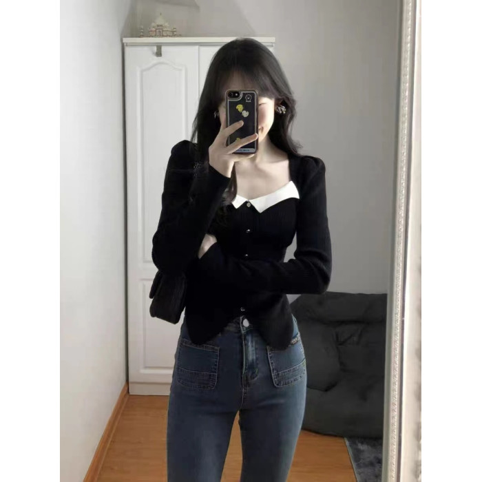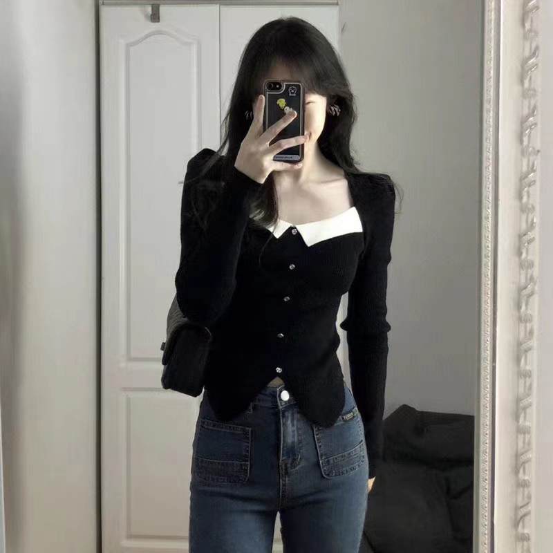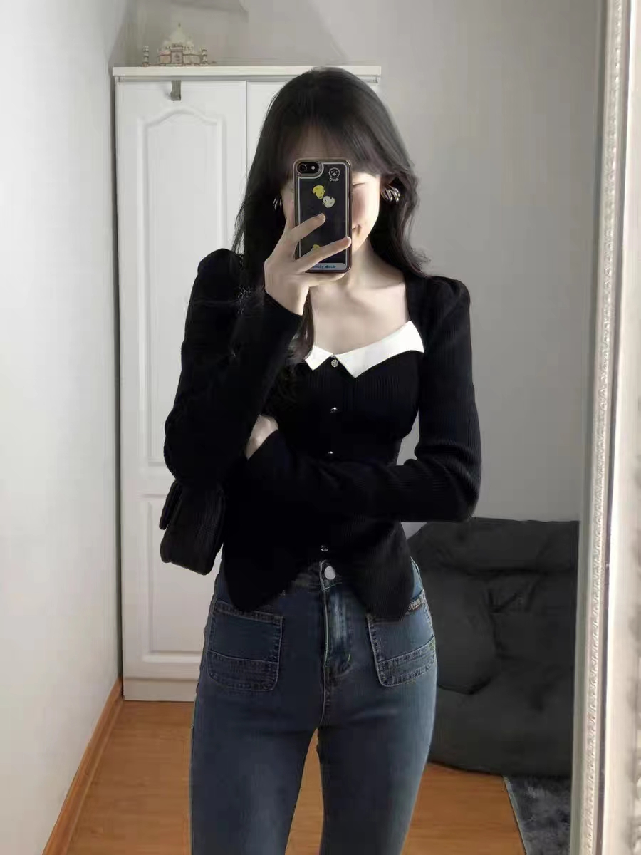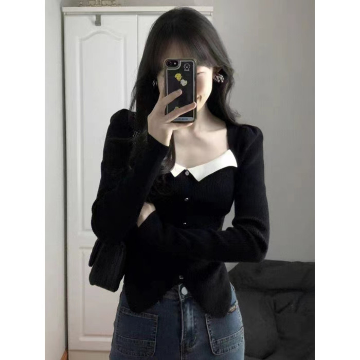 大碼法式方領泡泡袖針織衫女秋冬修身內搭打底衫設計感上衣高級感