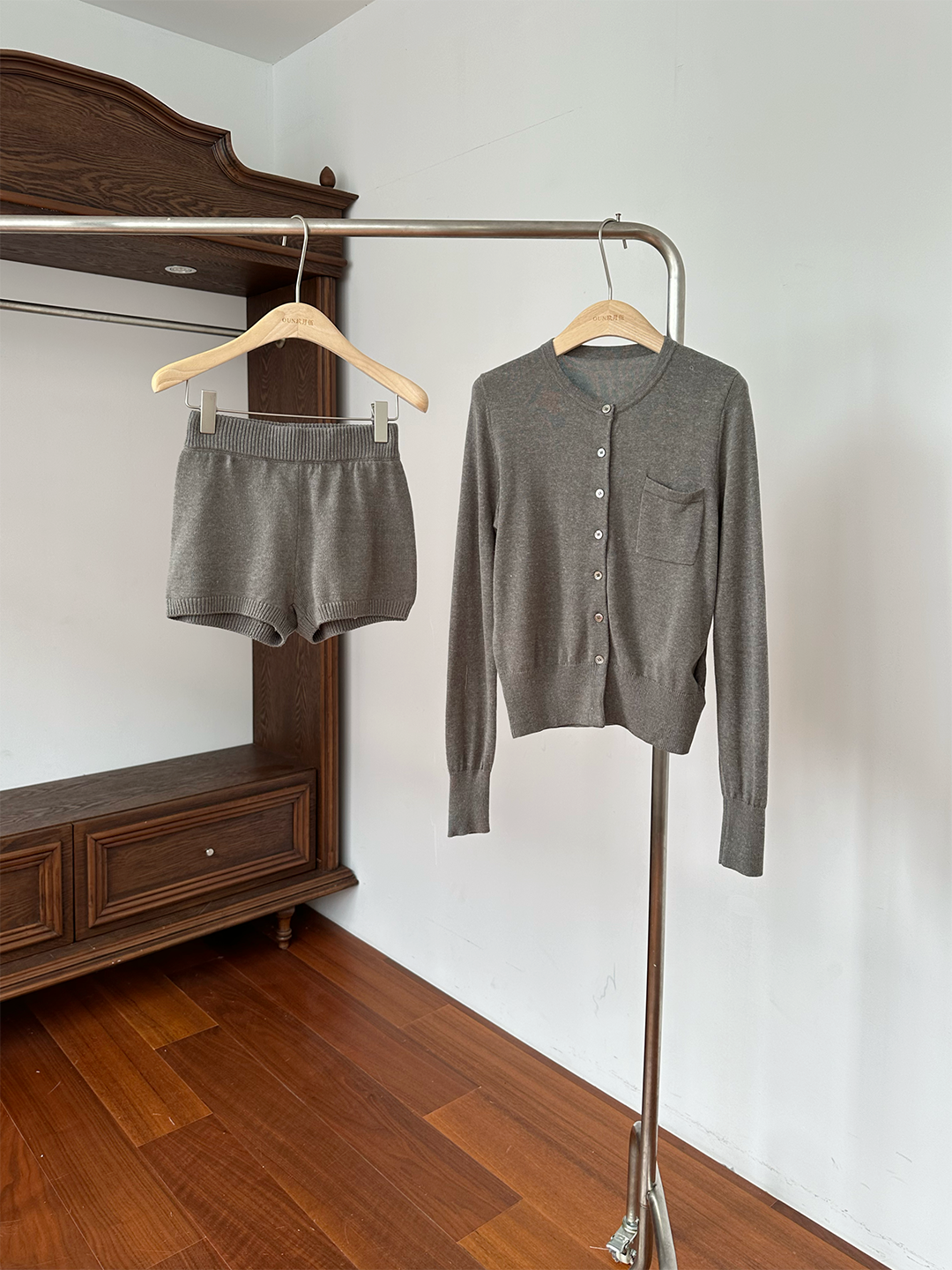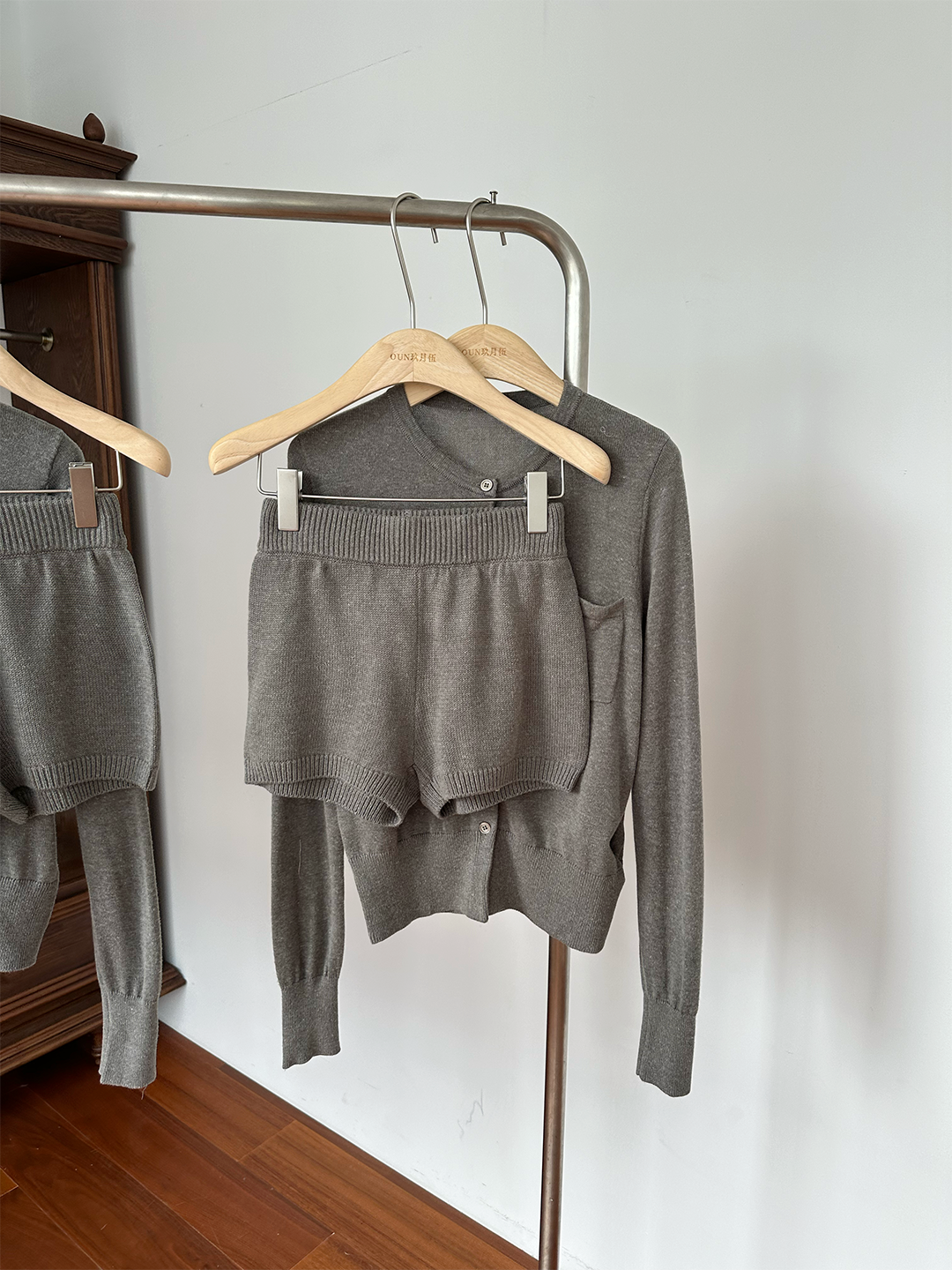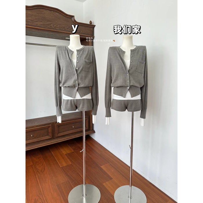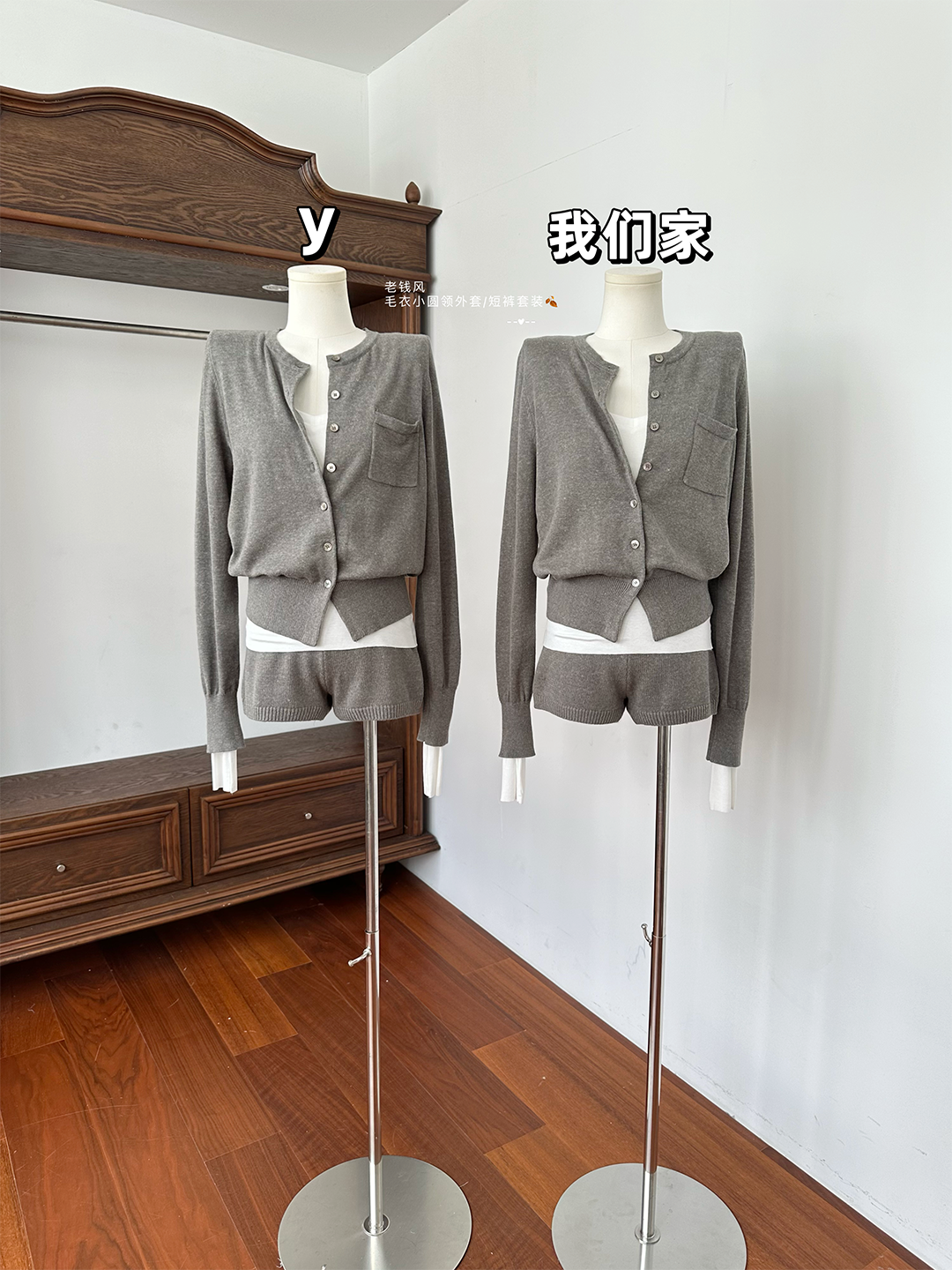 玖月伍 老錢風毛衣套裝女秋季慵懶休閒小圓領外套/毛織短褲兩件套