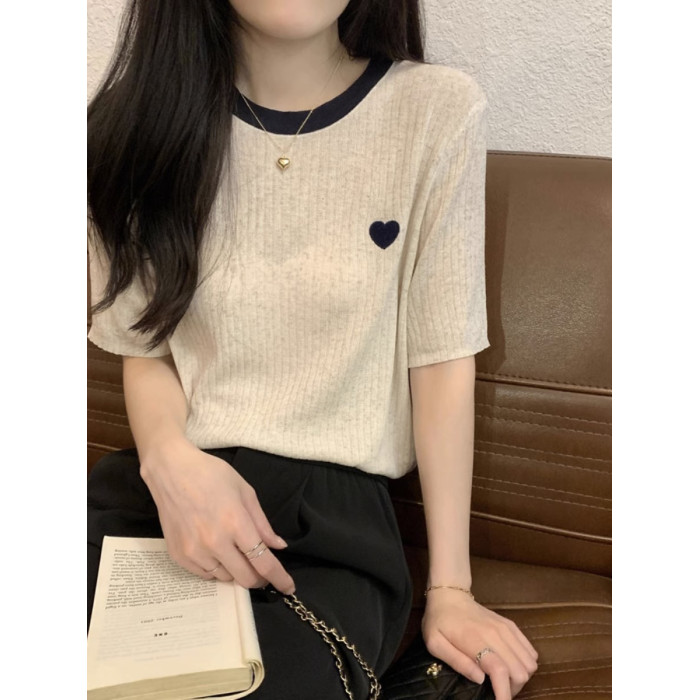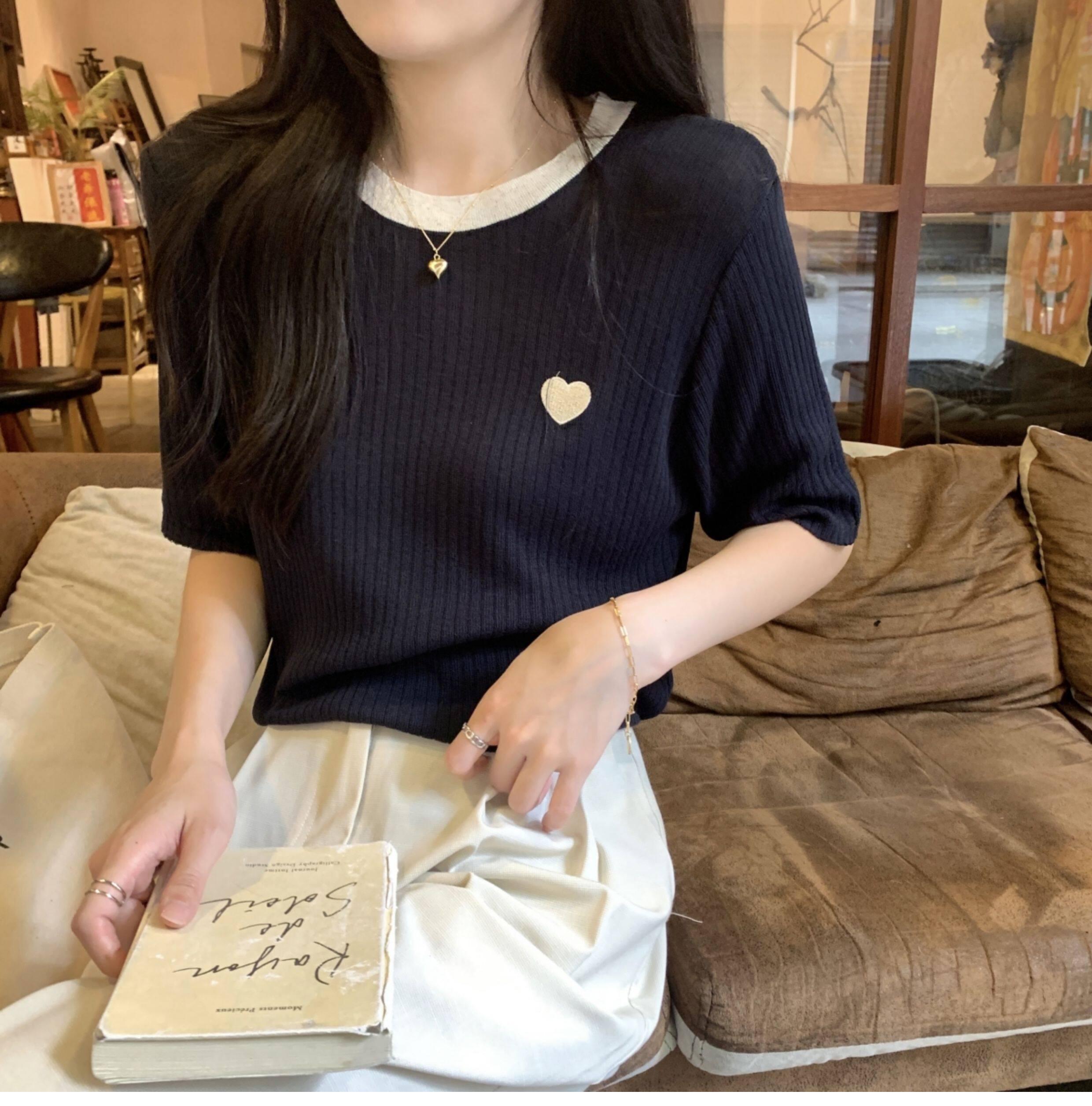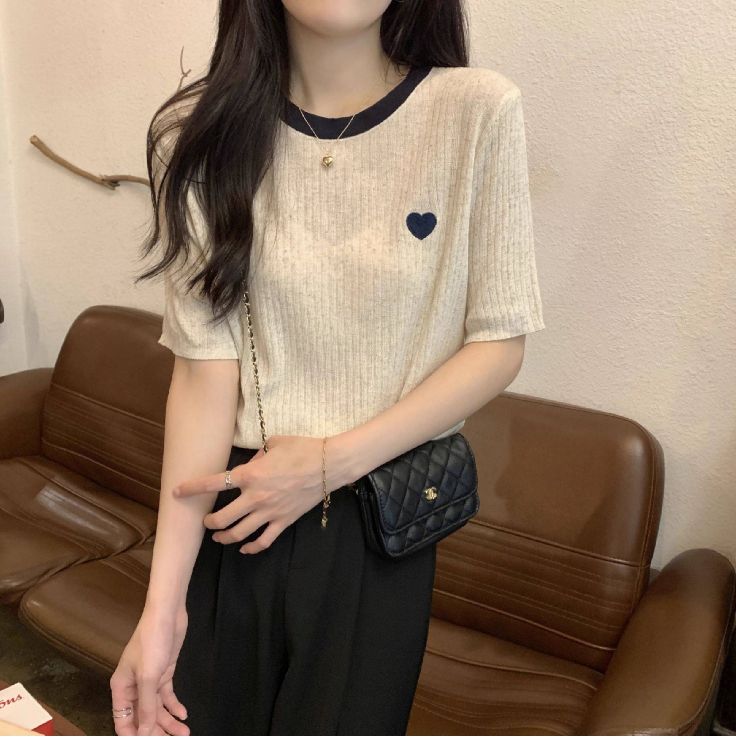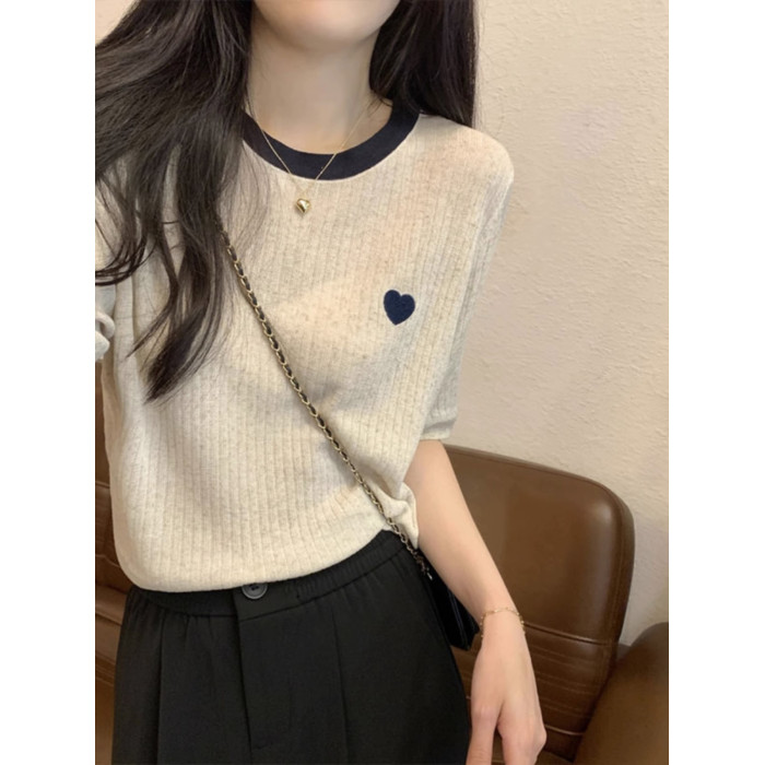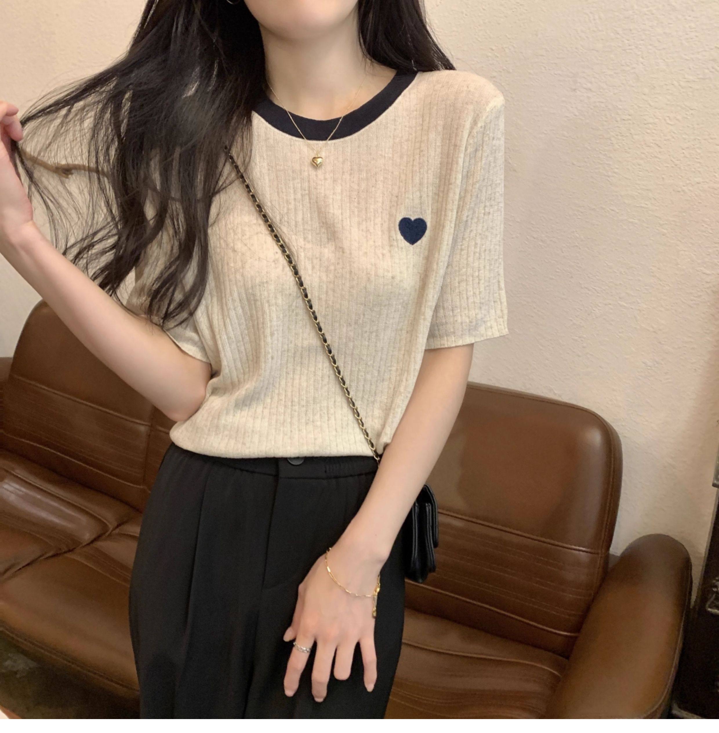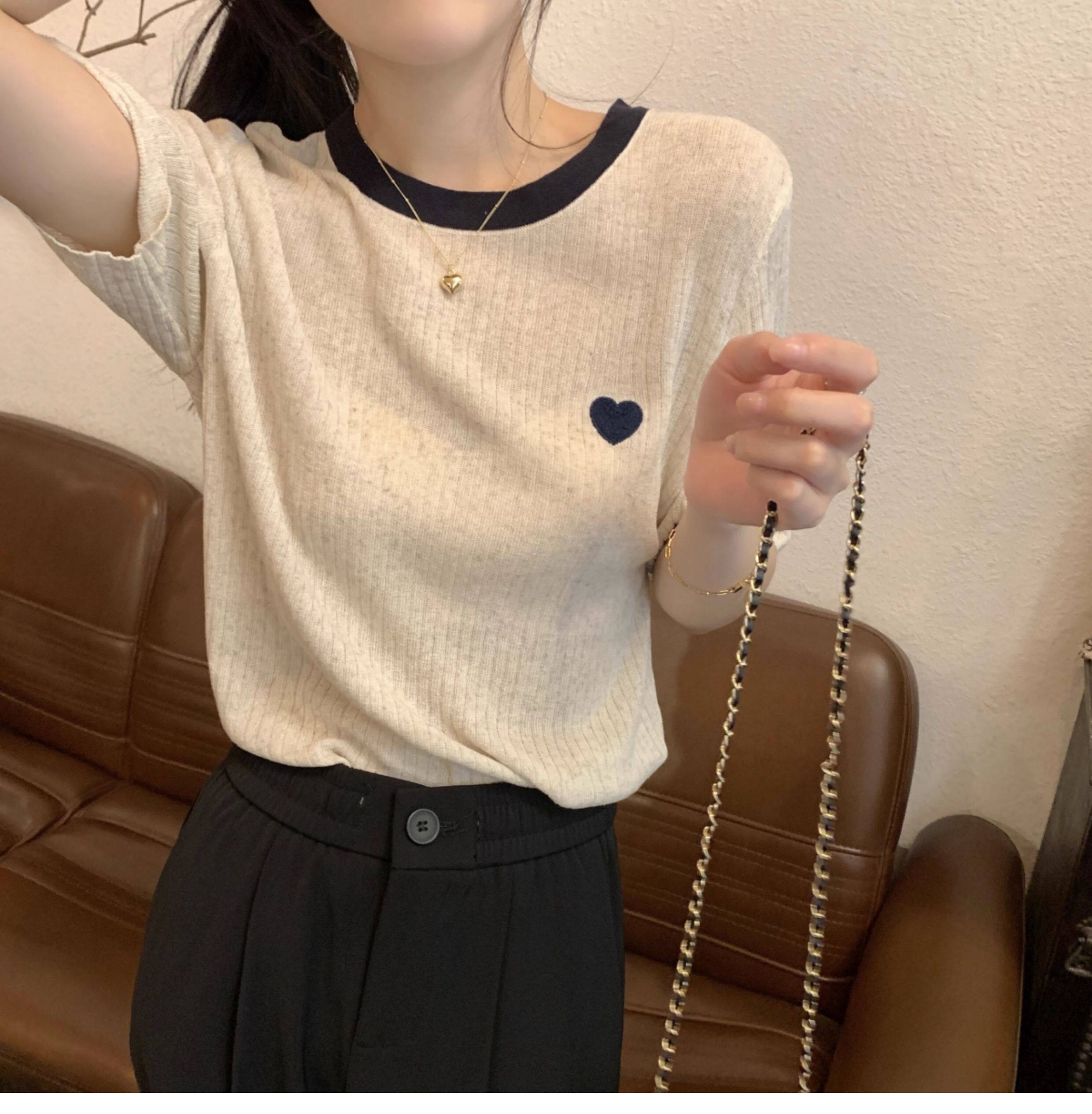 好軟糯撞色愛心短袖正肩t恤女夏季2025新款寬松薄款冰絲針織上衣