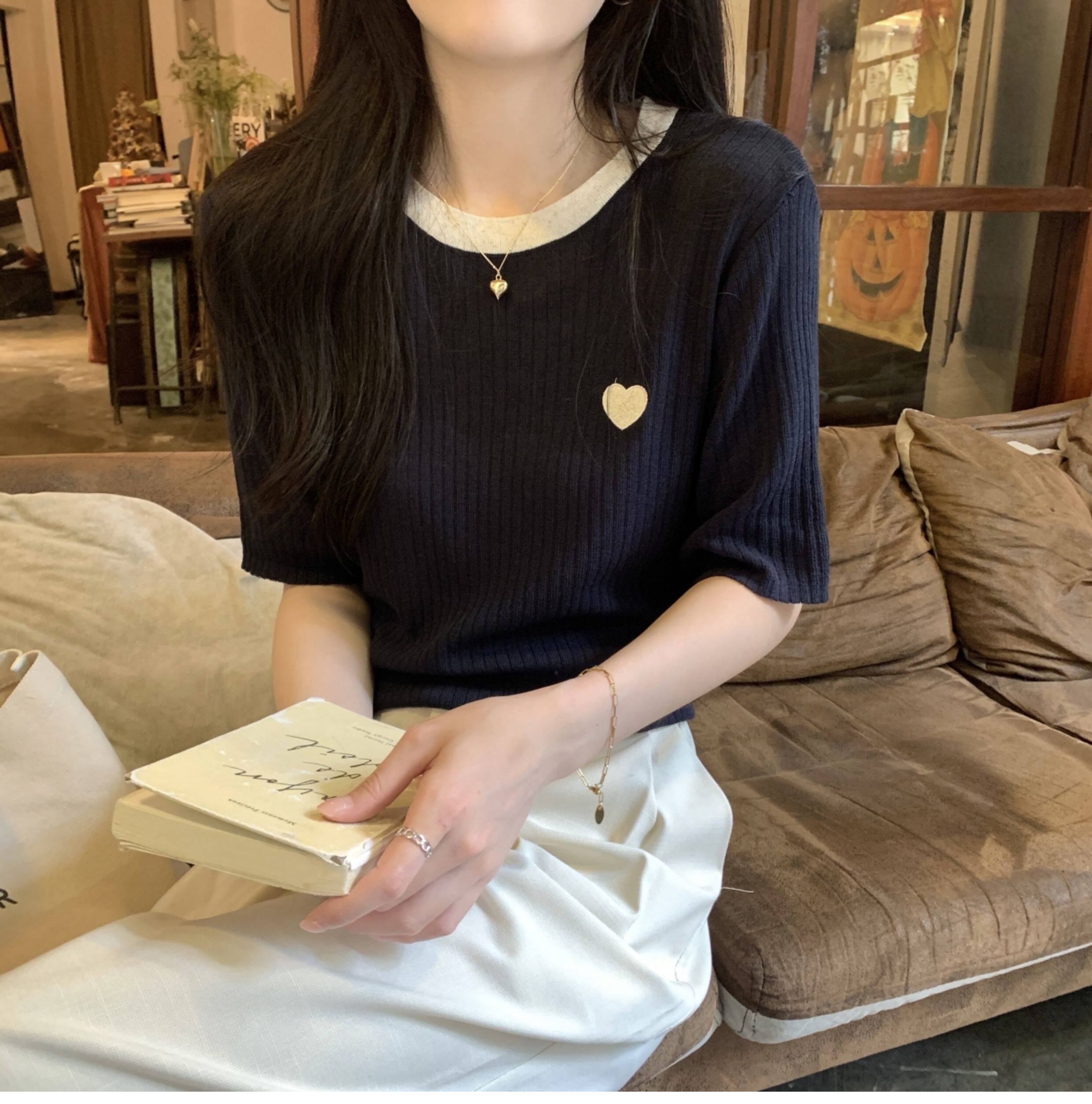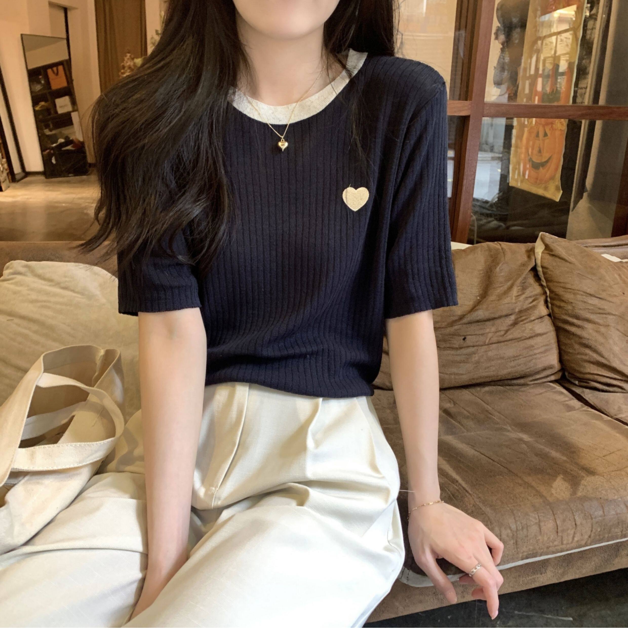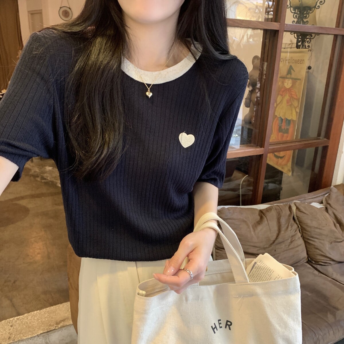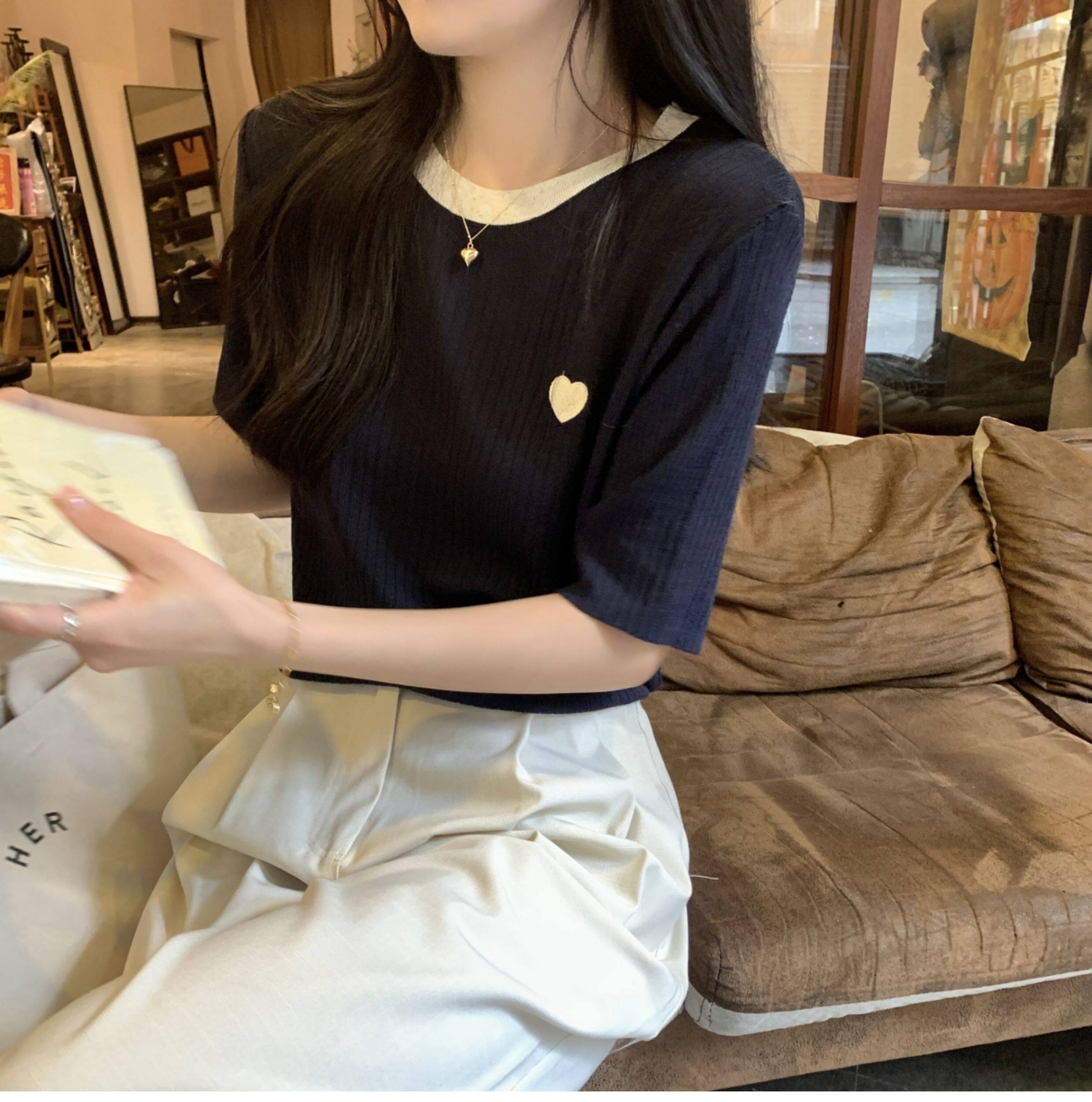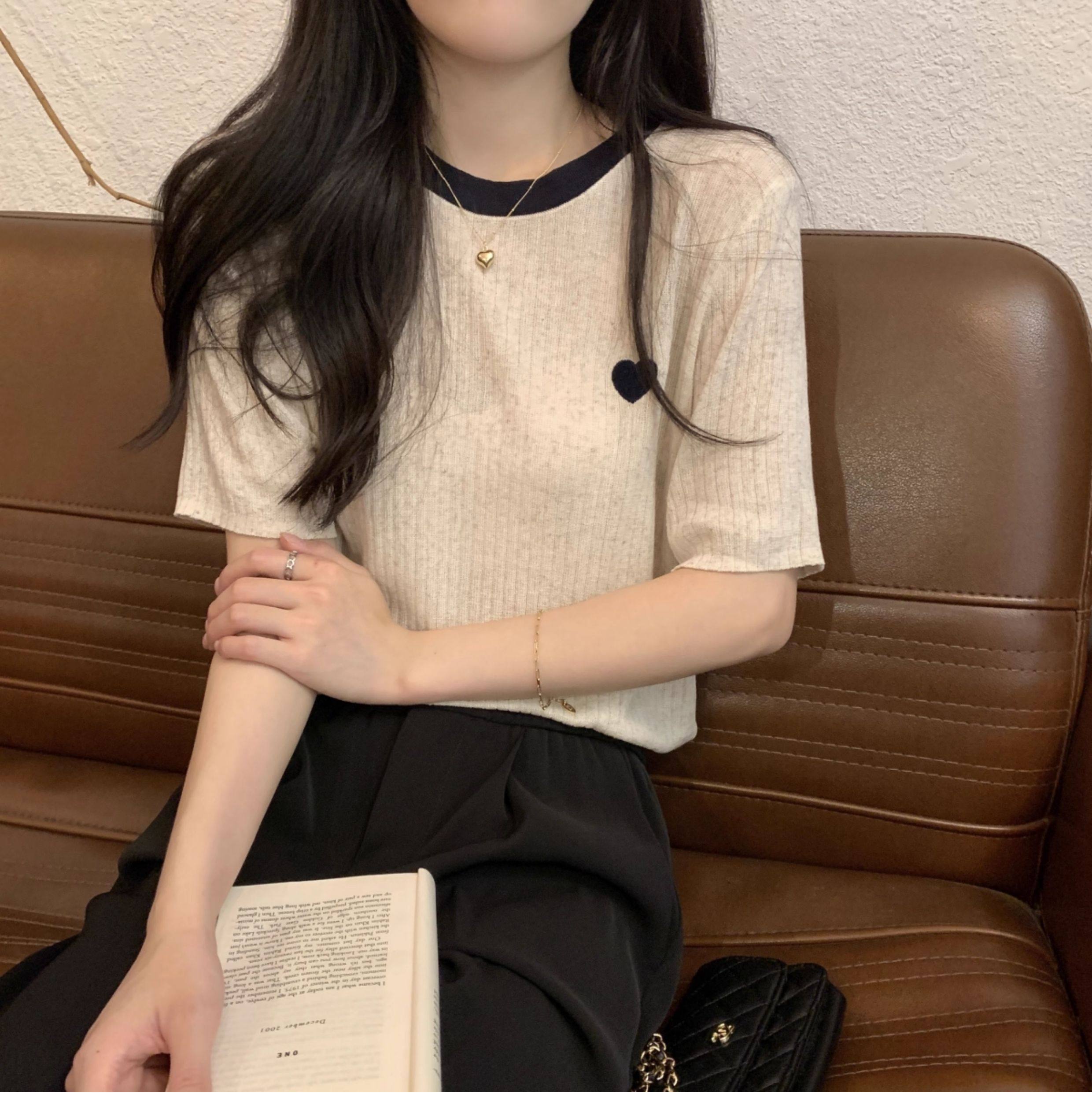 好軟糯撞色愛心短袖正肩t恤女夏季2025新款寬松薄款冰絲針織上衣
