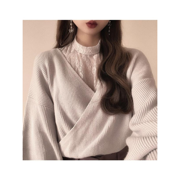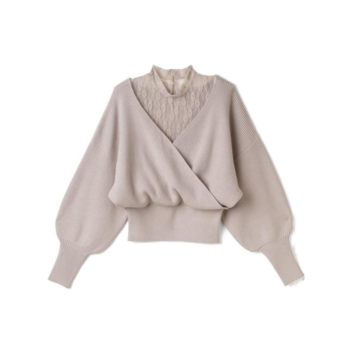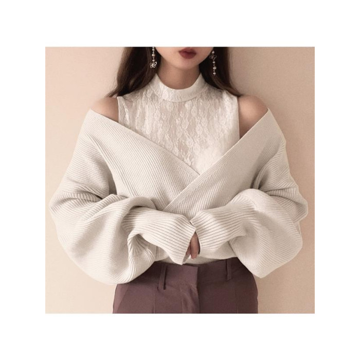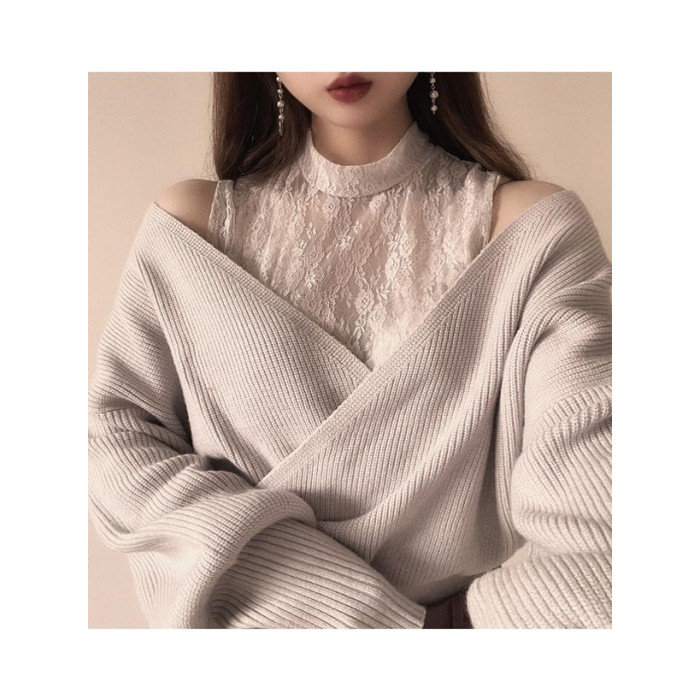GRL新款女日系甜美蕾絲領顯瘦落肩袖純欲針織衫假兩件毛衣iz280