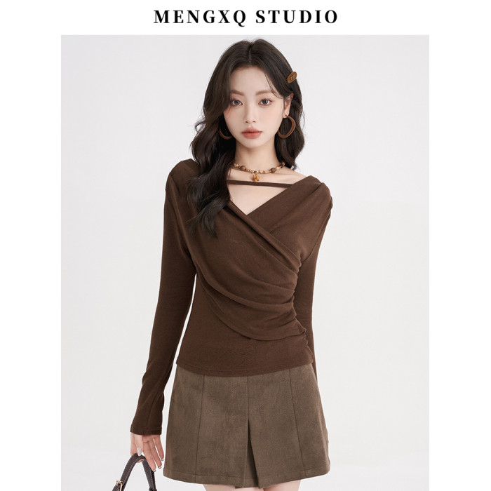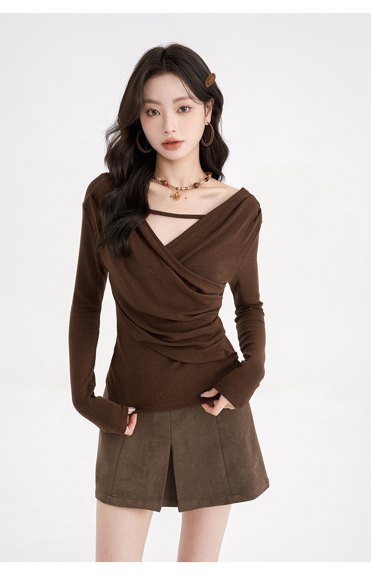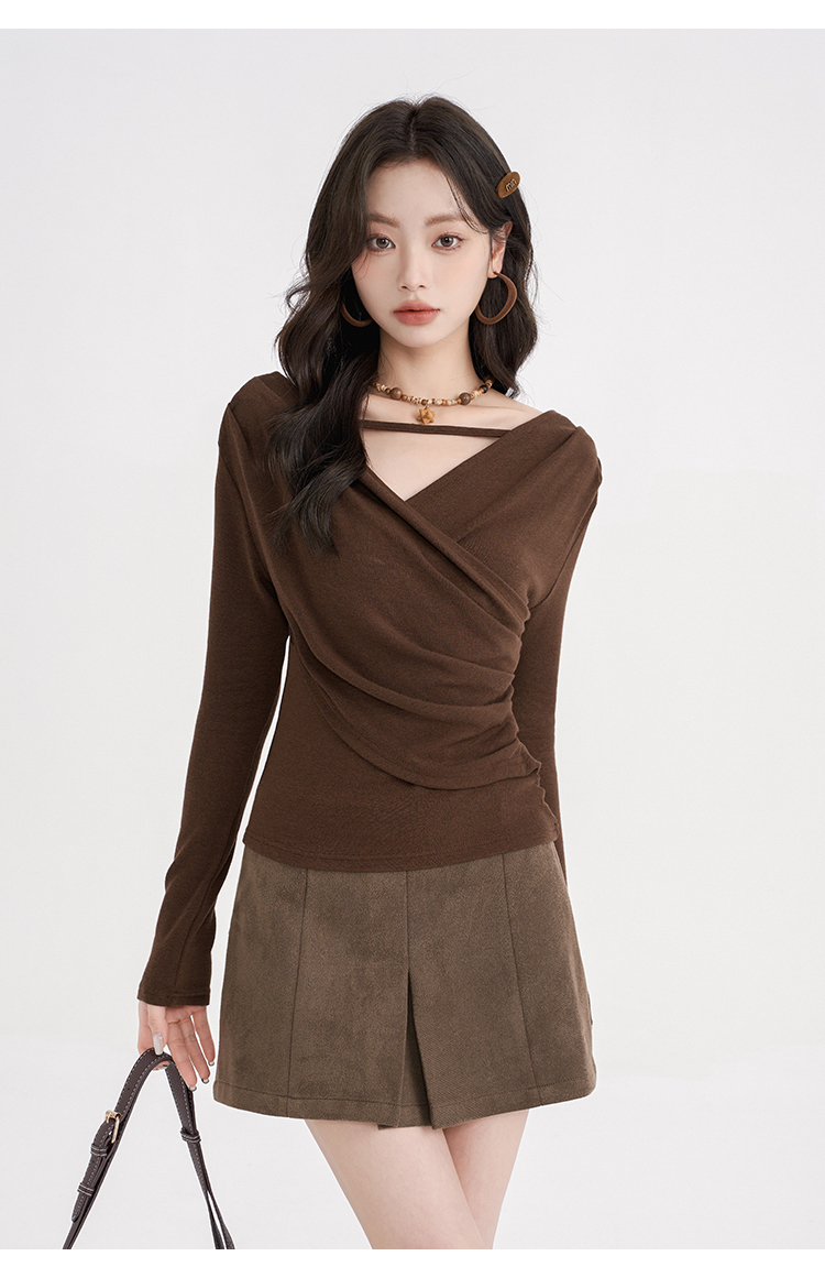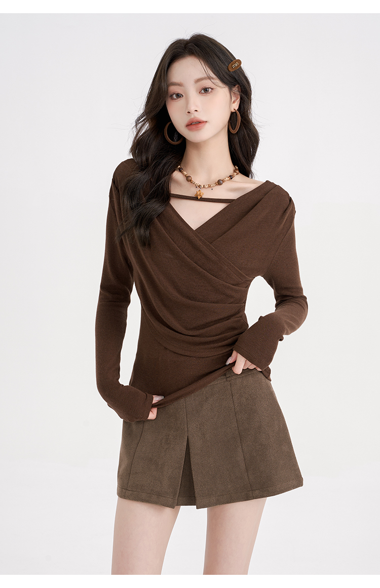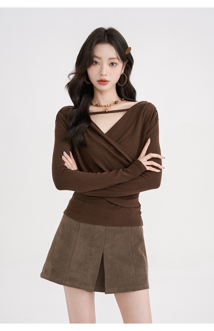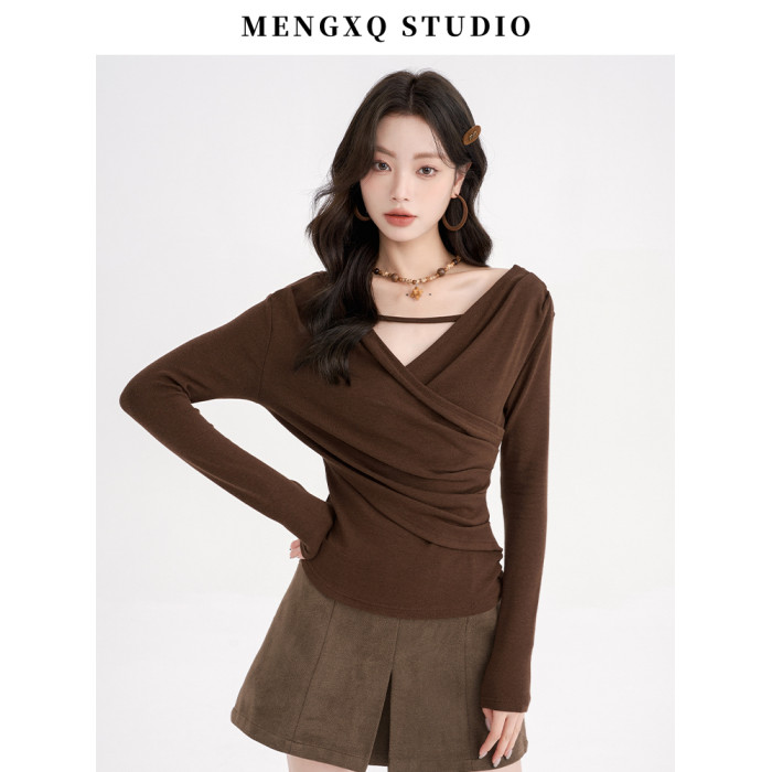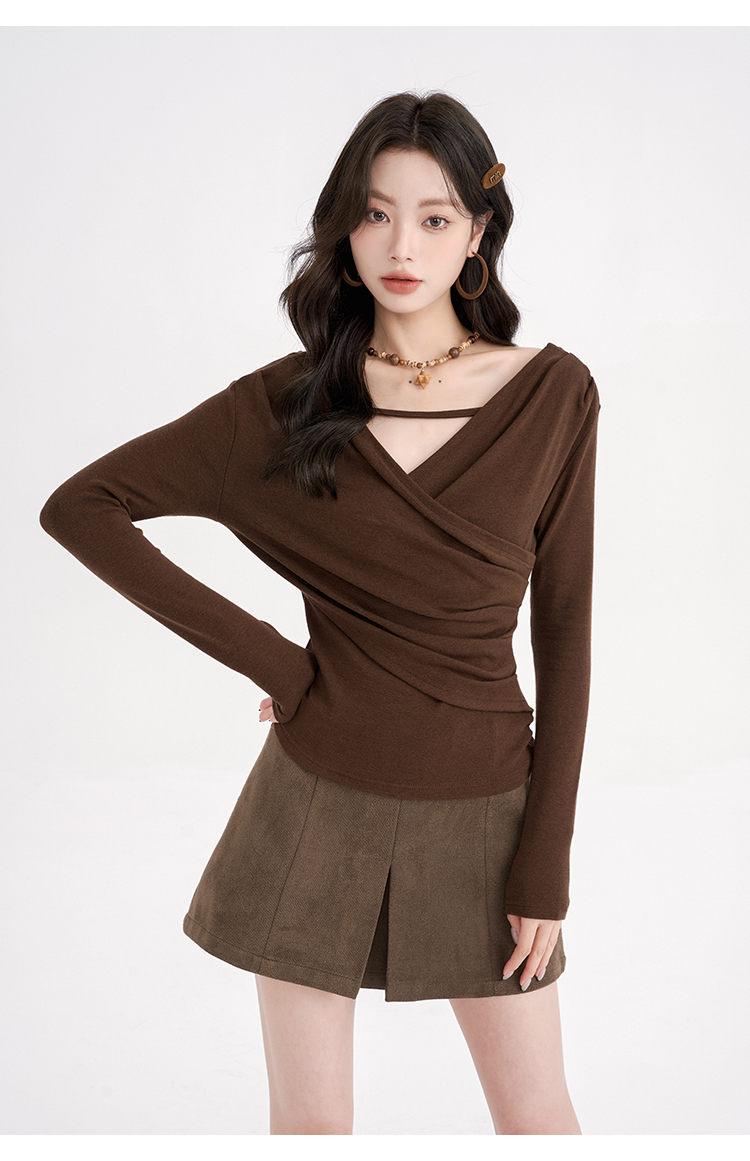 矇小柒美拉德穿搭氣質V領長袖T恤女秋季設計感打底衫咖色上衣內搭