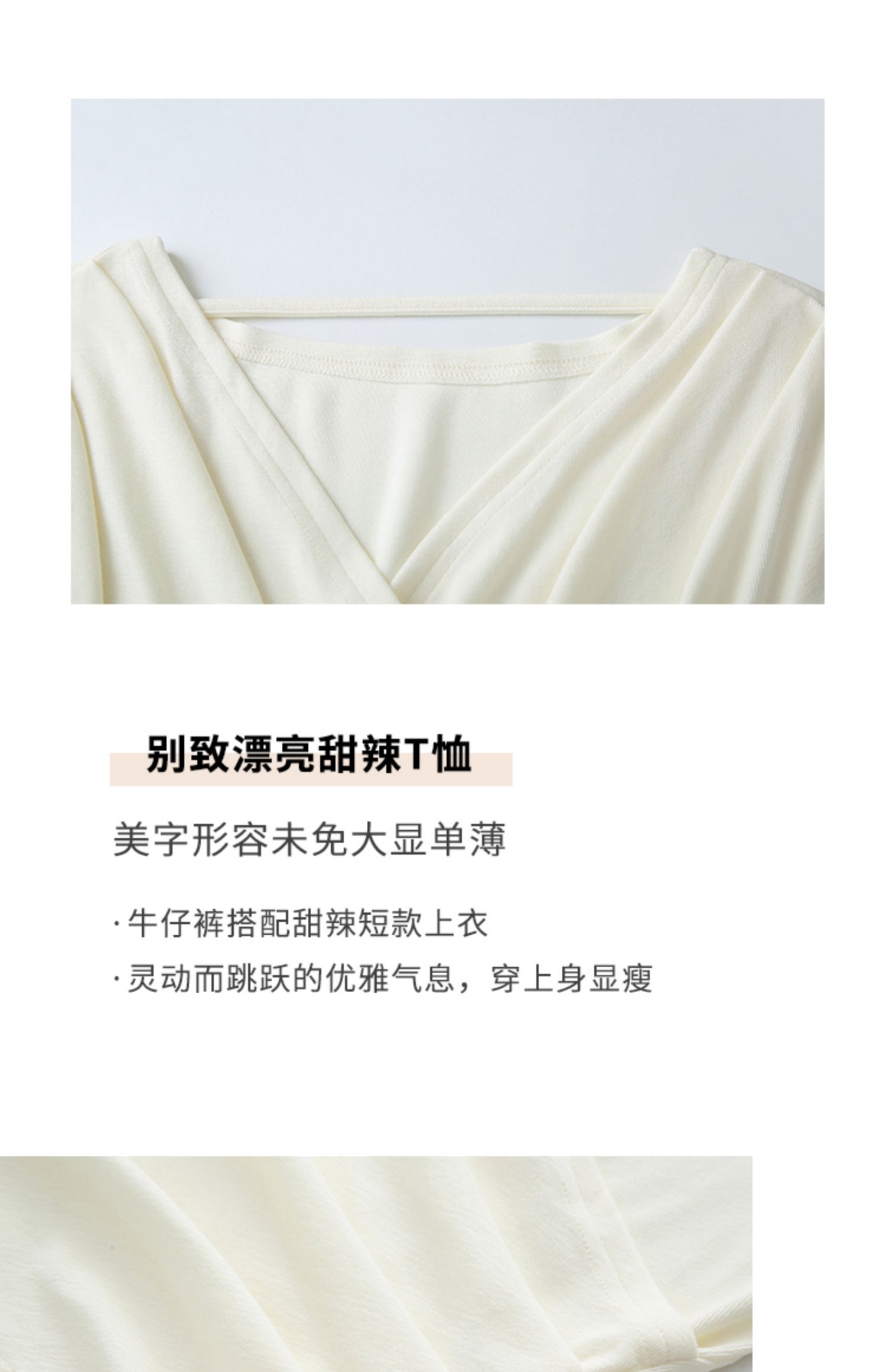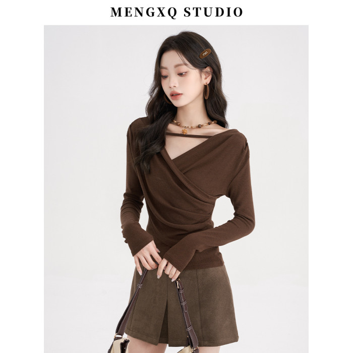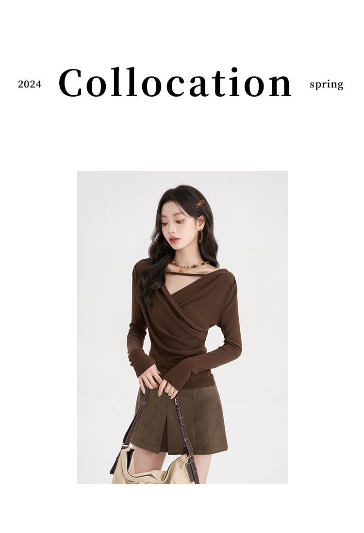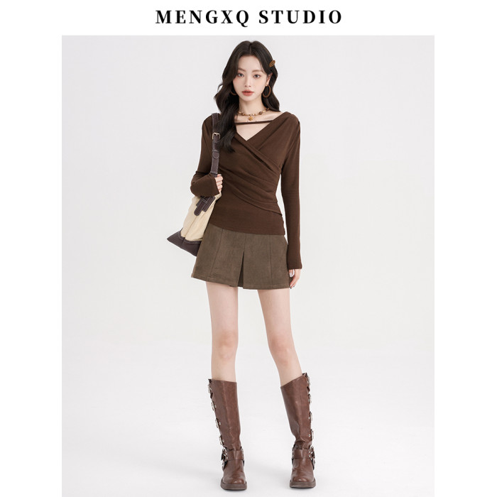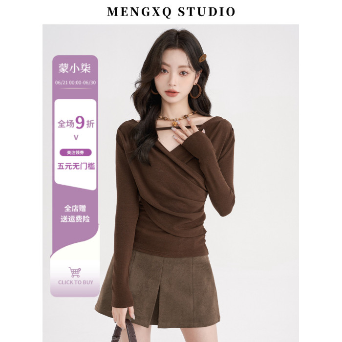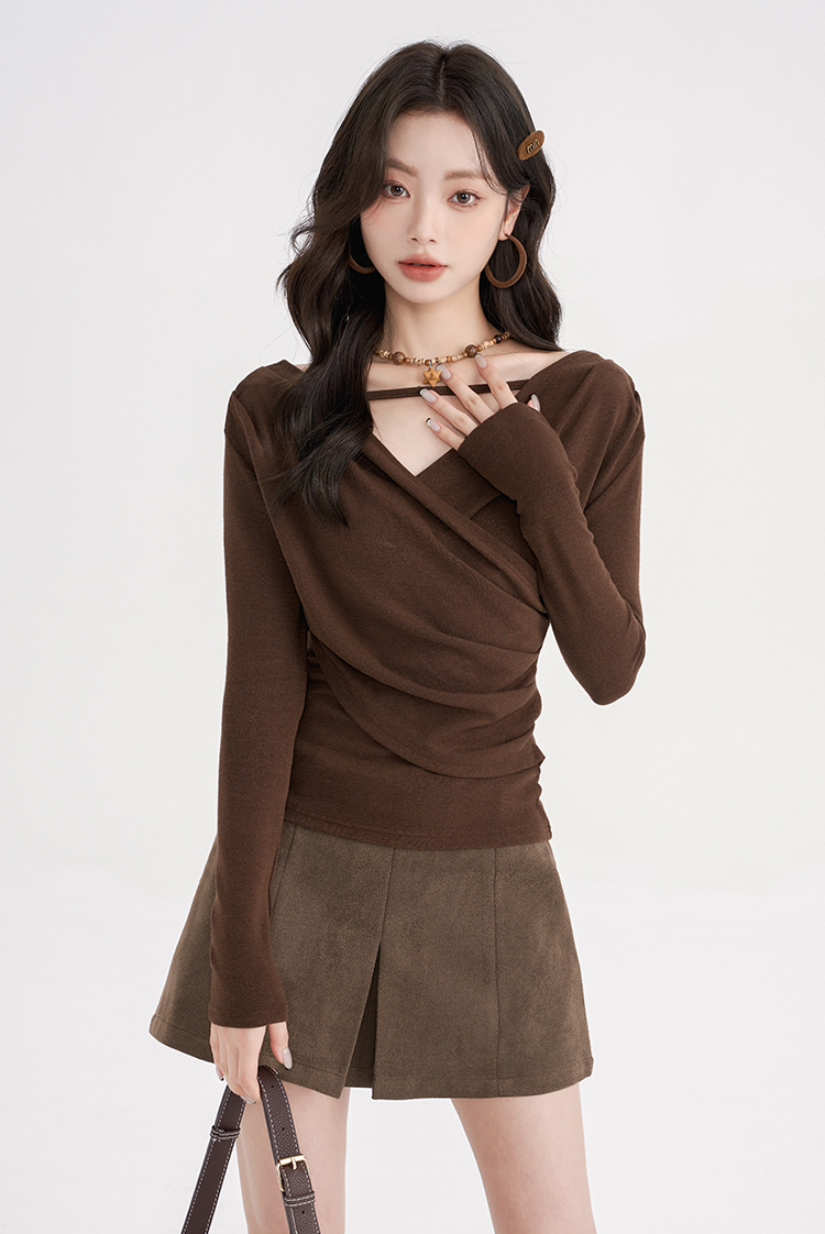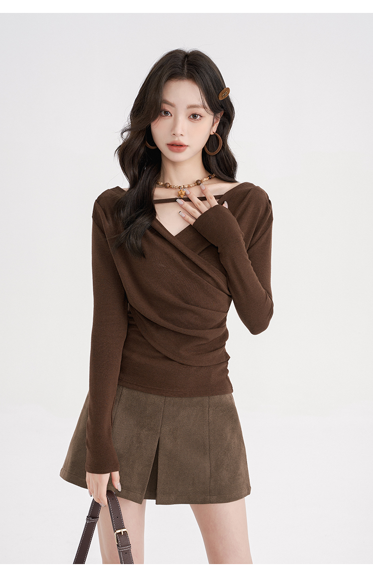 矇小柒美拉德穿搭氣質V領長袖T恤女秋季設計感打底衫咖色上衣內搭