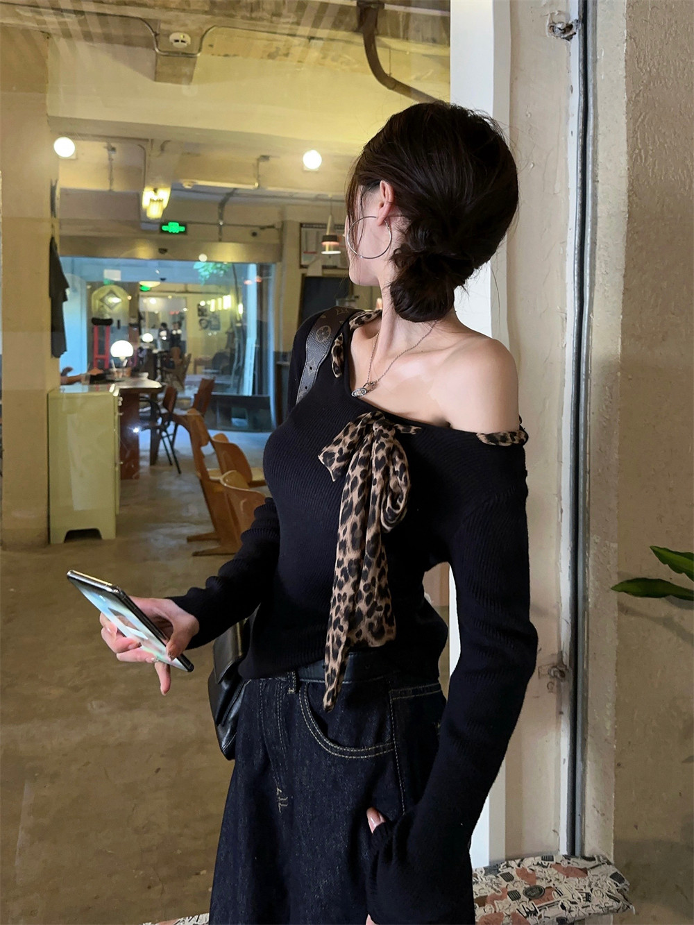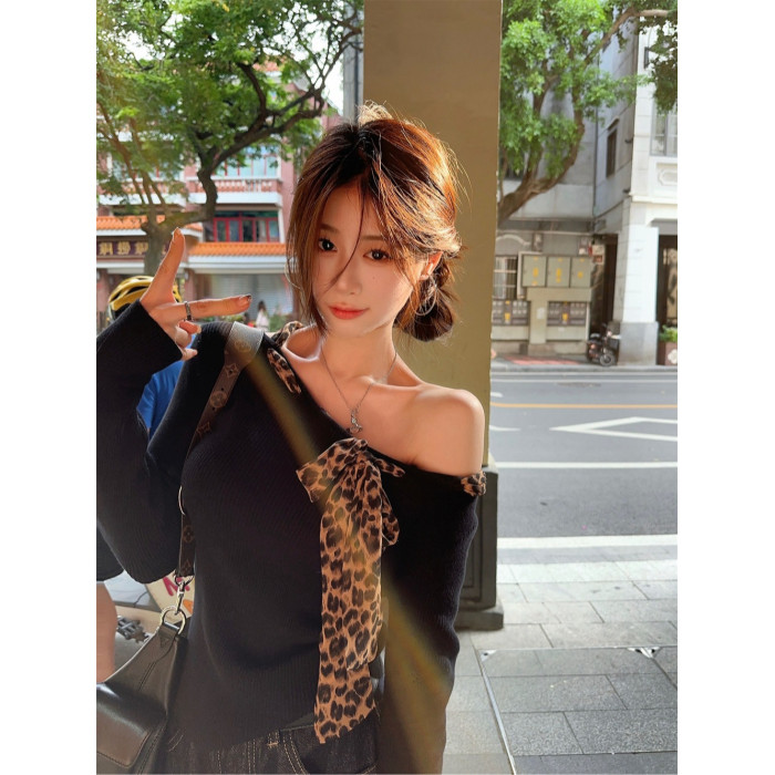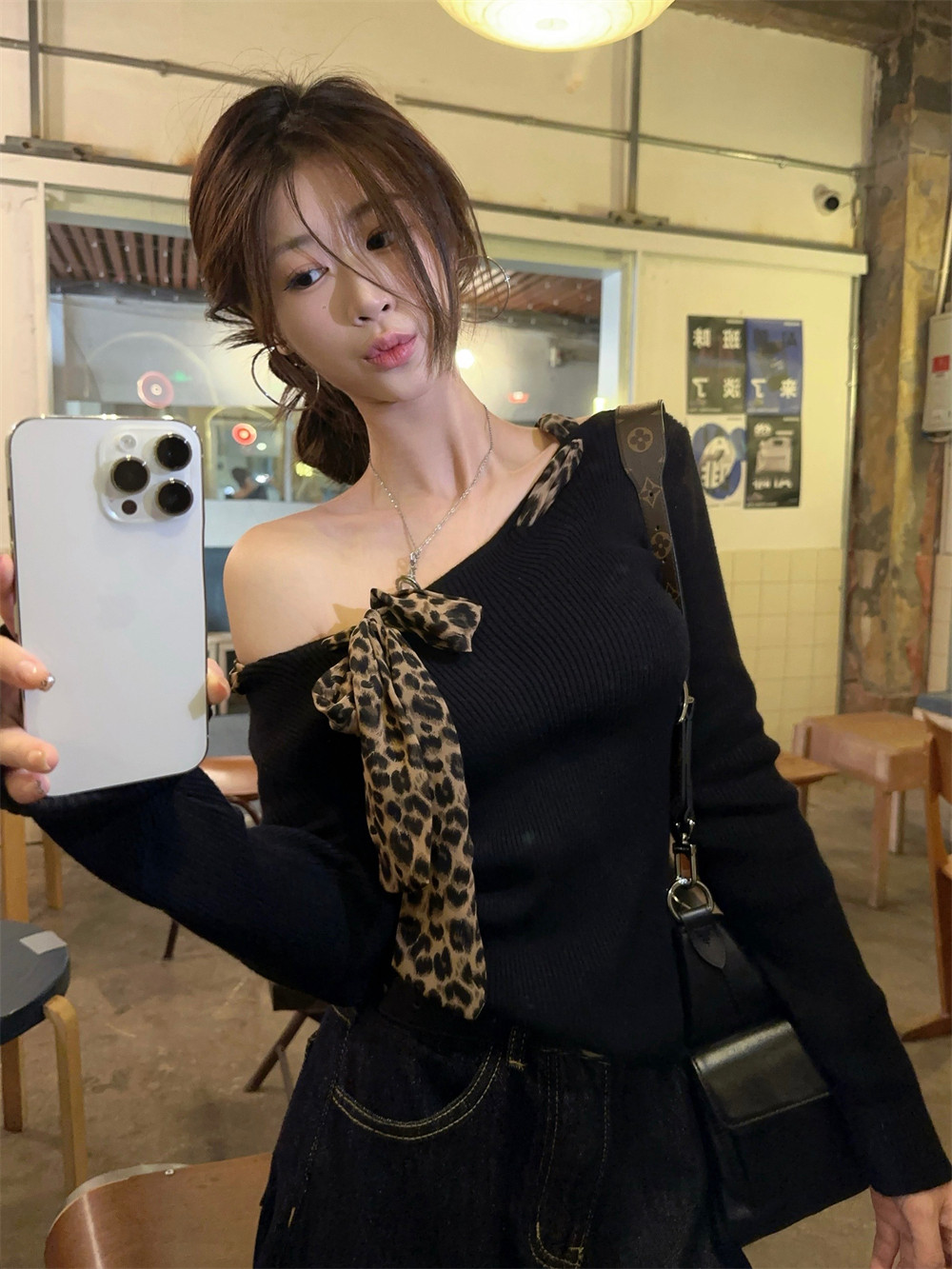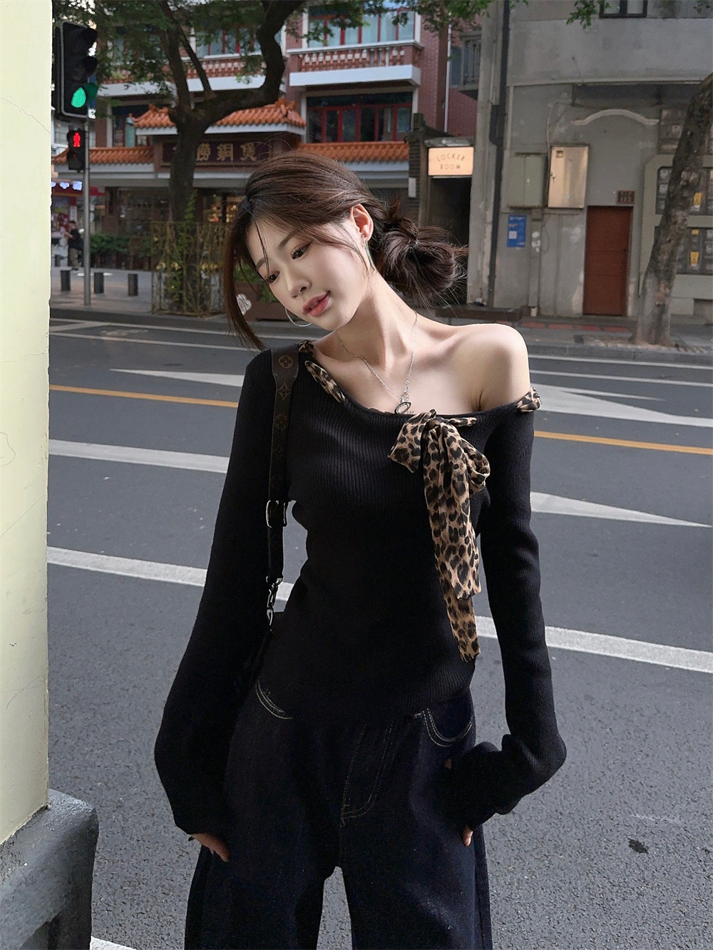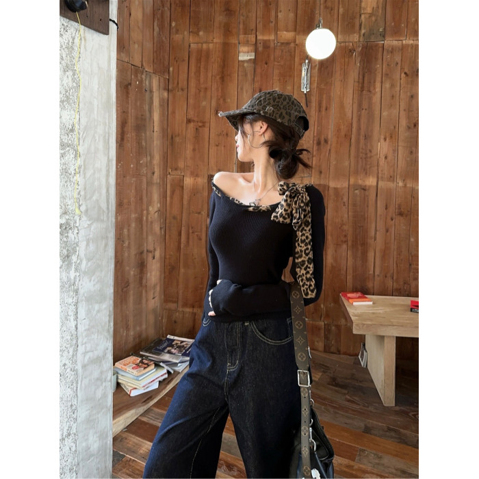 韓系辣妹豹紋斜肩長袖t恤女秋季小衆修身顯瘦別致露肩短款小上衣