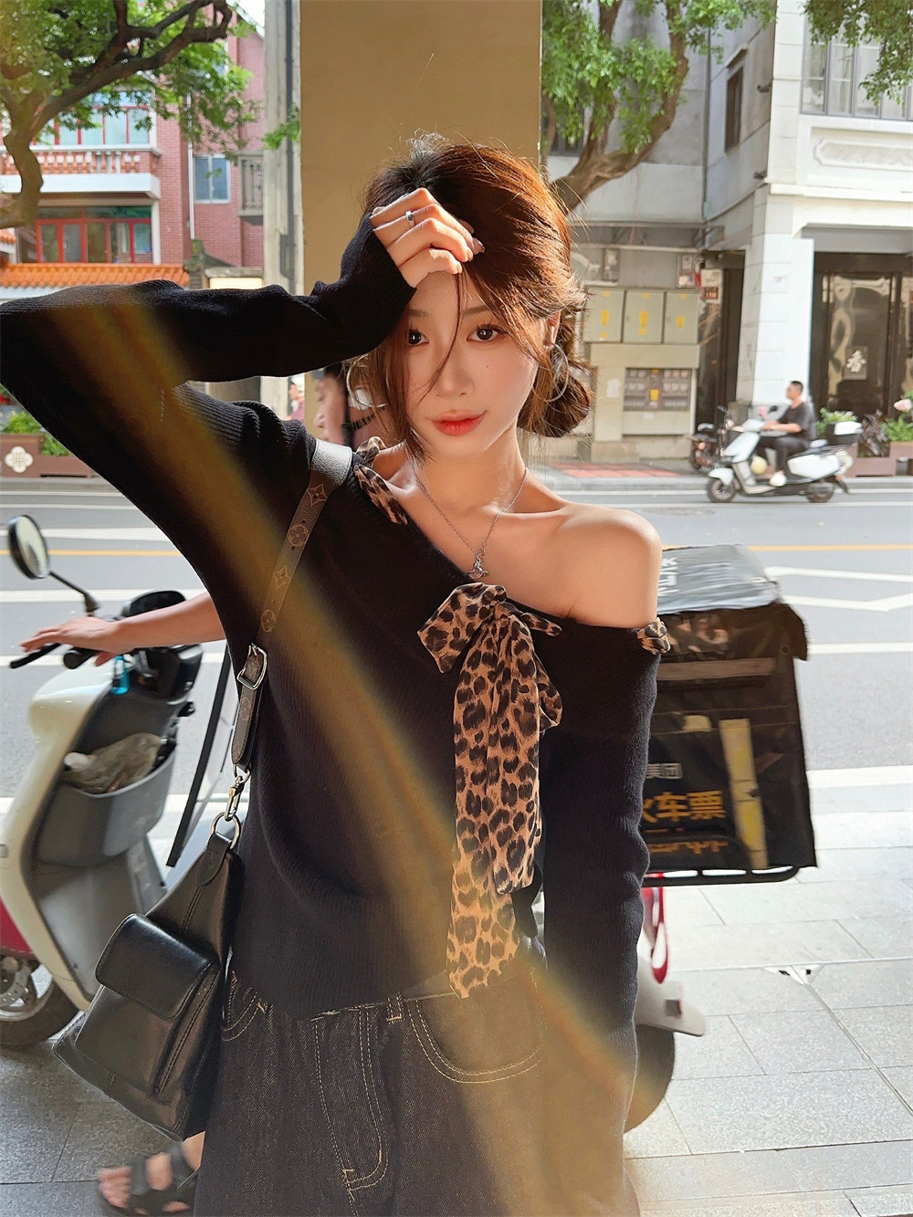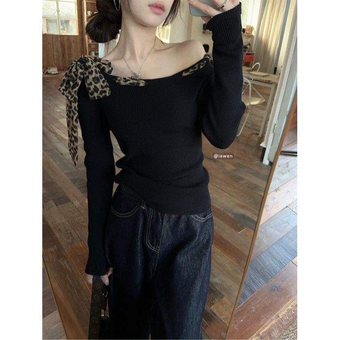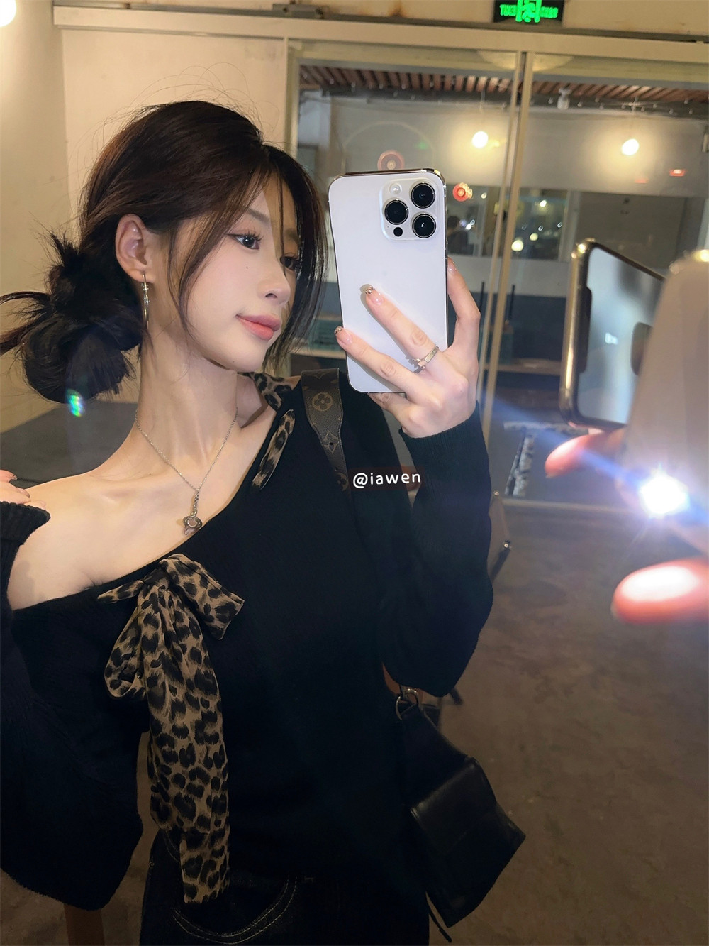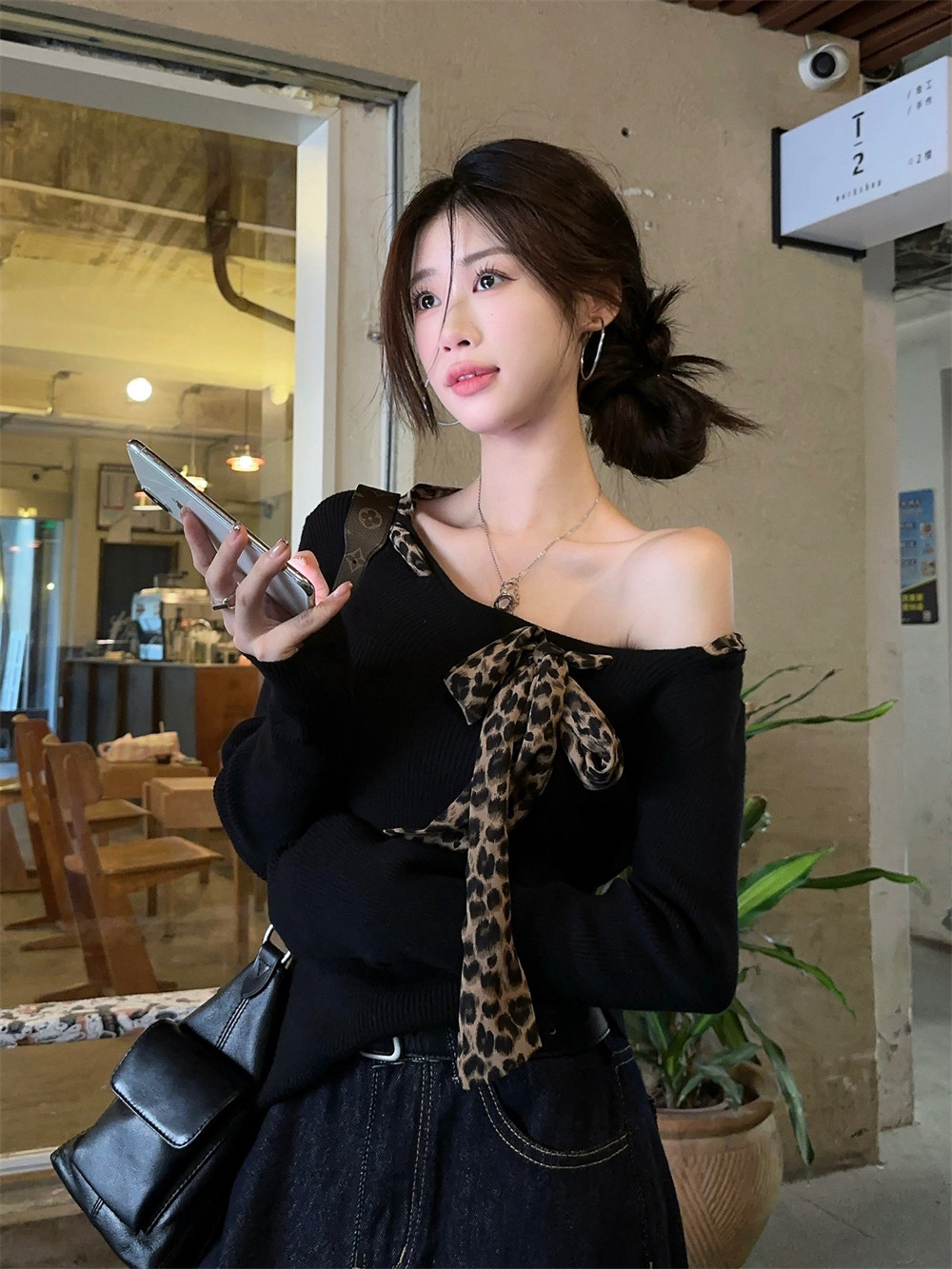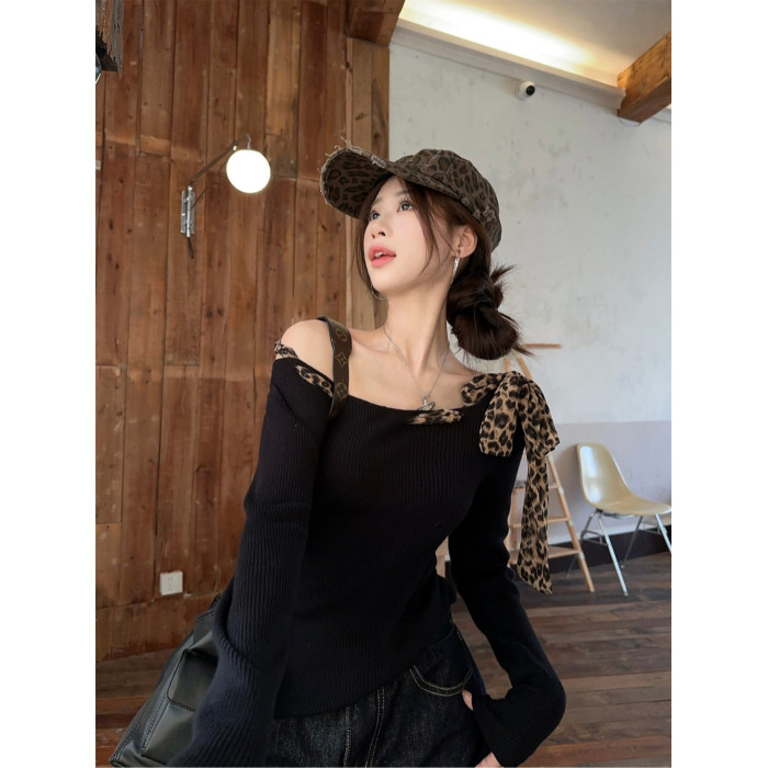 韓系辣妹豹紋斜肩長袖t恤女秋季小衆修身顯瘦別致露肩短款小上衣