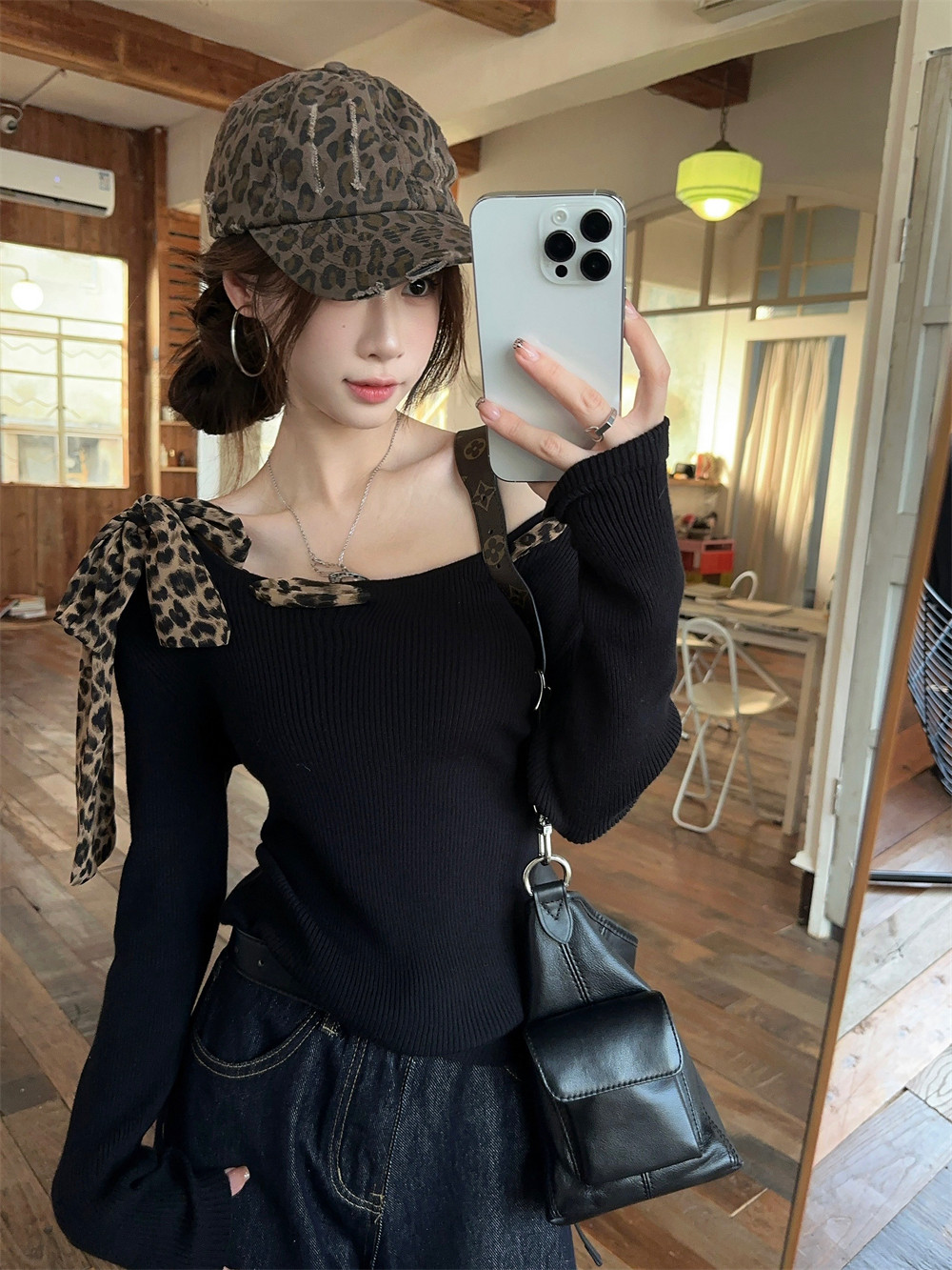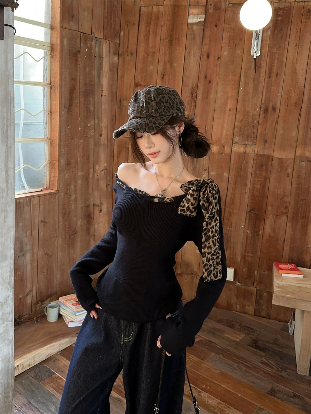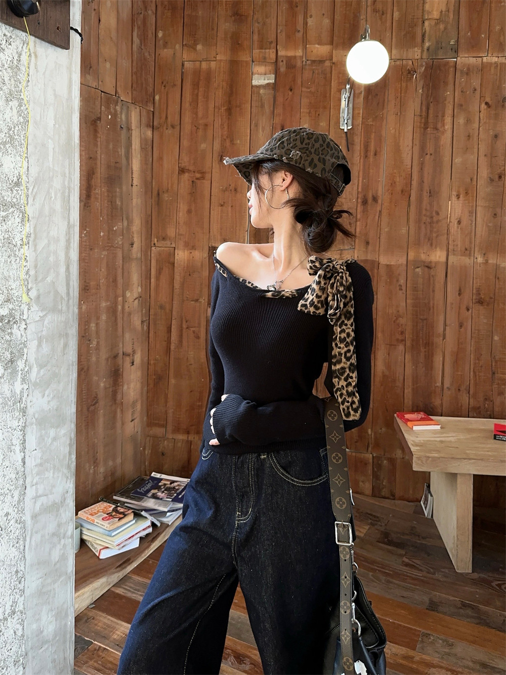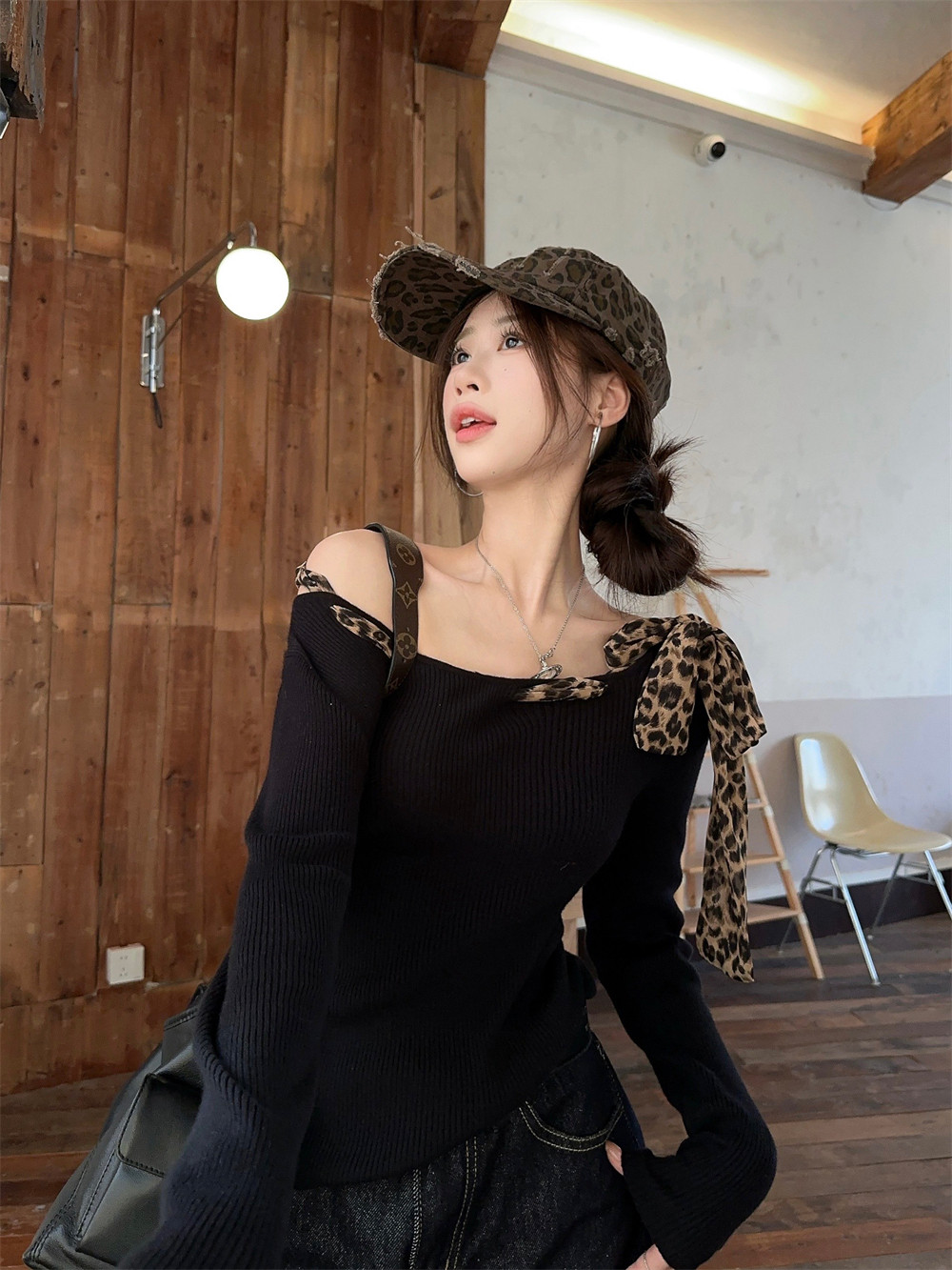 韓系辣妹豹紋斜肩長袖t恤女秋季小衆修身顯瘦別致露肩短款小上衣