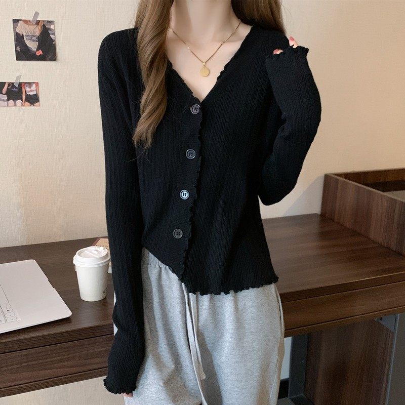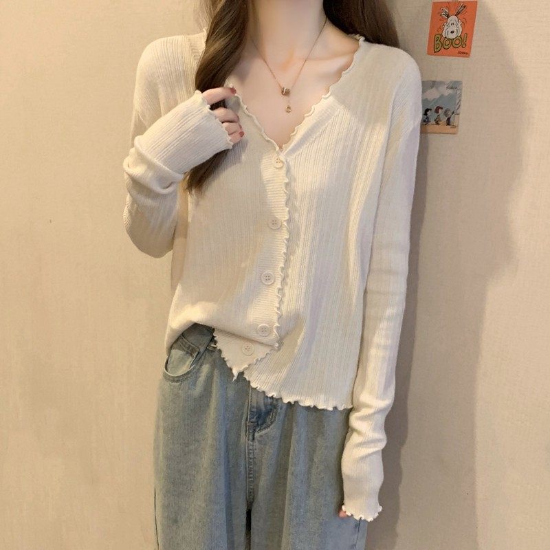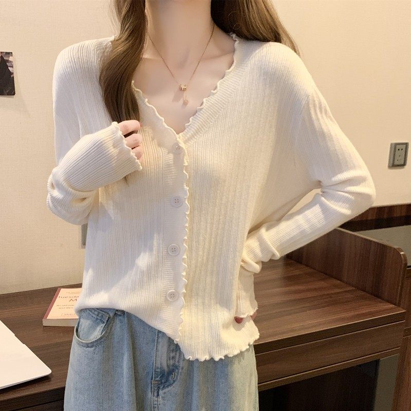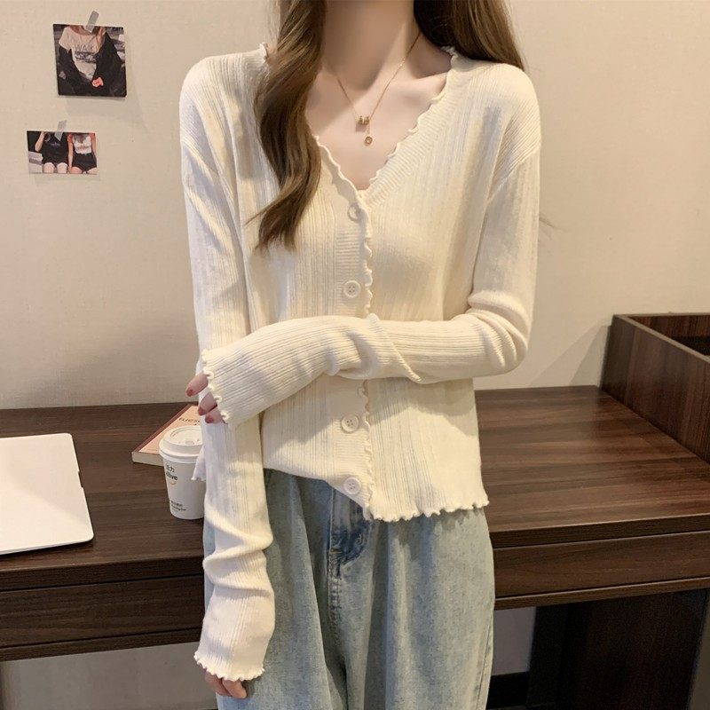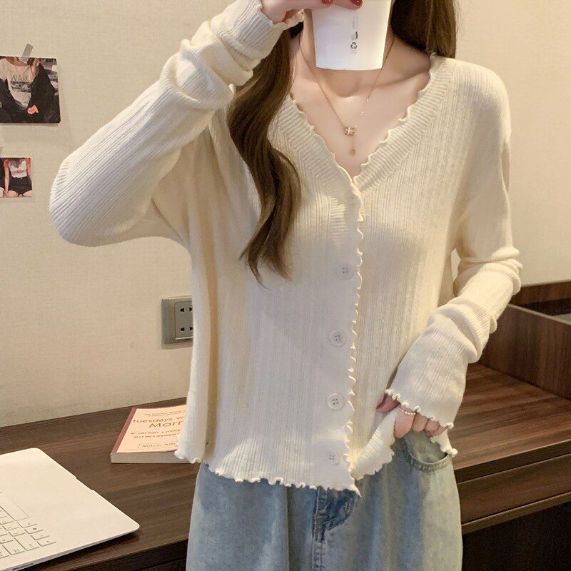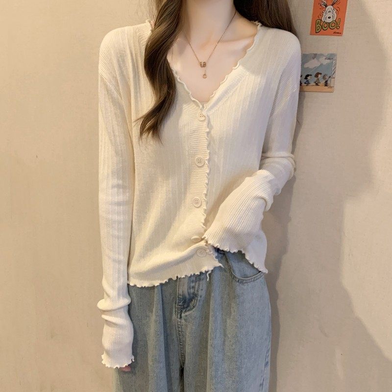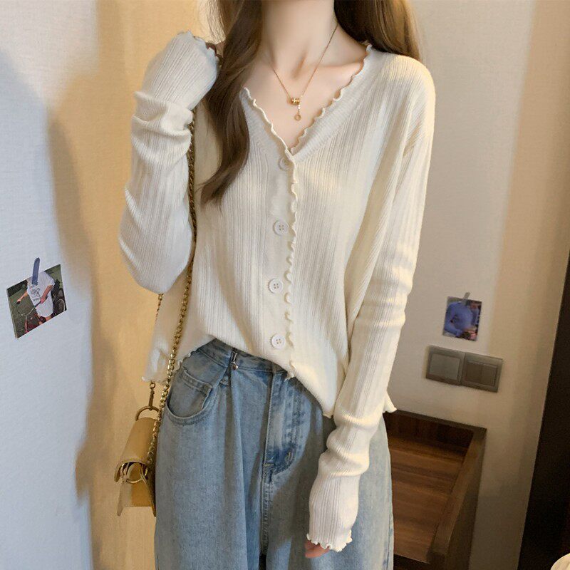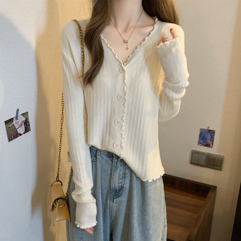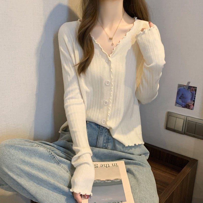 秋季長袖設計感小衆上衣白色木耳邊v領針織開衫毛衣外套打底衫女