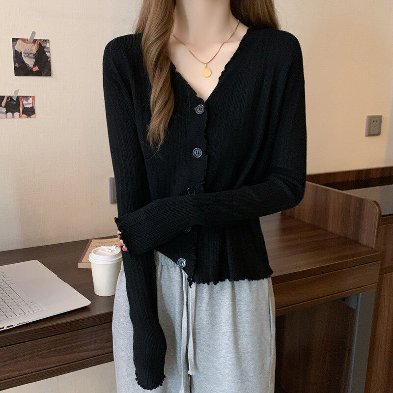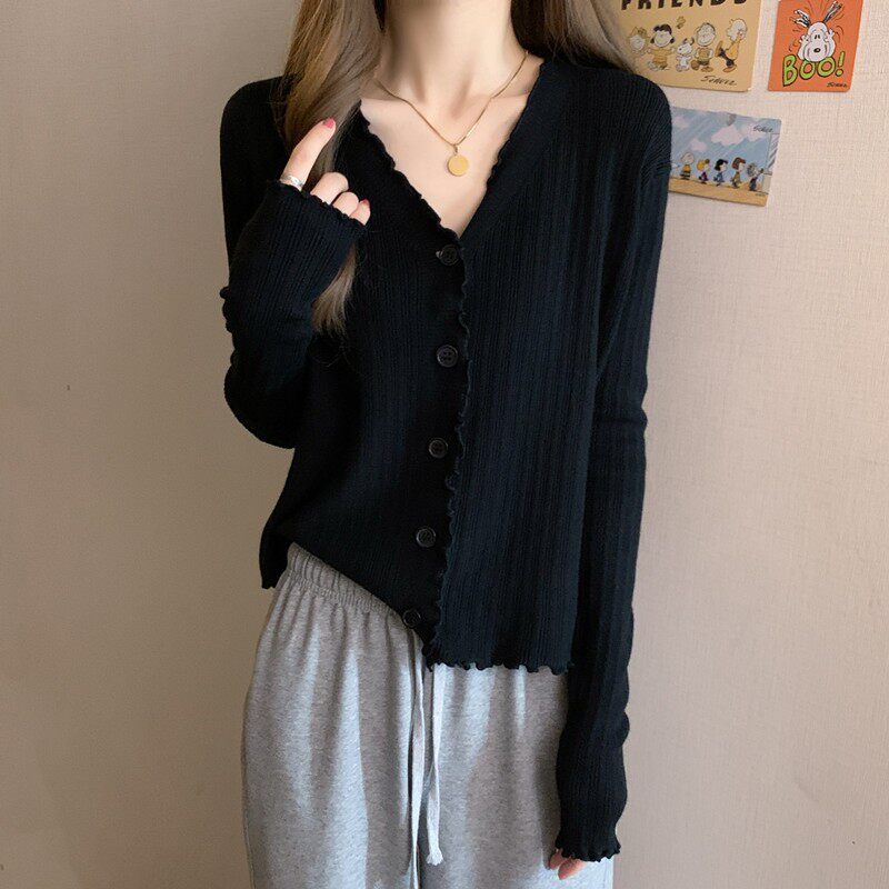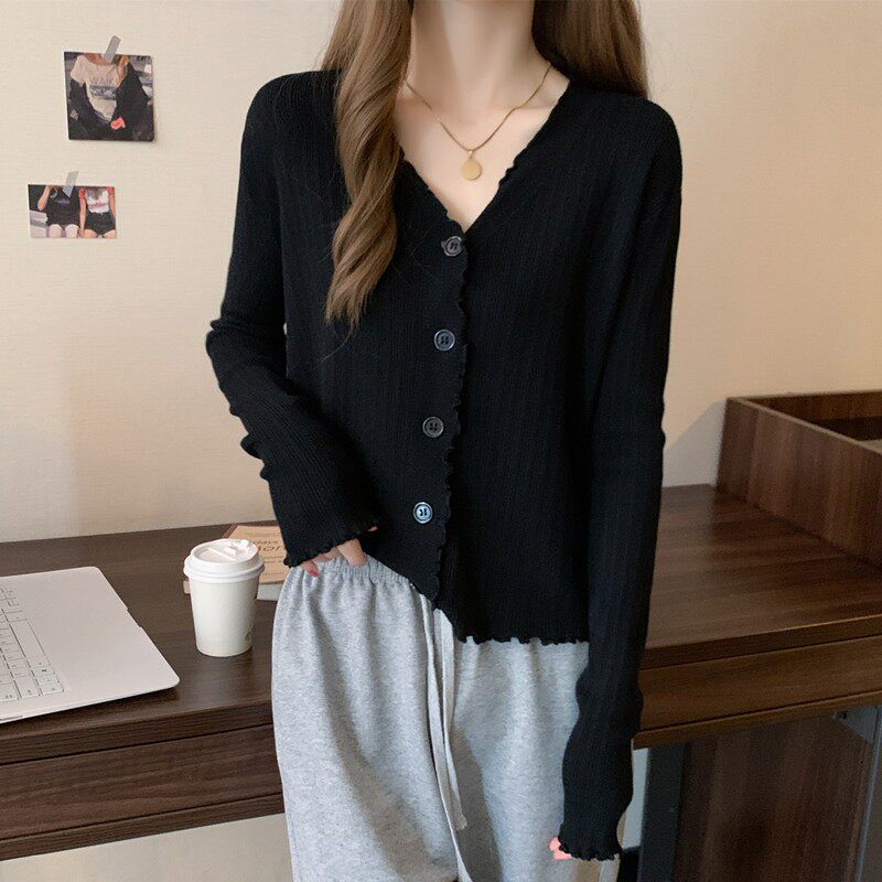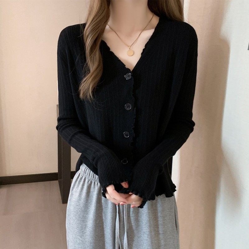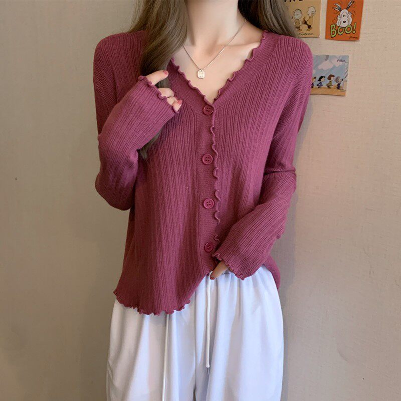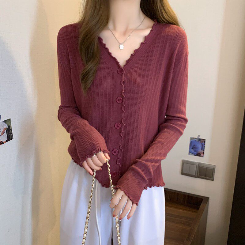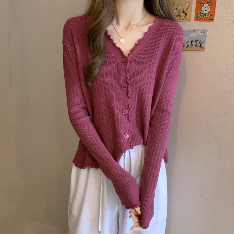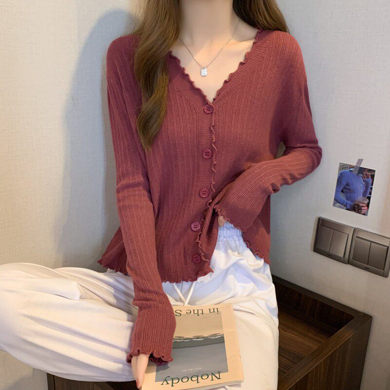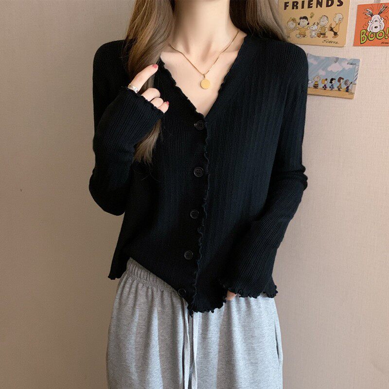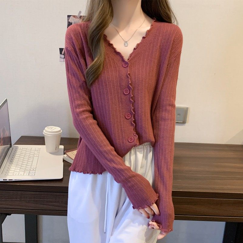 秋季長袖設計感小衆上衣白色木耳邊v領針織開衫毛衣外套打底衫女