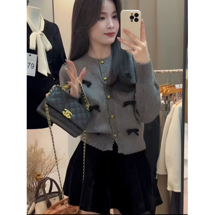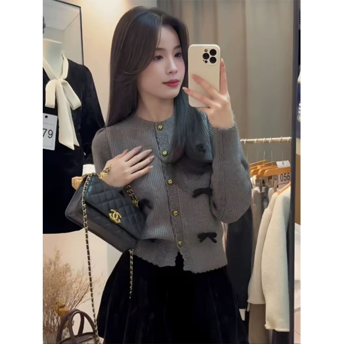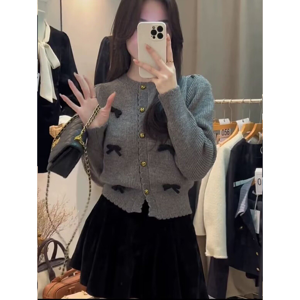 小香風氣質顯瘦蝴蝶結毛衣開衫女冬季新款溫柔風甜美百搭短款上衣
